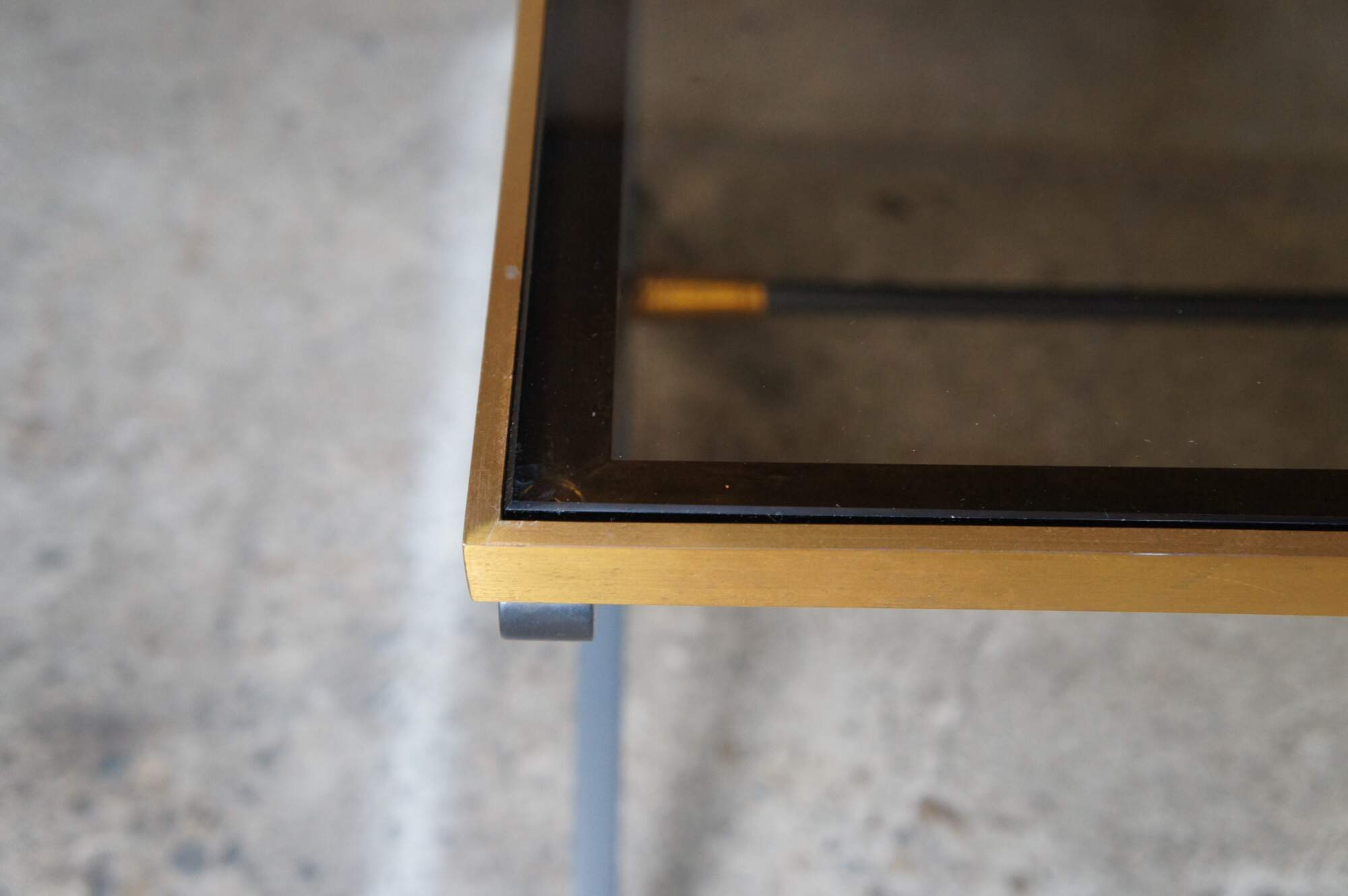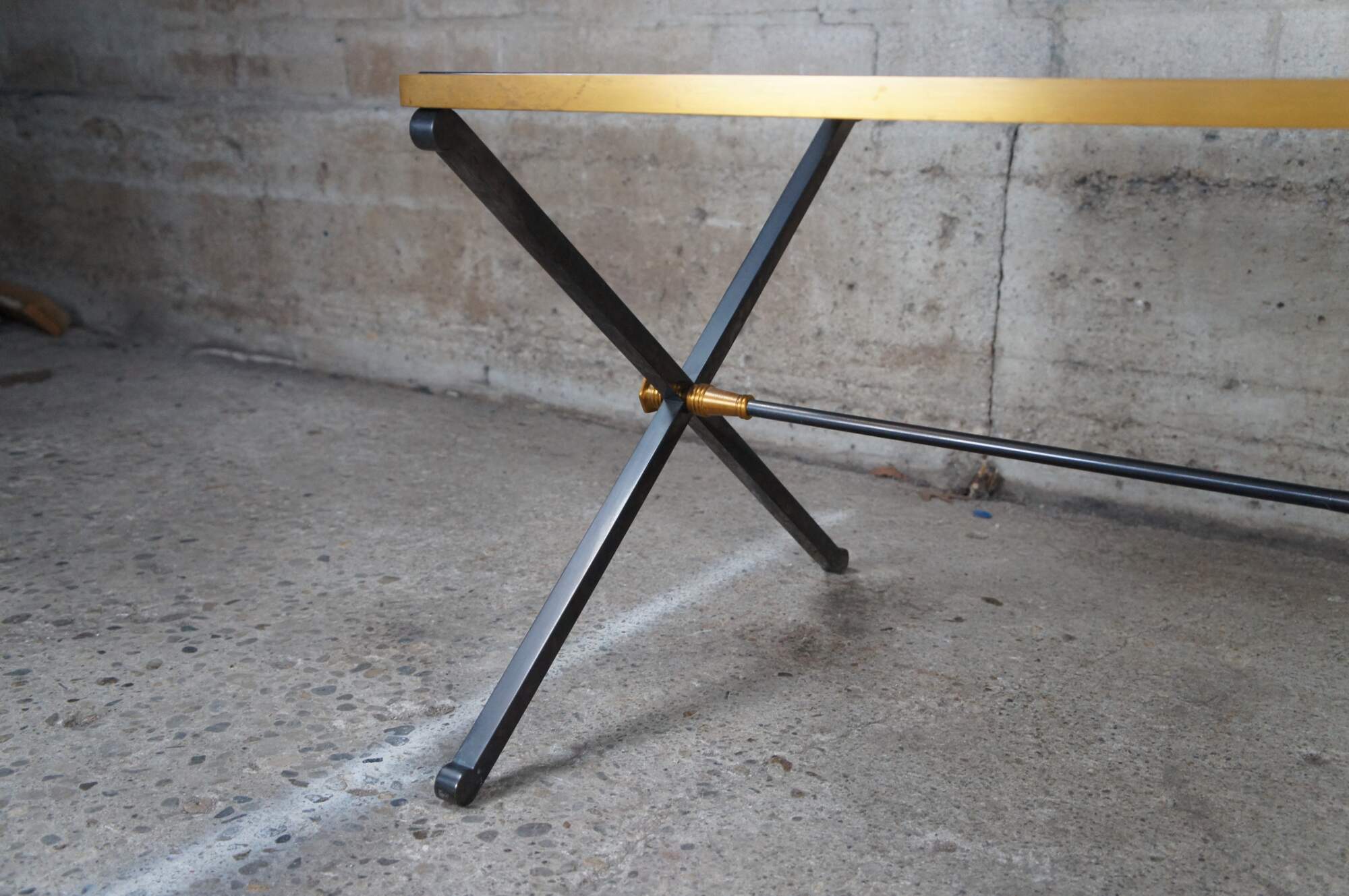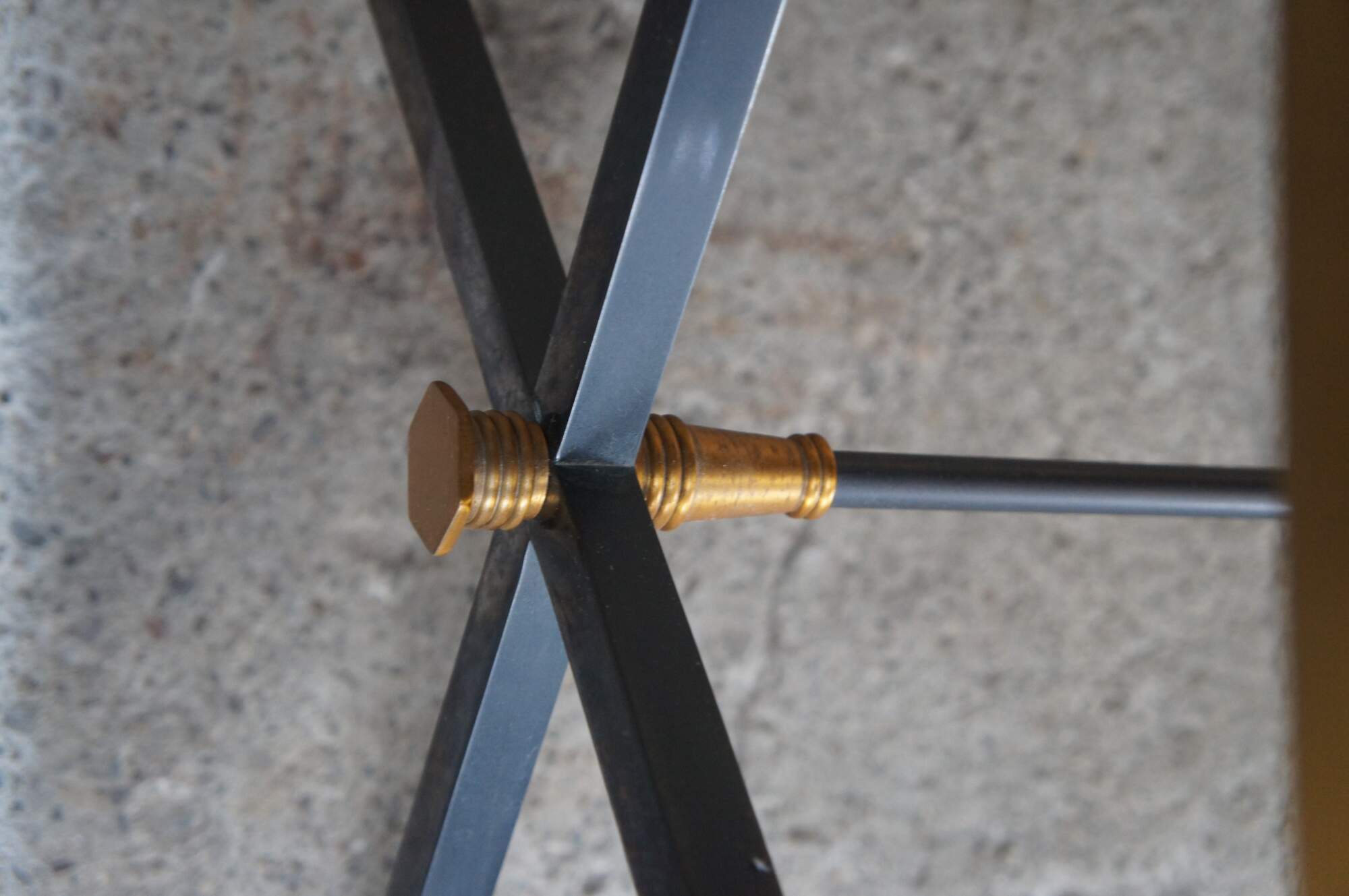 Maison Jansen style modern cocktail table. Made from steel with a black and gold X form base with smoked glass polished edge top. The X frame is connected by cylindrical trestle flared like a trumpet at the center.