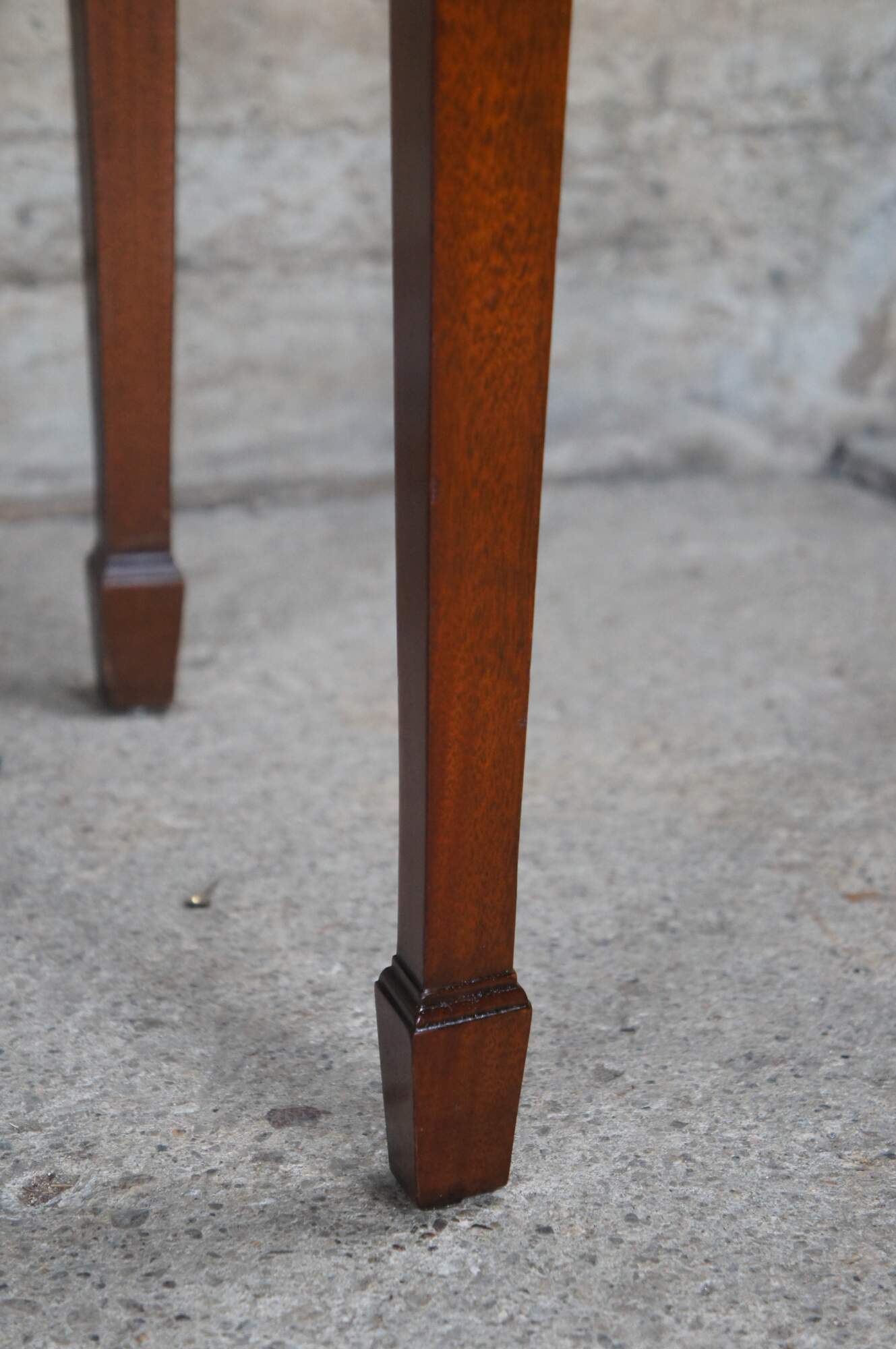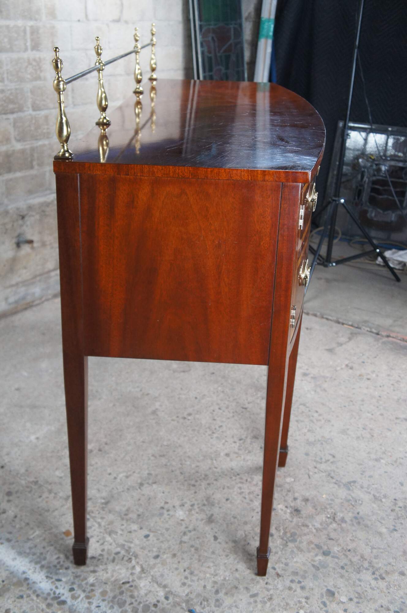 An impressive vintage Kindel Furniture sideboard, circa 1970s. Features a mahogany frame with bowfront, serpentine front, crossbanding, inlay and brass gallery. Includes five dovetailed drawers with oval brass Sheraton / Federal style drawer pulls. The sideboard is supported by square tapered legs leading to spade feet. Marked along inside of the center drawer