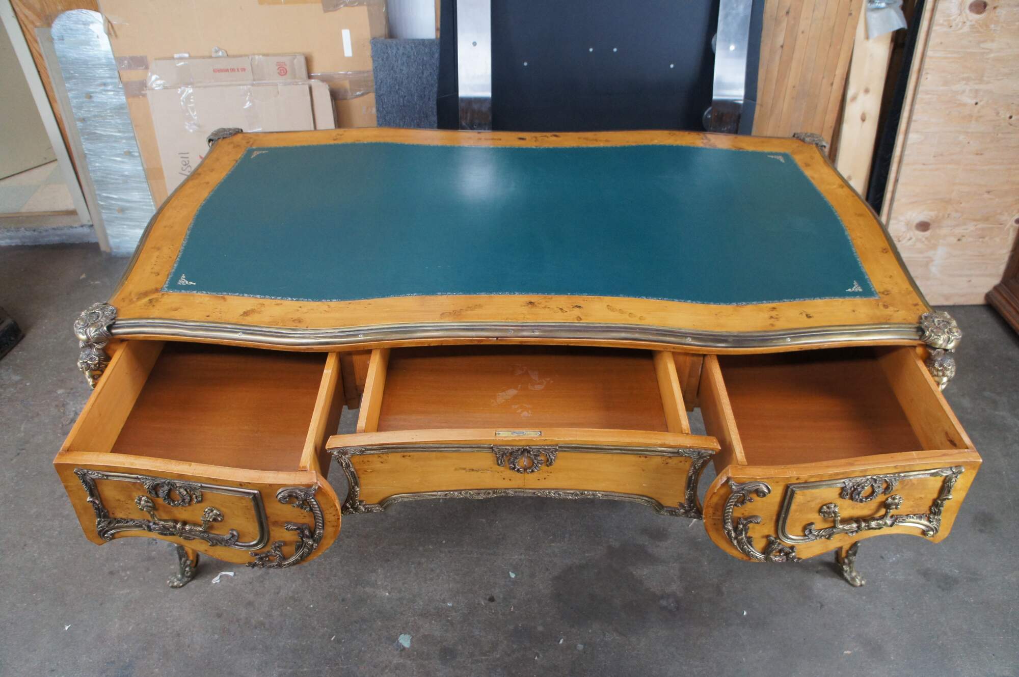 Monumental Louis XV / Napoleon III style office desk. A serpentine form made from birdseye maple with three large dovetailed drawers in the frieze and long tapered cabriole legs. Features an inset tooled green leather top and ornate neoclassical bronze mounts. The knees showcase robust figural ormolu mounts leading to ornate bronze capped feet.