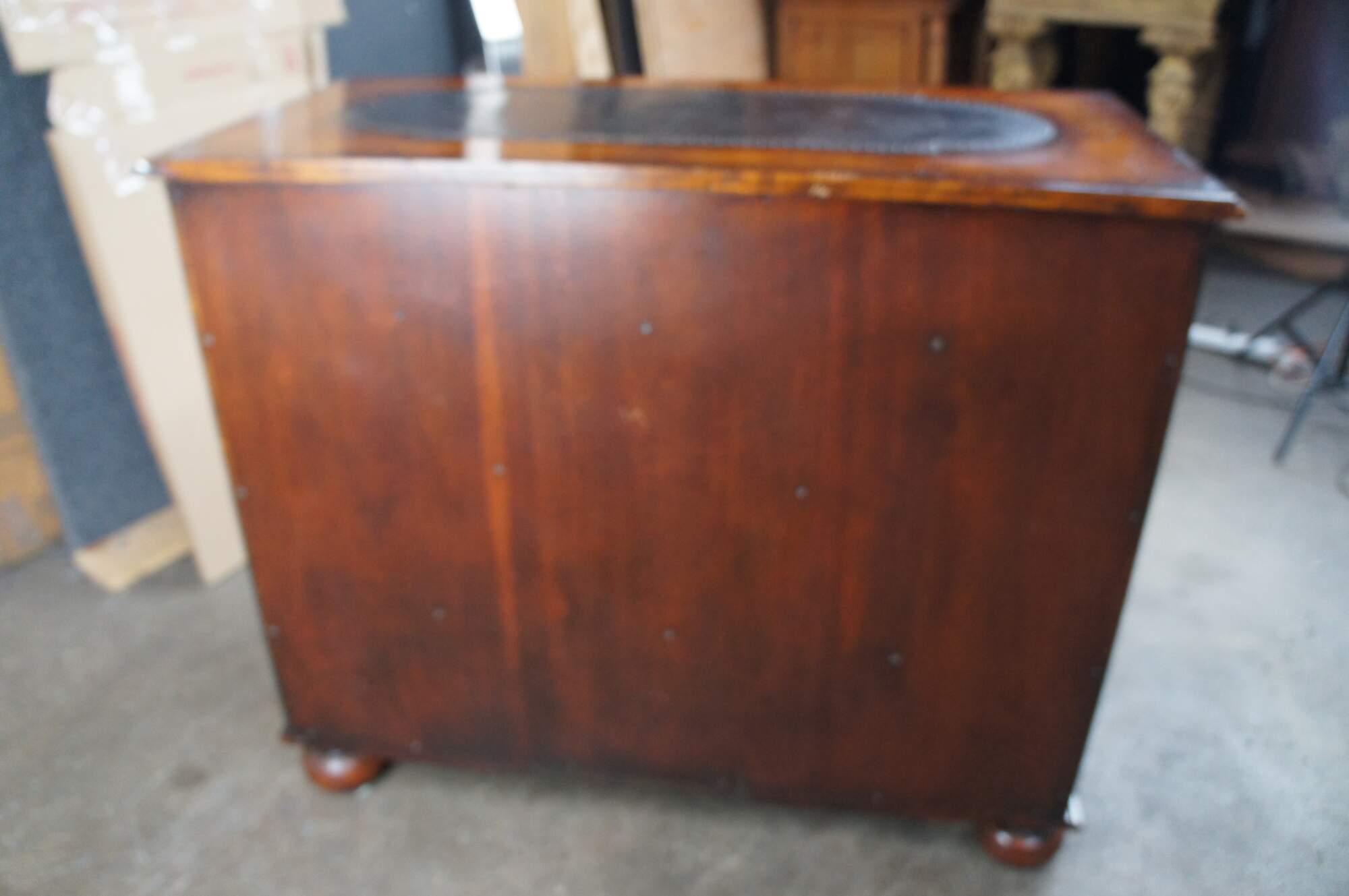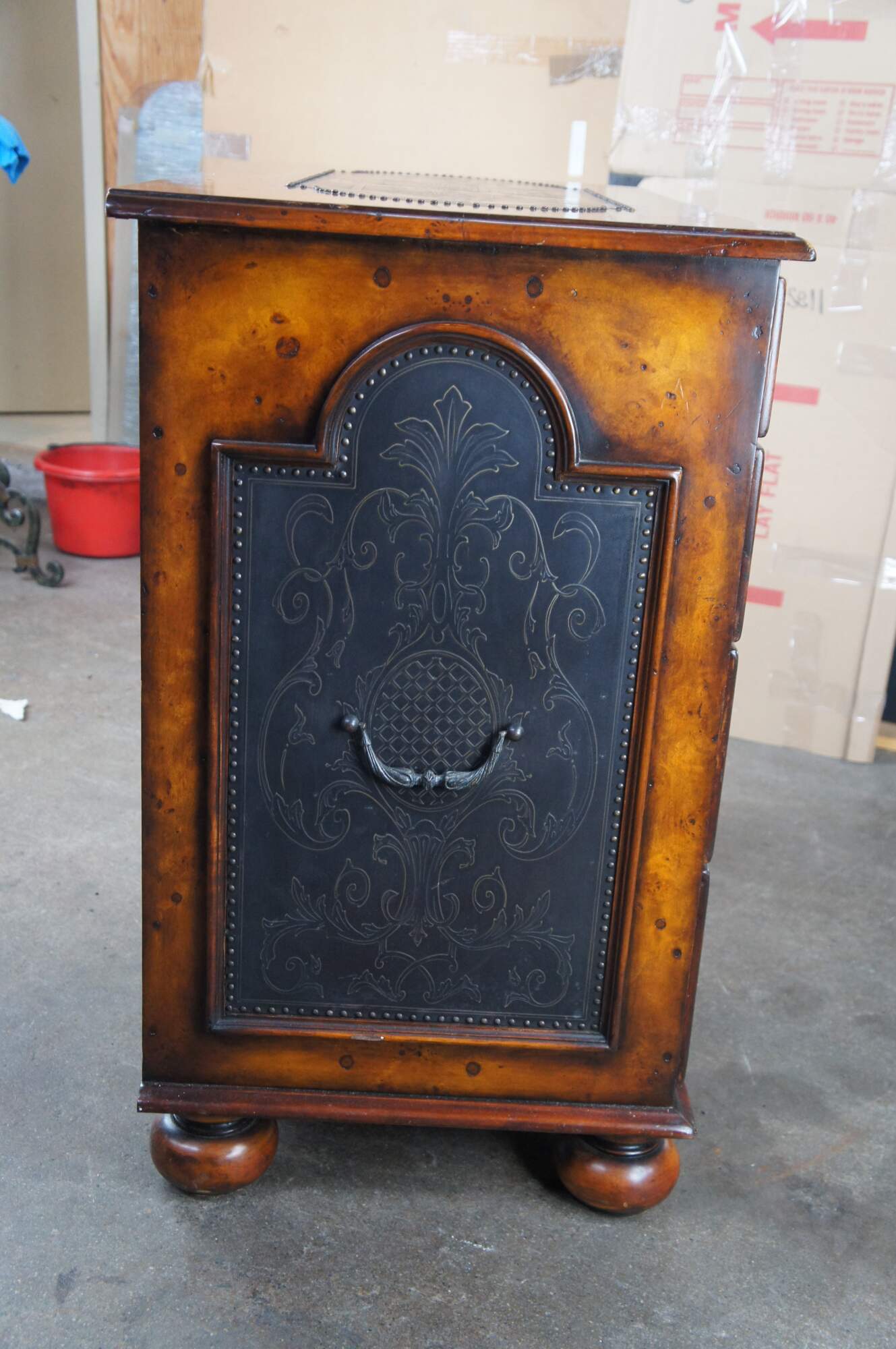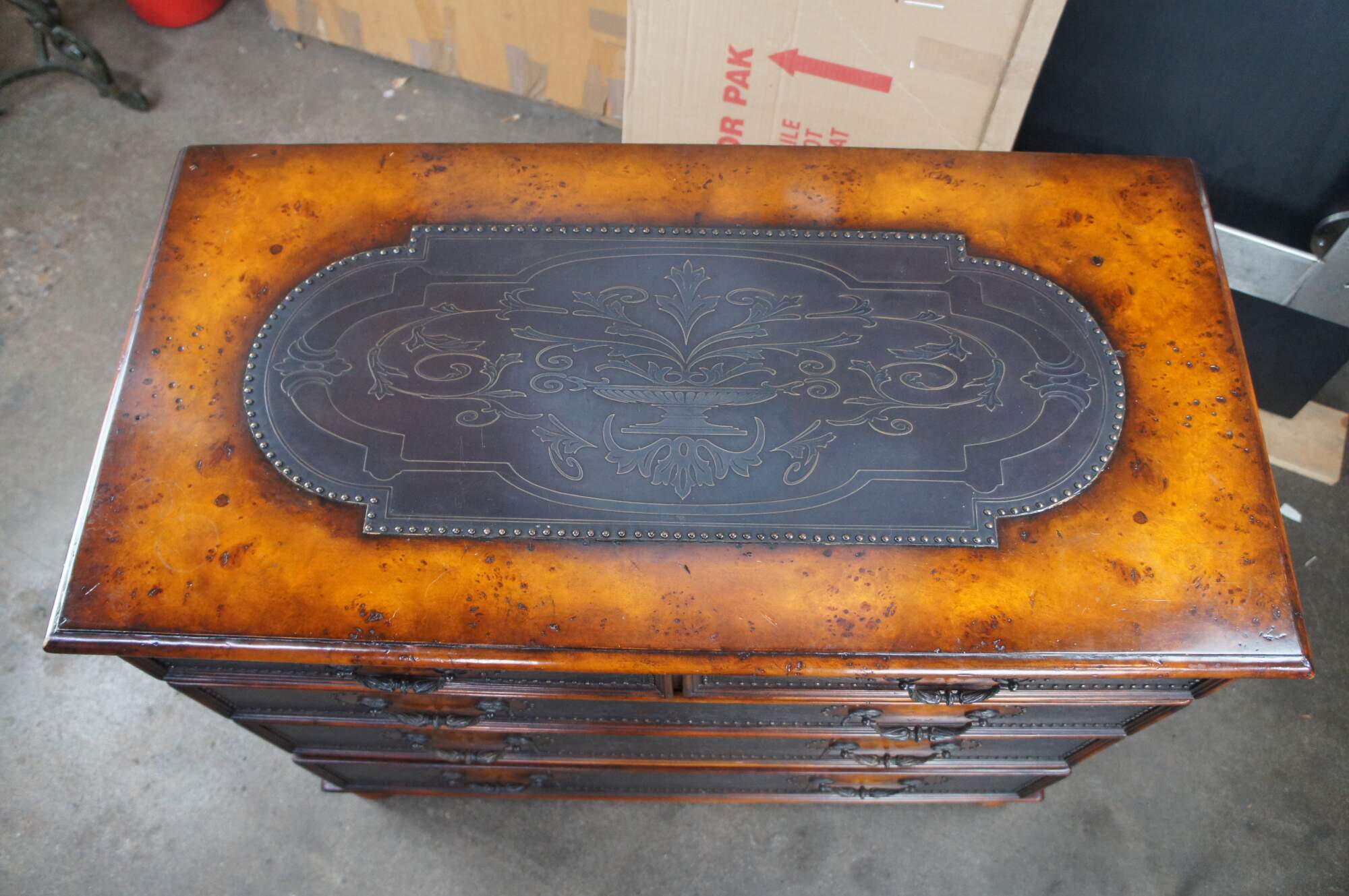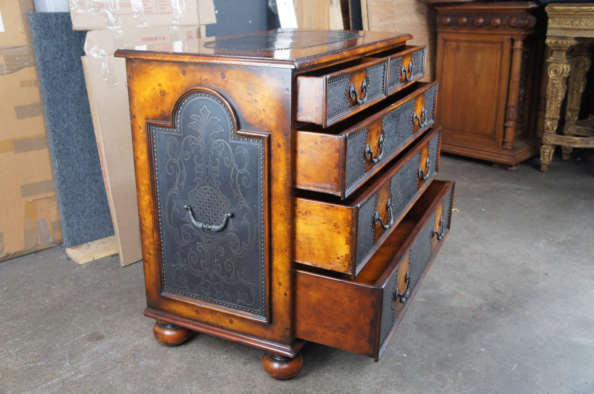 Theodore Alexander Armoury Collection Chest of Drawers. A modern take on 18th Century William and Mary styling. Made from Burr Walnut with etched brass panels and nailhead trim. Features 2 over 3 dovetailed drawer format and robust bun feet. A stately addition to any space.