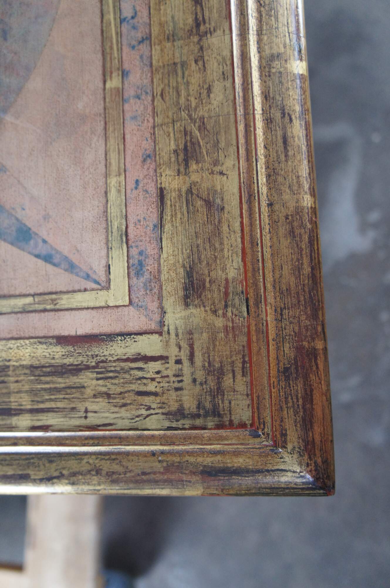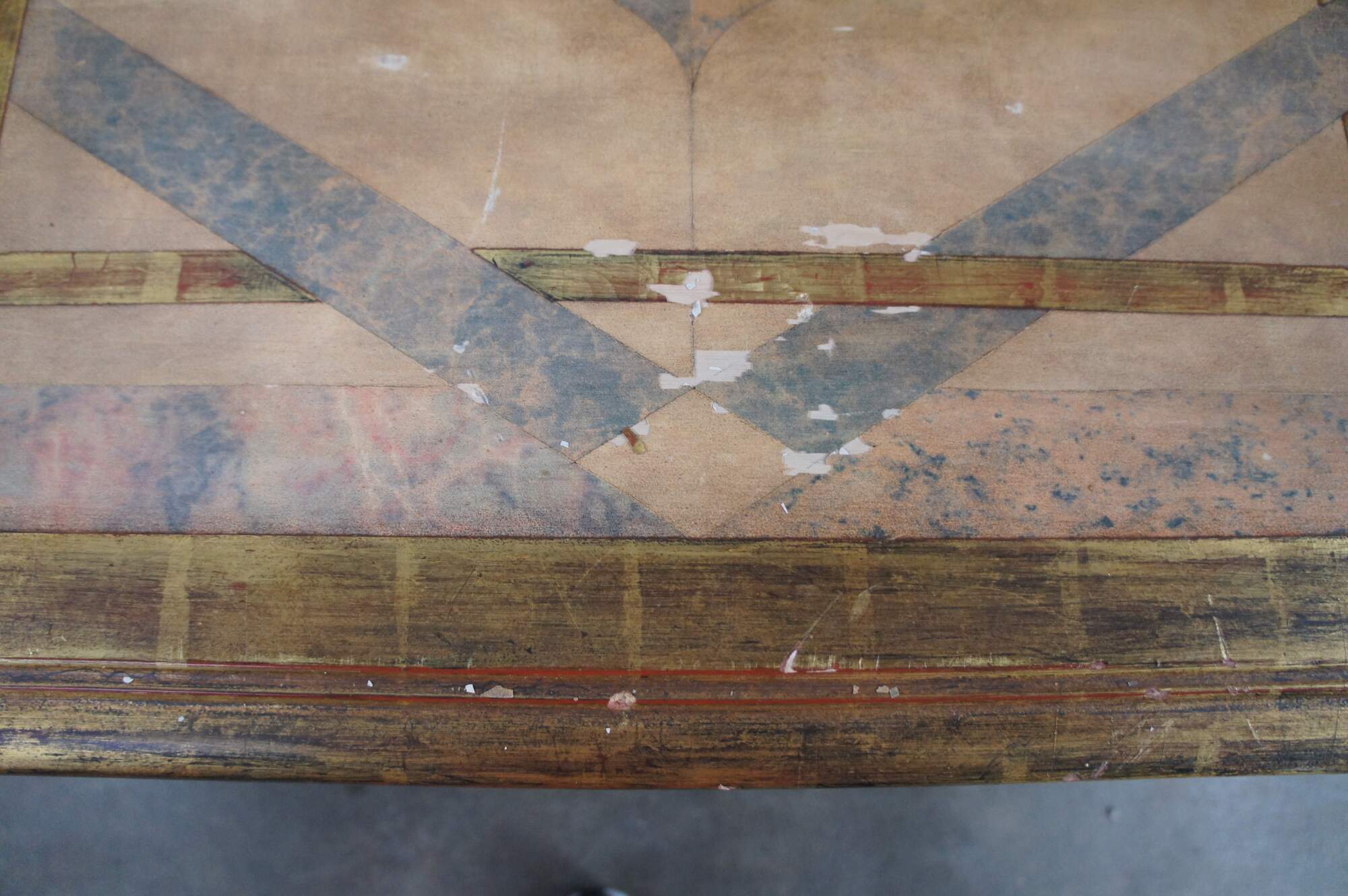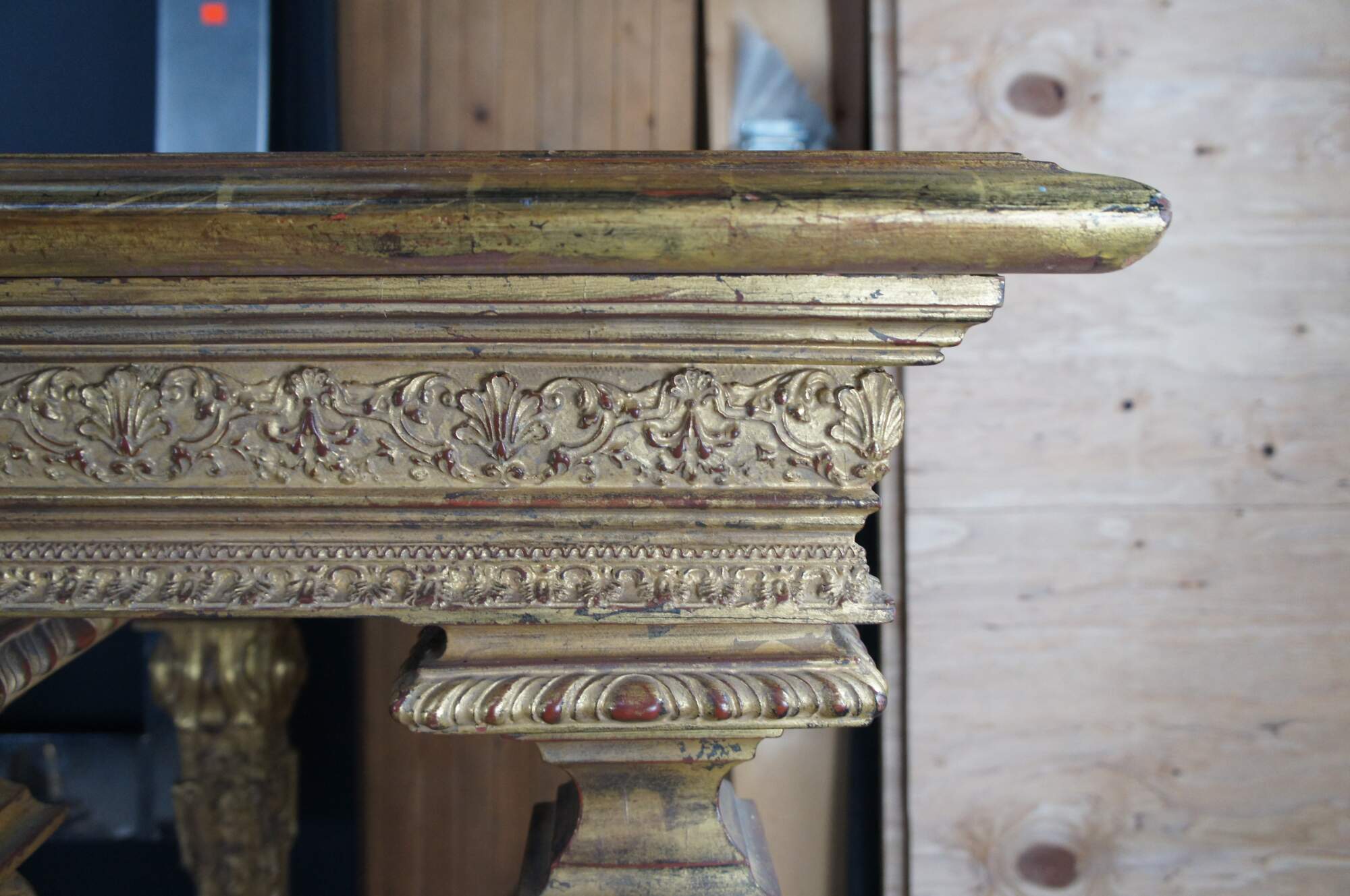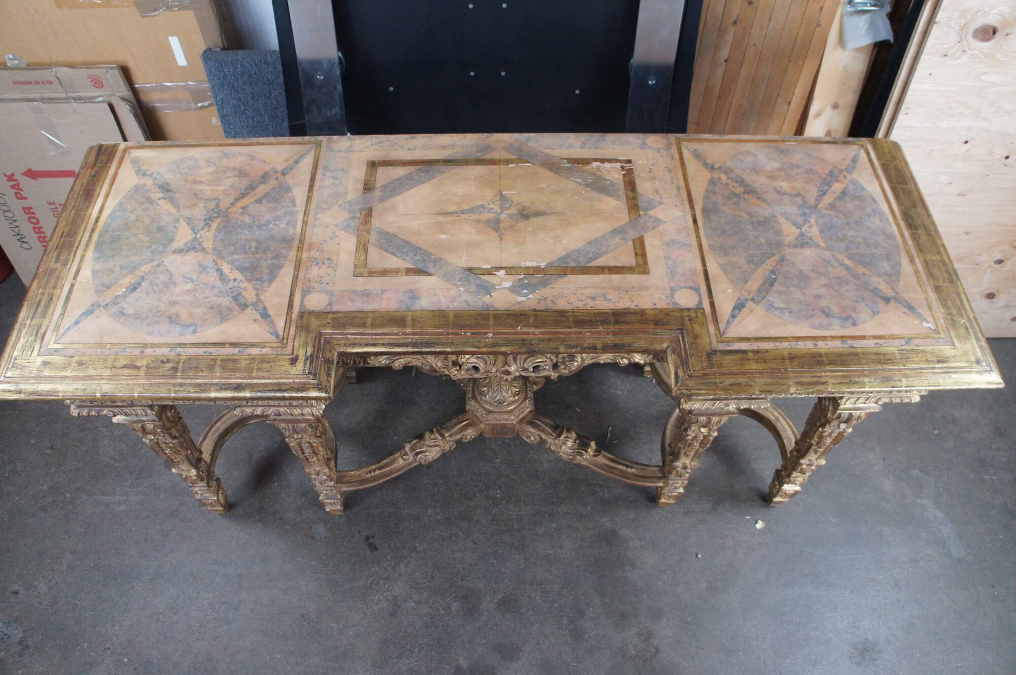A monumental Italian Louis XIV style "Belle Epoque" giltwood console table. Belle Epoque (The Age of Excellence) takes inspiration from the very beginning of the French Golden Age of furniture in the 18th Century. The period itself began in France, mid-19th century, then spread to England, the continent and finally, to America. It ended in the early 1910s. This beautiful example features an ornate giltwood frame decorated with a scalloped center, intricate foliate motif, gadrooning and fanciful aprons. The top showcases a marbled painted geometric design. Long Legs are square tapered with scrolled design element over embellishments, acanthus flare, foliate and medallions. The four legs are connected on each side from front to back with an x-form stretcher, and joined at the center by an ornately scrolled stretcher leading to central acanthus finial. A true work of art.