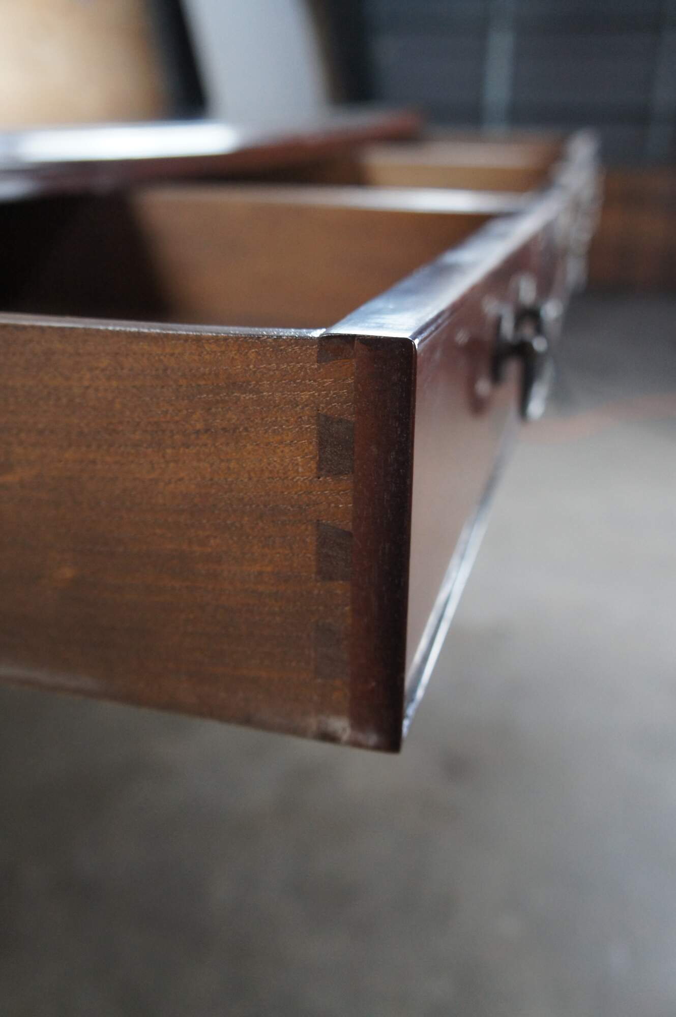Mid 20th Century Arthur Brett & Sons Executive Desk. A rectangular form made from mahogany with tooled leather top. Features three large dovetailed drawers within the frieze. Each drawer has brass bale hardware. The desk is supported by fluted Marlborough legs chamfered at the rear leading to block feet.