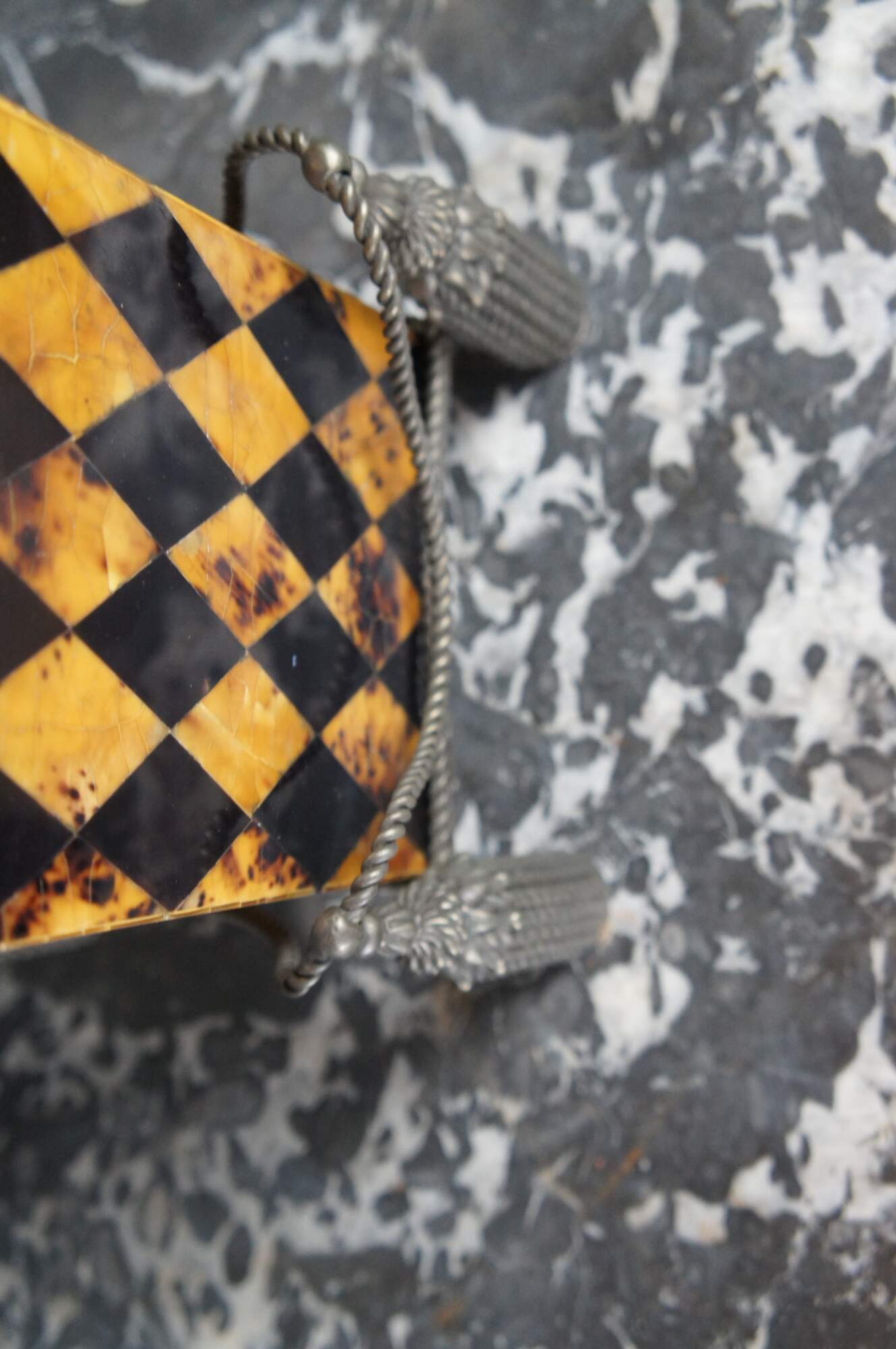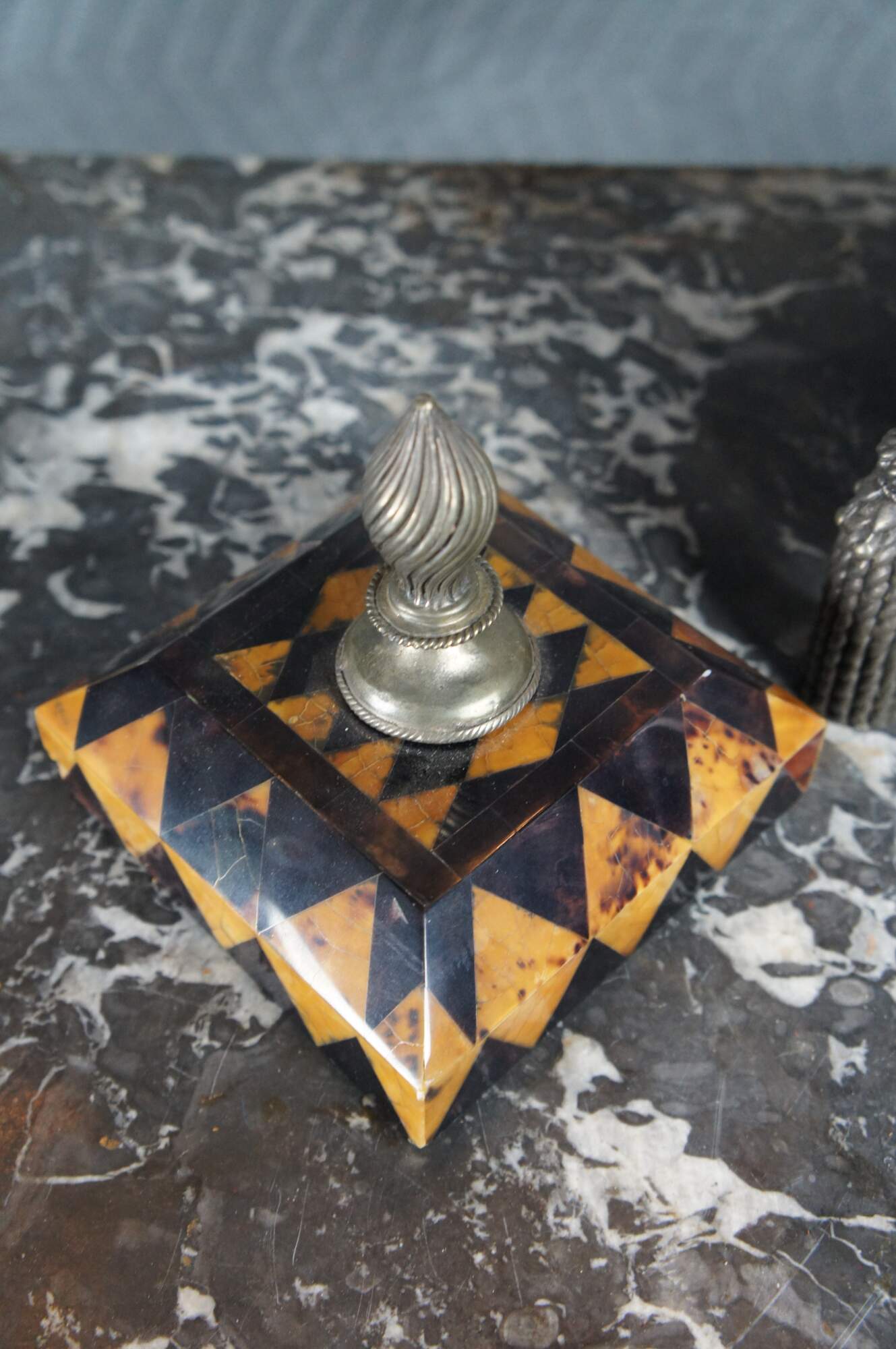 Late 20th Century Maitland Smith Lidded Box / Urn. Features a beautiful Harlequin pattern Penshell exterior resting on a footed brass neoclassical style tasseled base. The lid opens via a trophy shaped finial to a velvet lined interior.