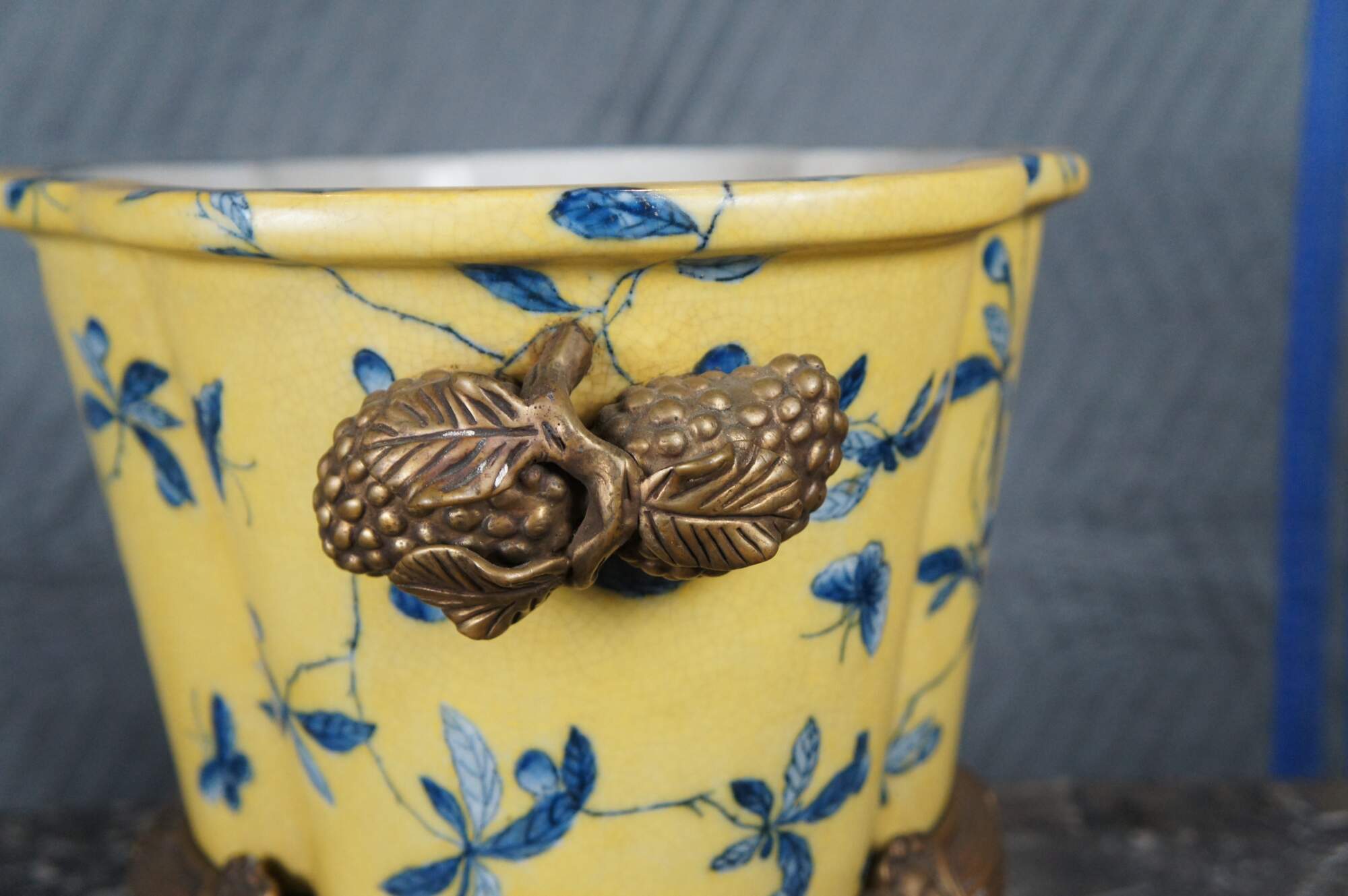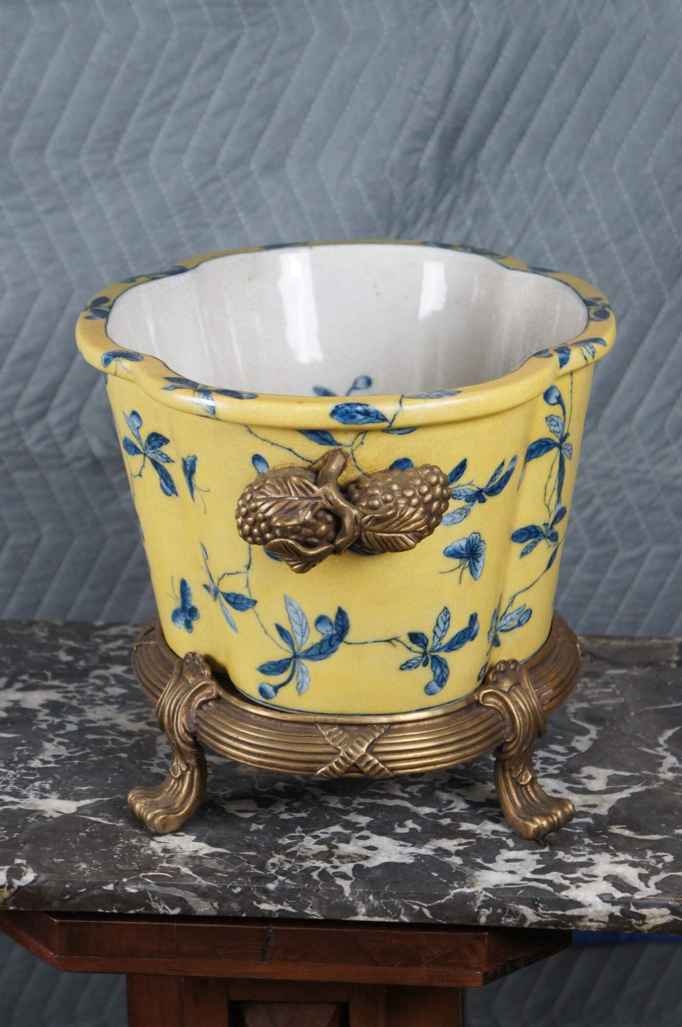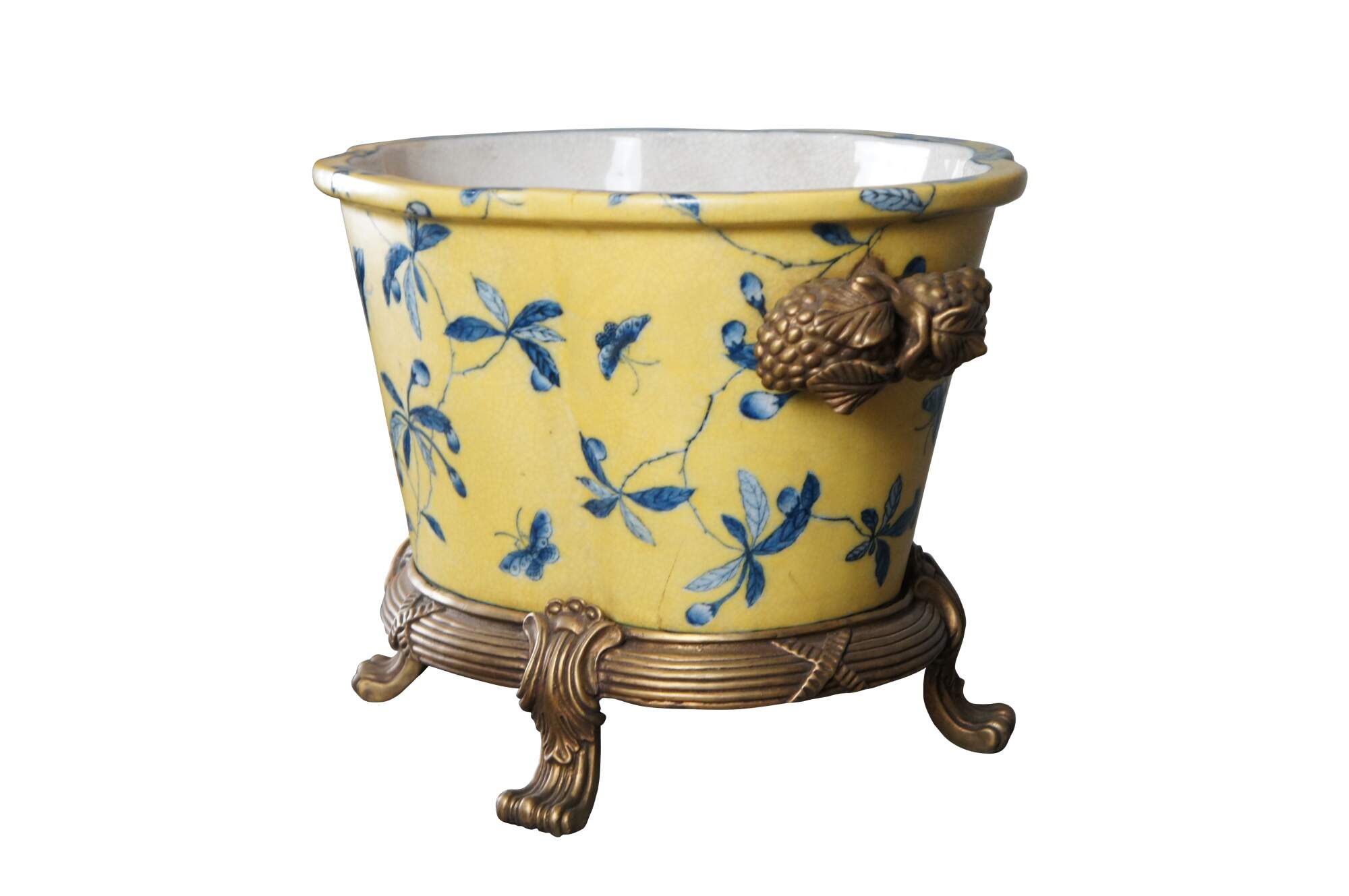 A lovely 20th Century Chinoiserie cachepot by United Wilson (JUWC). Features a lobed porcelain body in yellow with blueberry shrub and butterfly motif. The planter rests on a French inspired bronze base with contoured feet. Handles are high relief bronze blueberry shrubbed. Makers mark along underside of pot.