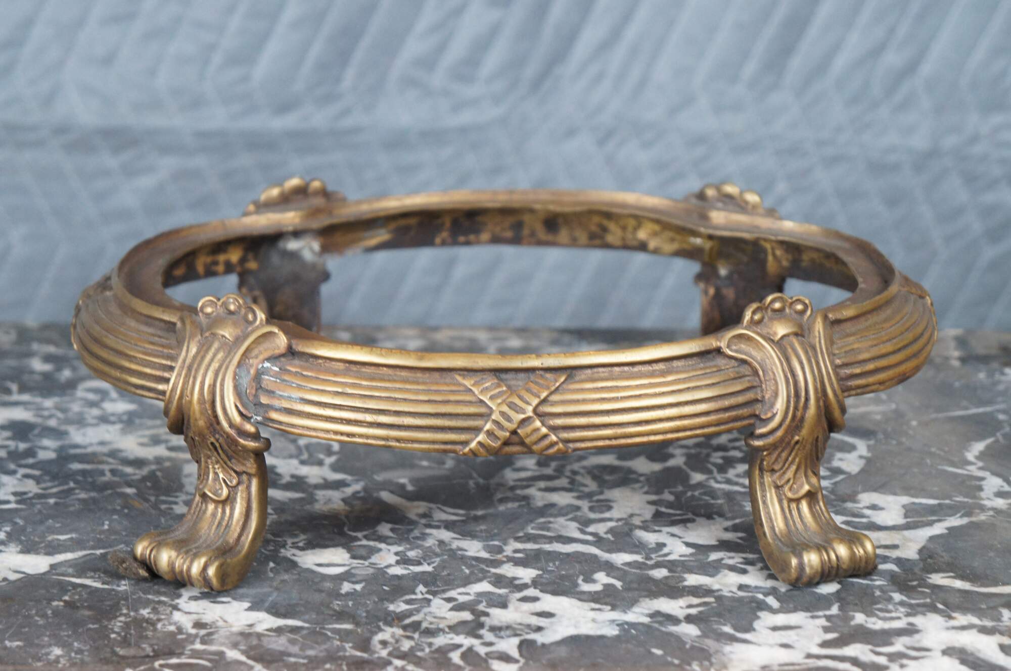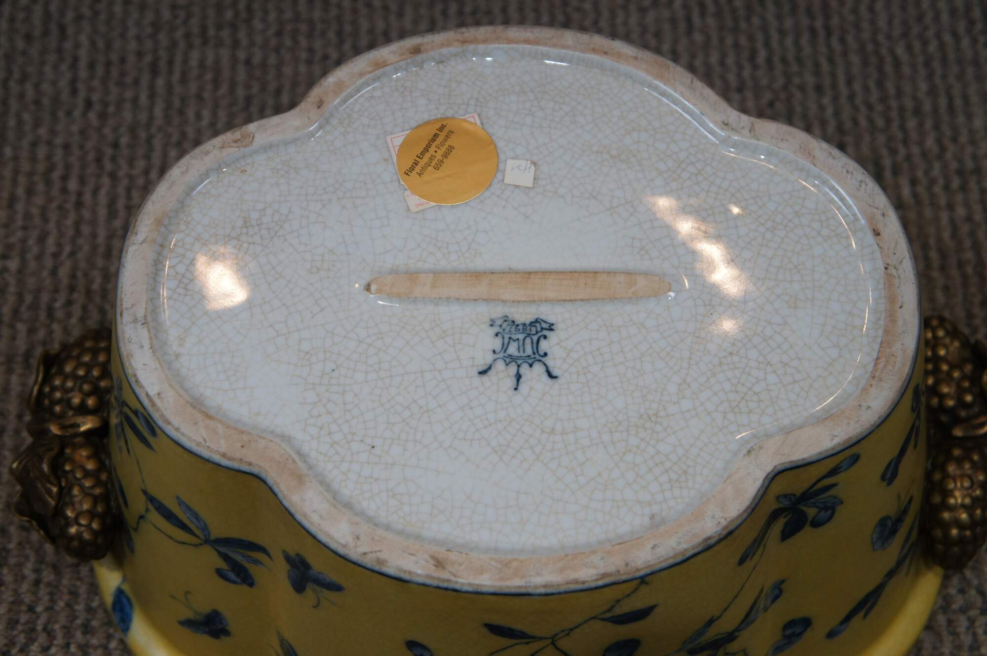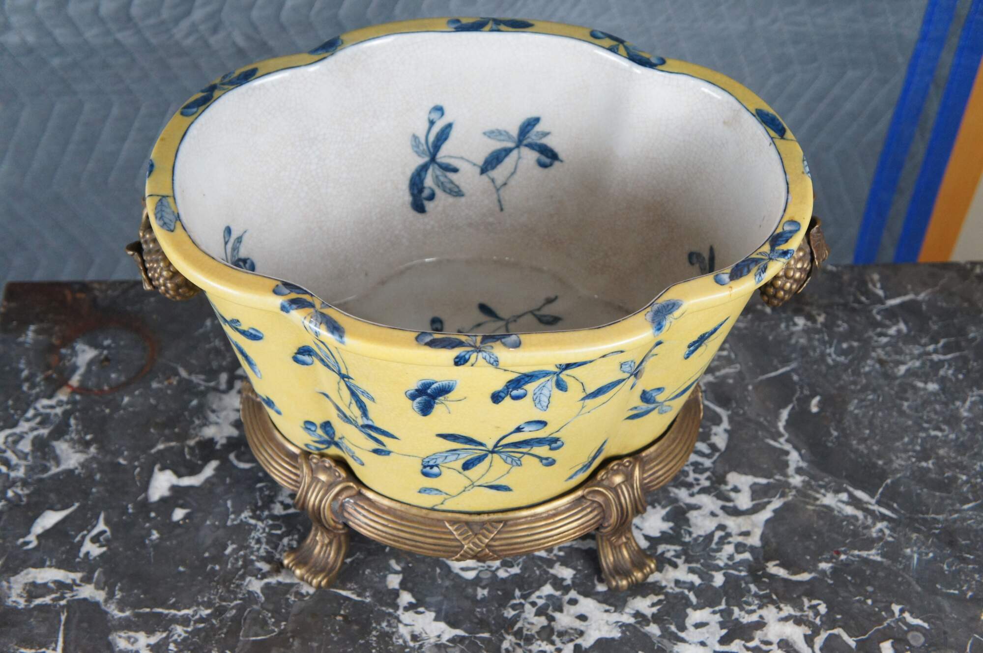 A lovely 20th Century Chinoiserie cachepot by United Wilson (JUWC). Features a lobed porcelain body in yellow with blueberry shrub and butterfly motif. The planter rests on a French inspired bronze base with contoured feet. Handles are high relief bronze blueberry shrubbed. Makers mark along underside of pot.