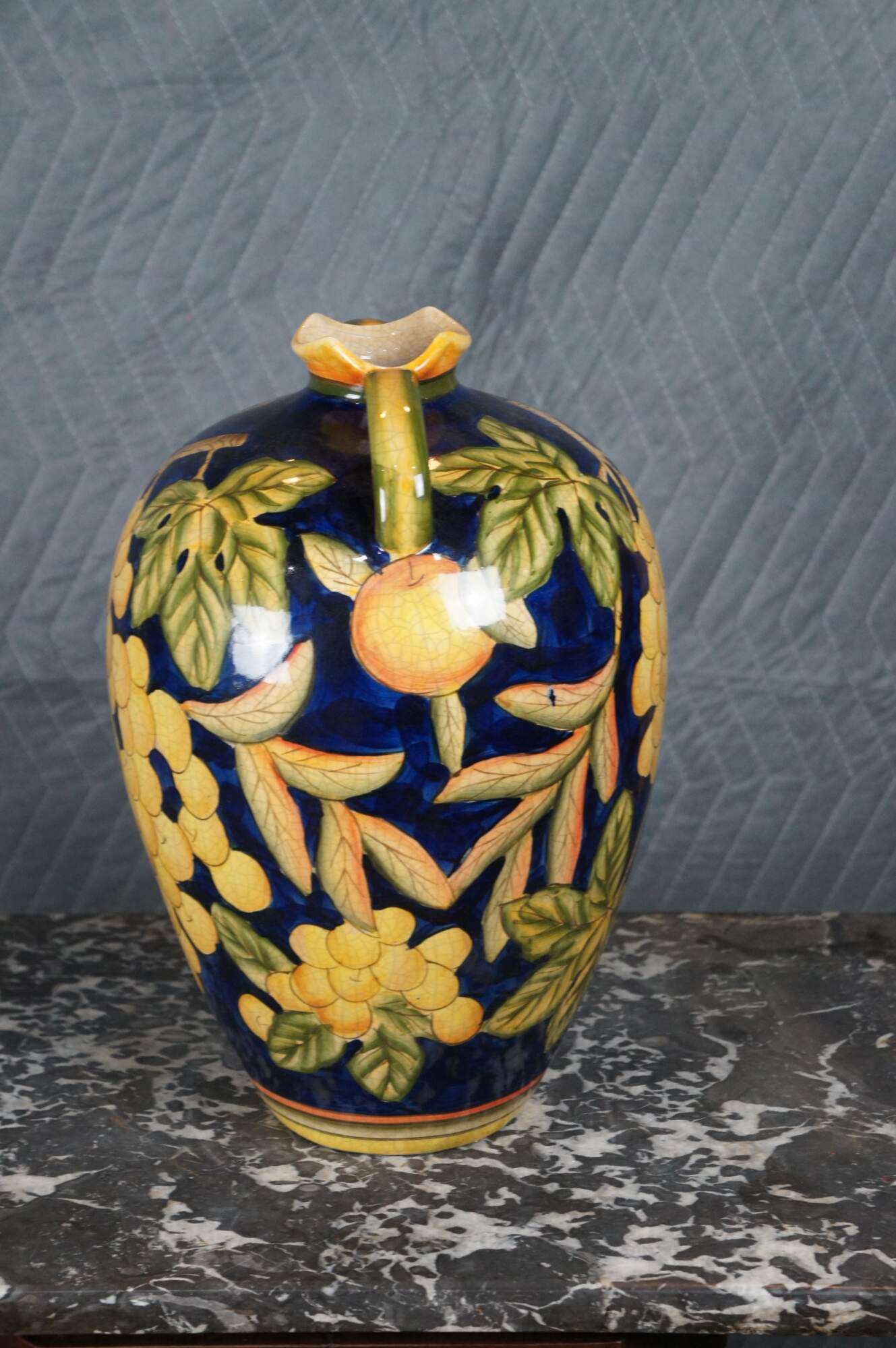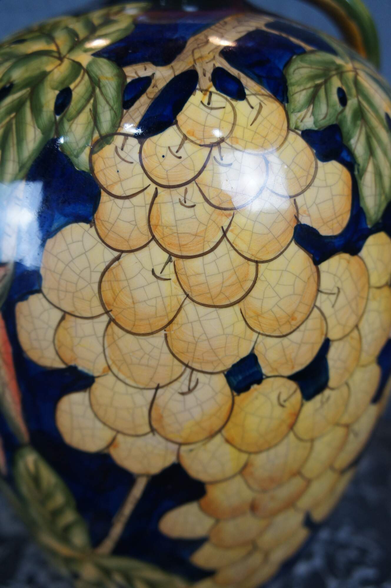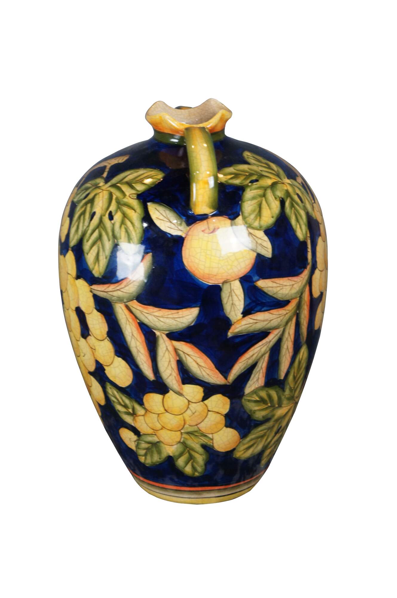 Late 20th century Italian porcelain polychrome handled wine jug. Features a grapevine motif in yellow, blue and green.