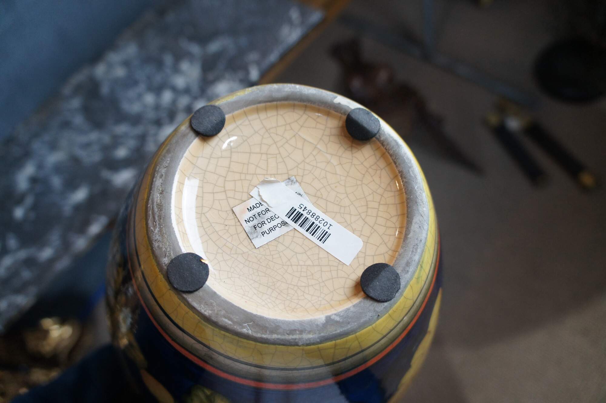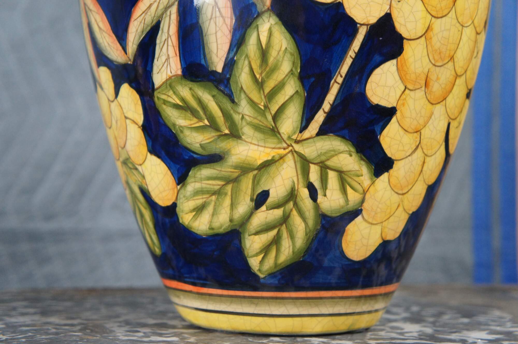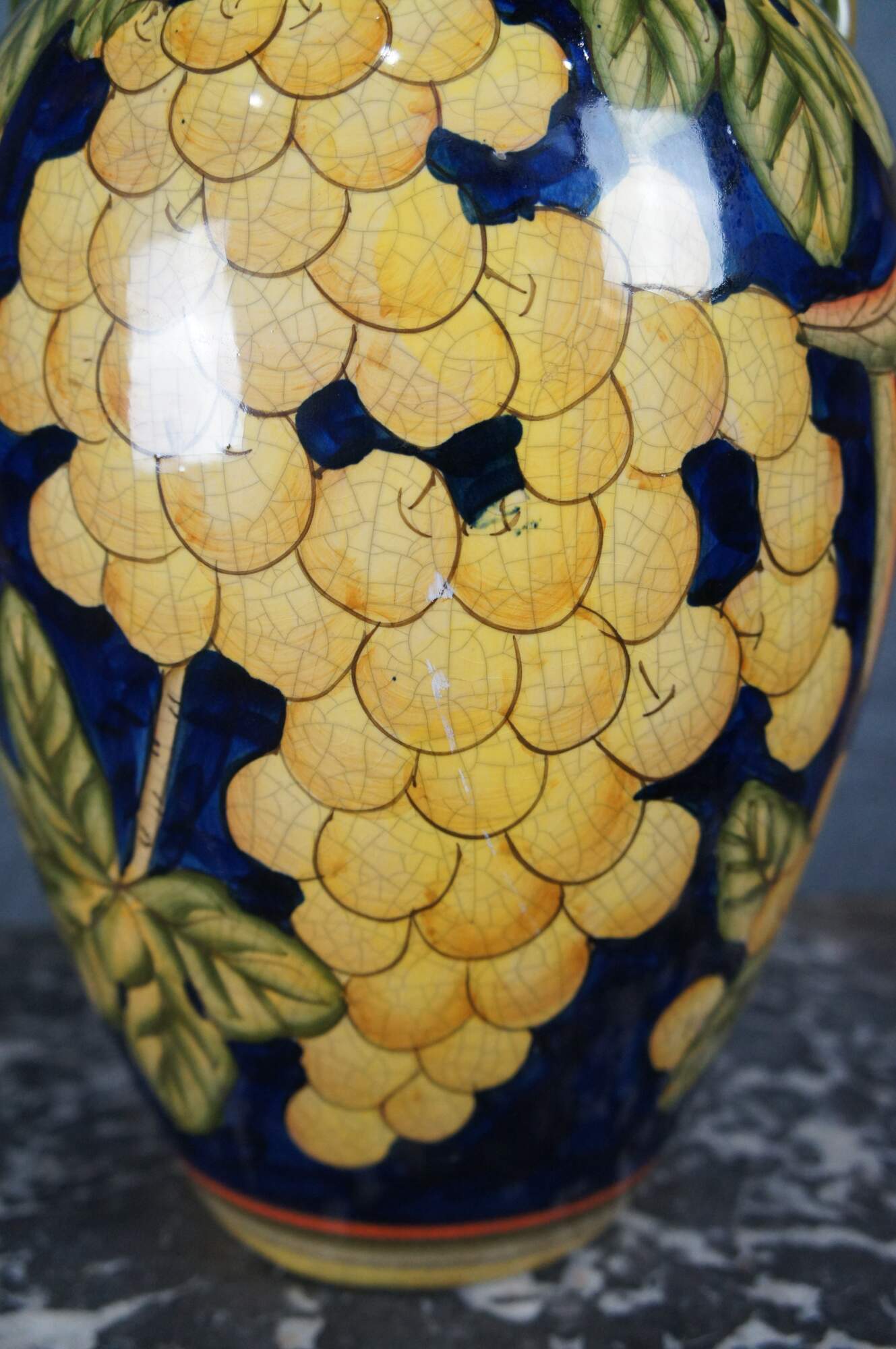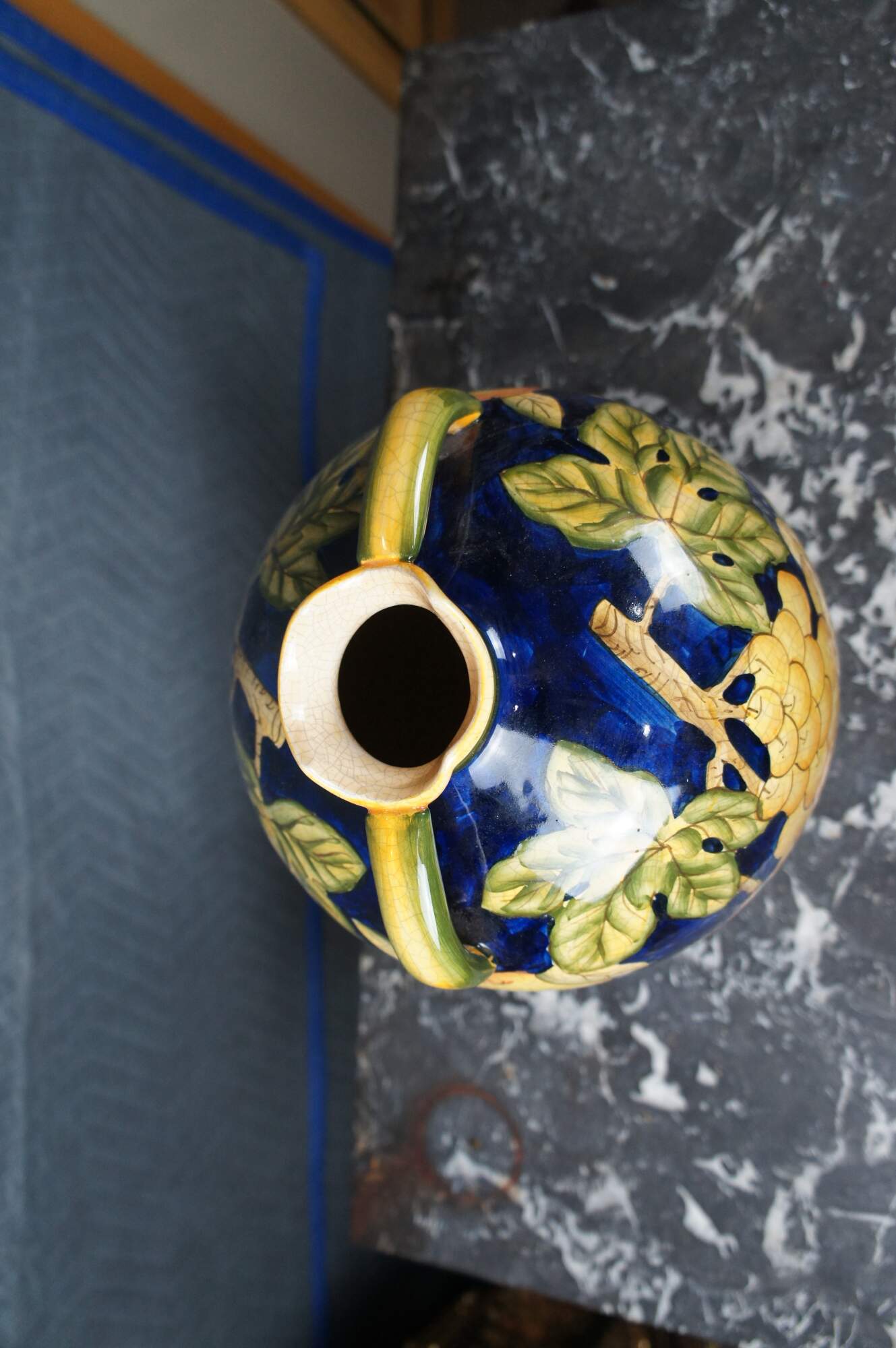 Late 20th century Italian porcelain polychrome handled wine jug. Features a grapevine motif in yellow, blue and green.