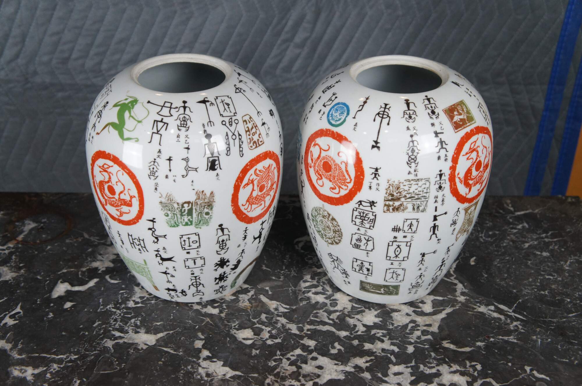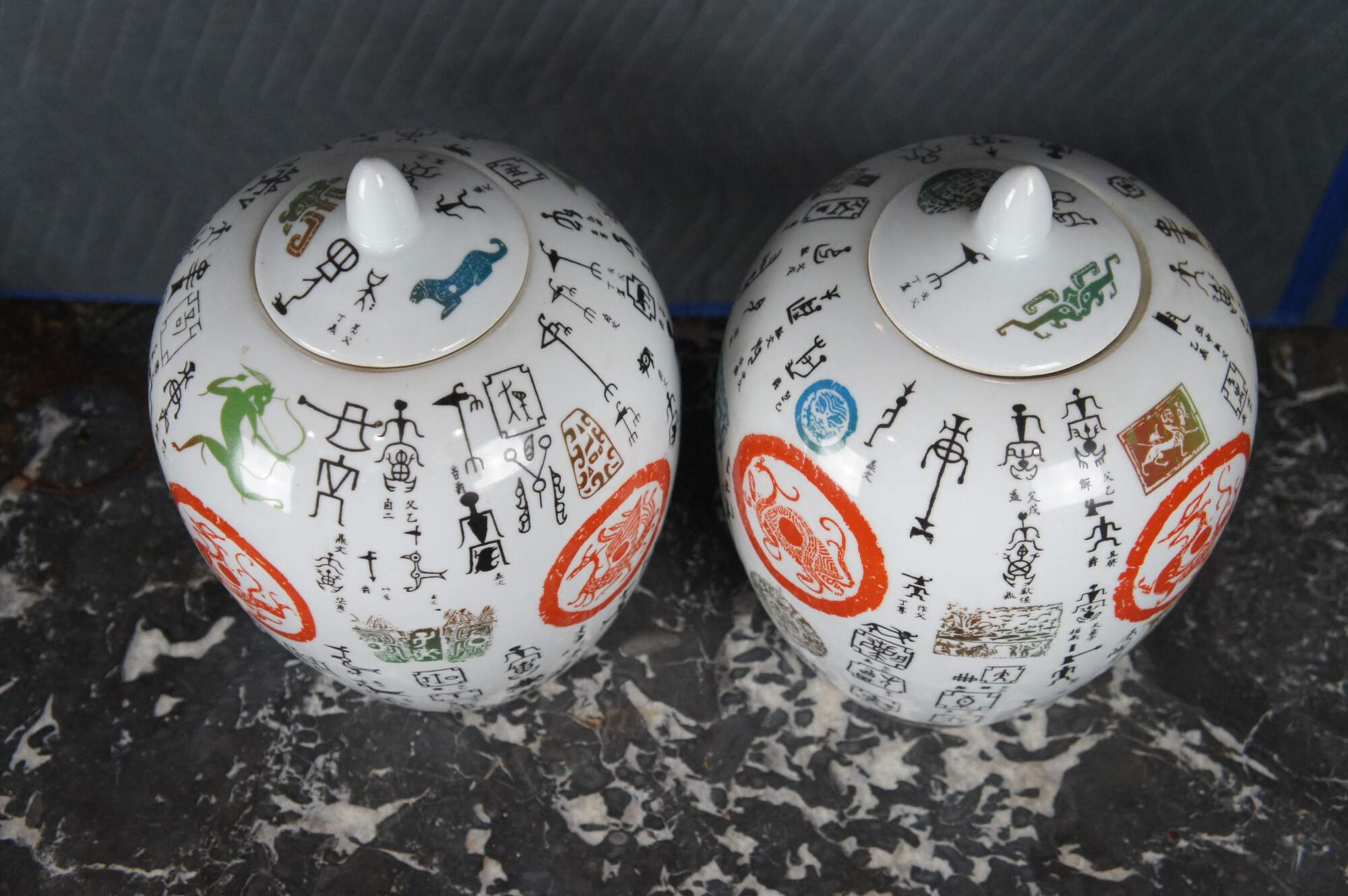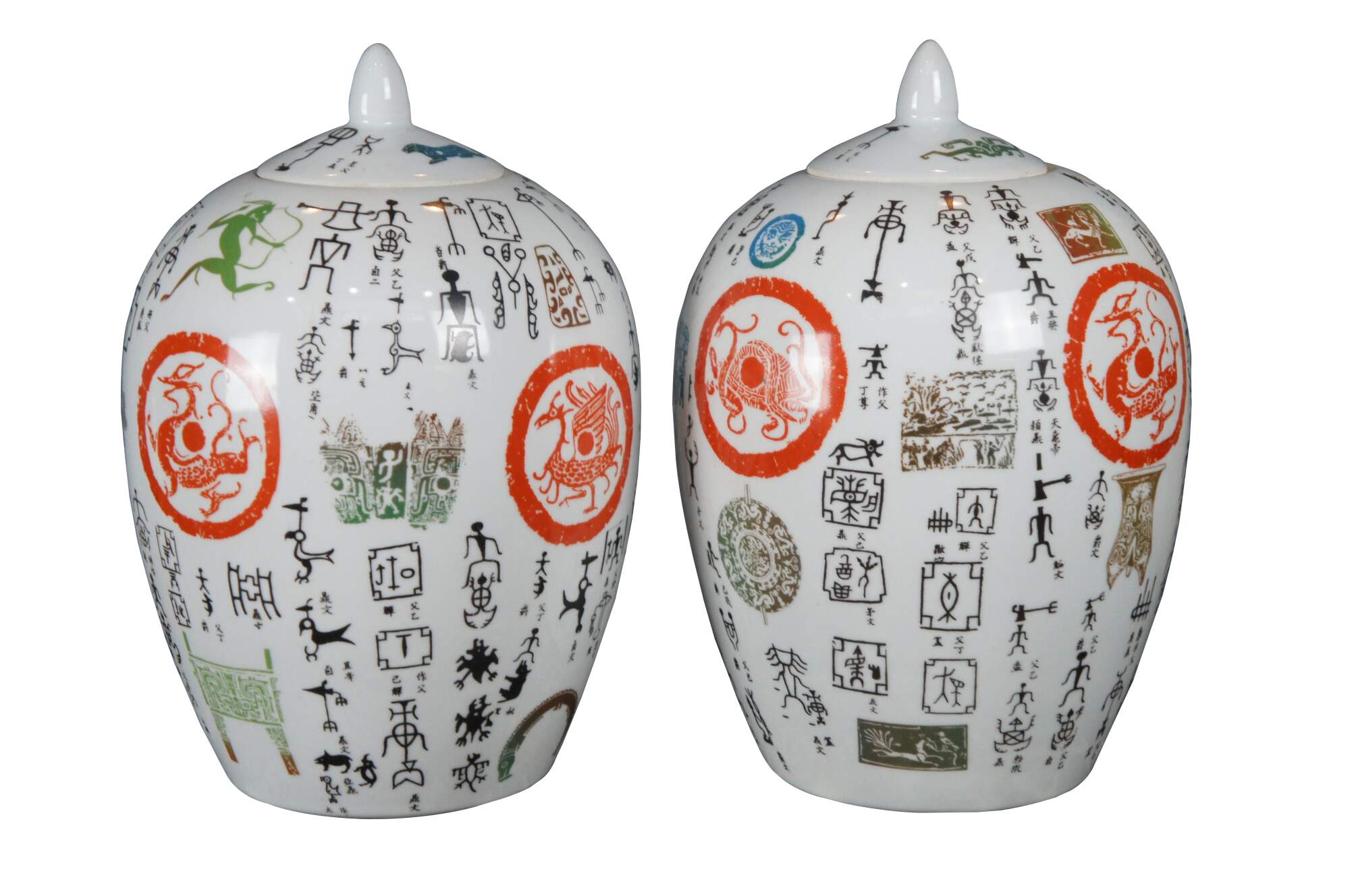 Pair of Chinese Famille Rose ginger jars. Made from porcelain with a uniquely finished exterior featuring animals and figures. The urn has a unique melting pot vibe drawing together motifs from Mesoamerica and Egypt.