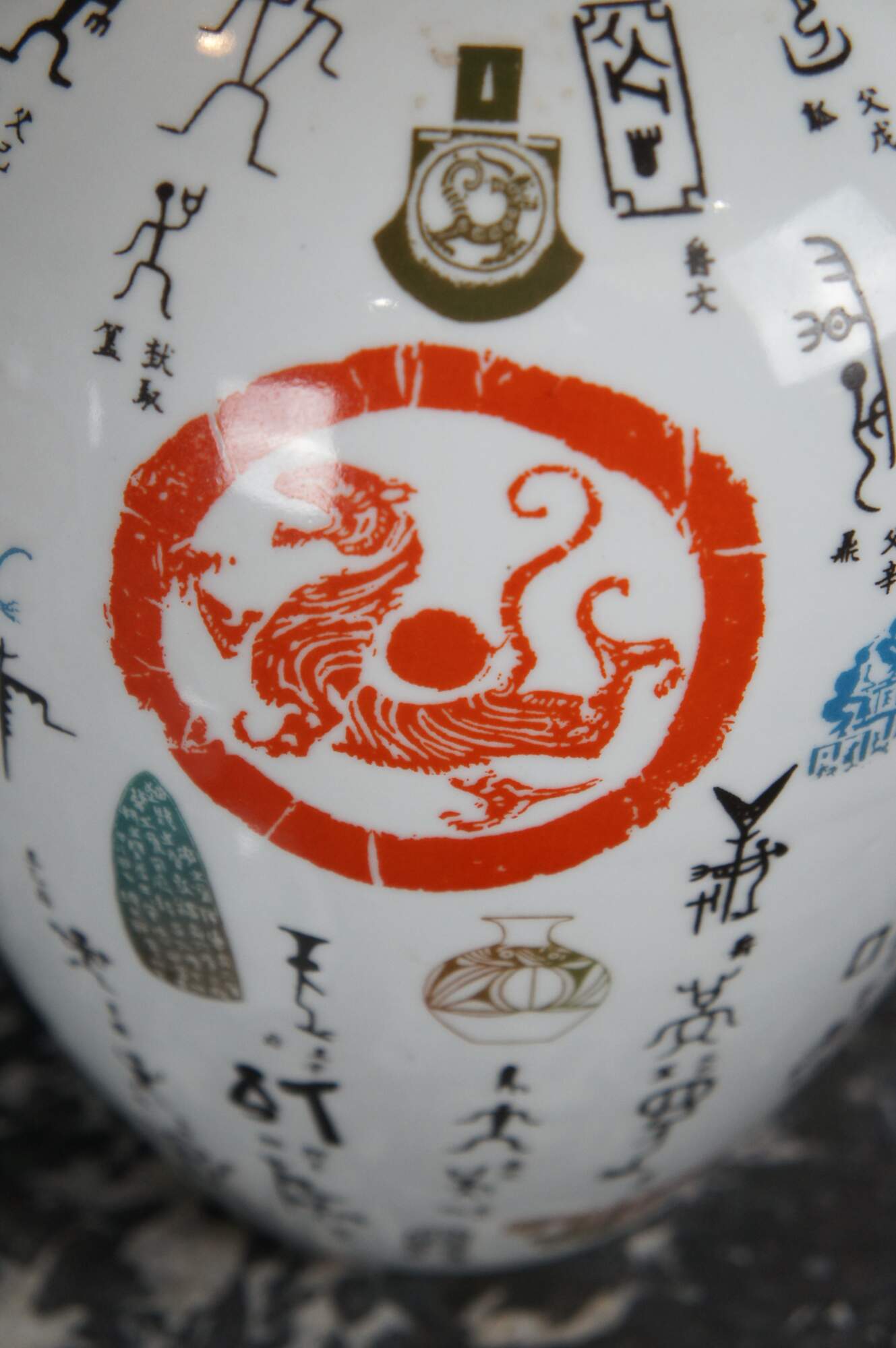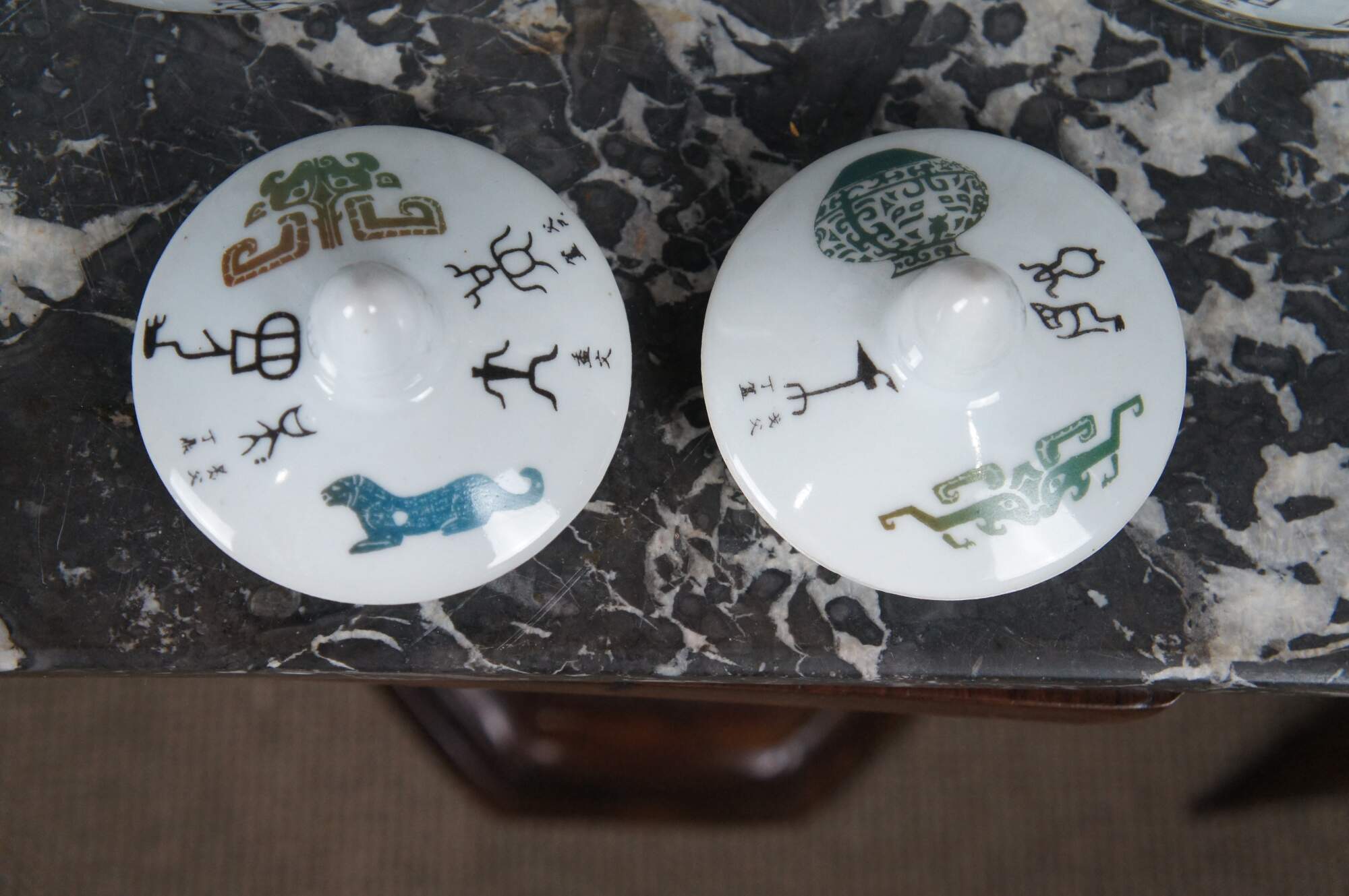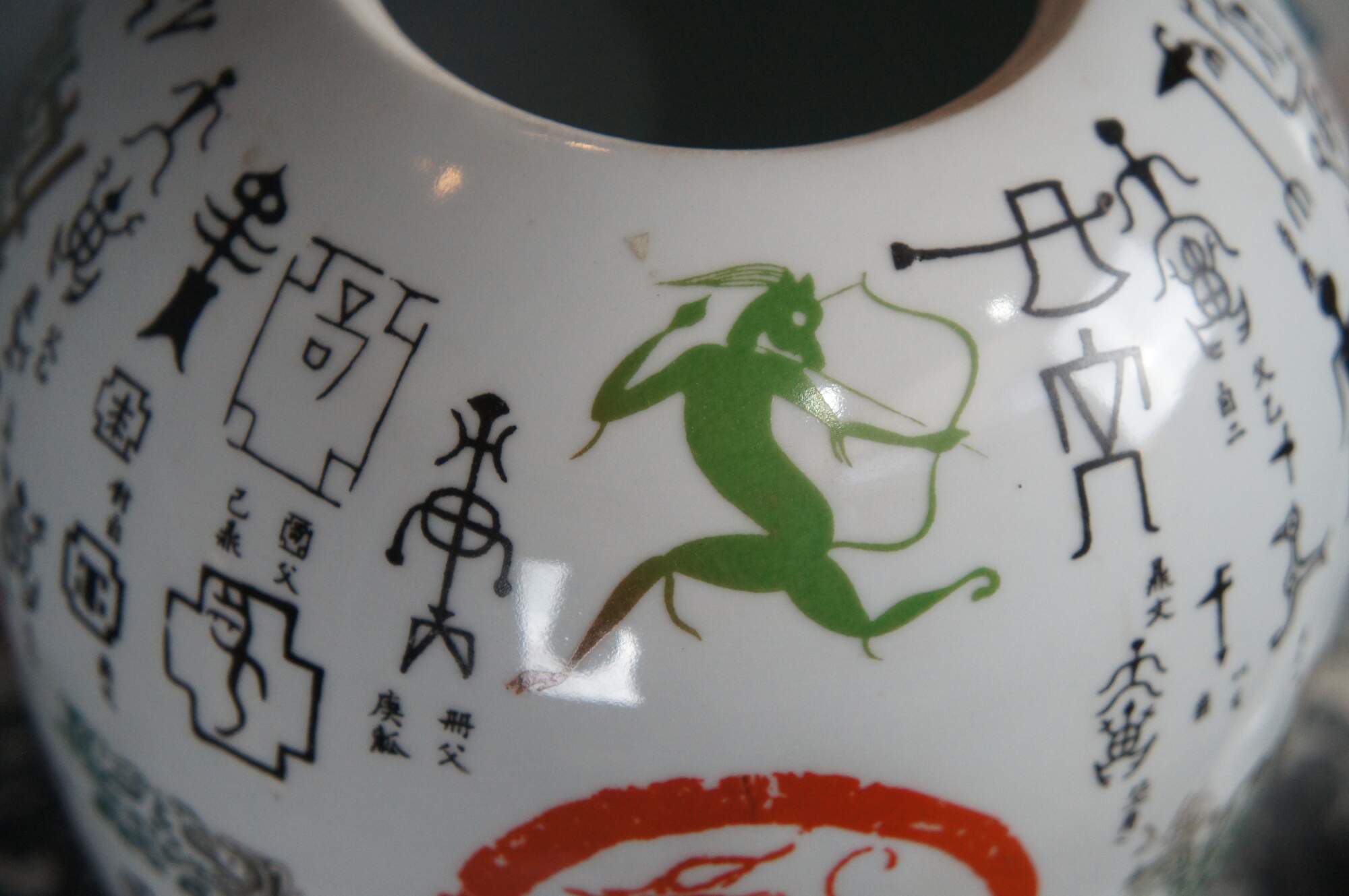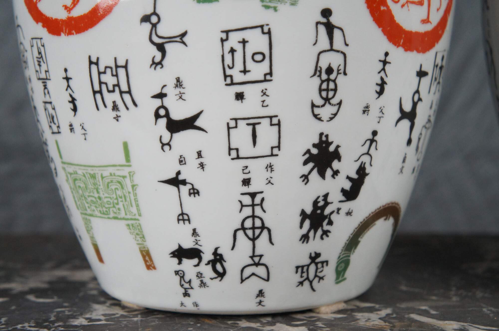 Pair of Chinese Famille Rose ginger jars. Made from porcelain with a uniquely finished exterior featuring animals and figures. The urn has a unique melting pot vibe drawing together motifs from Mesoamerica and Egypt.