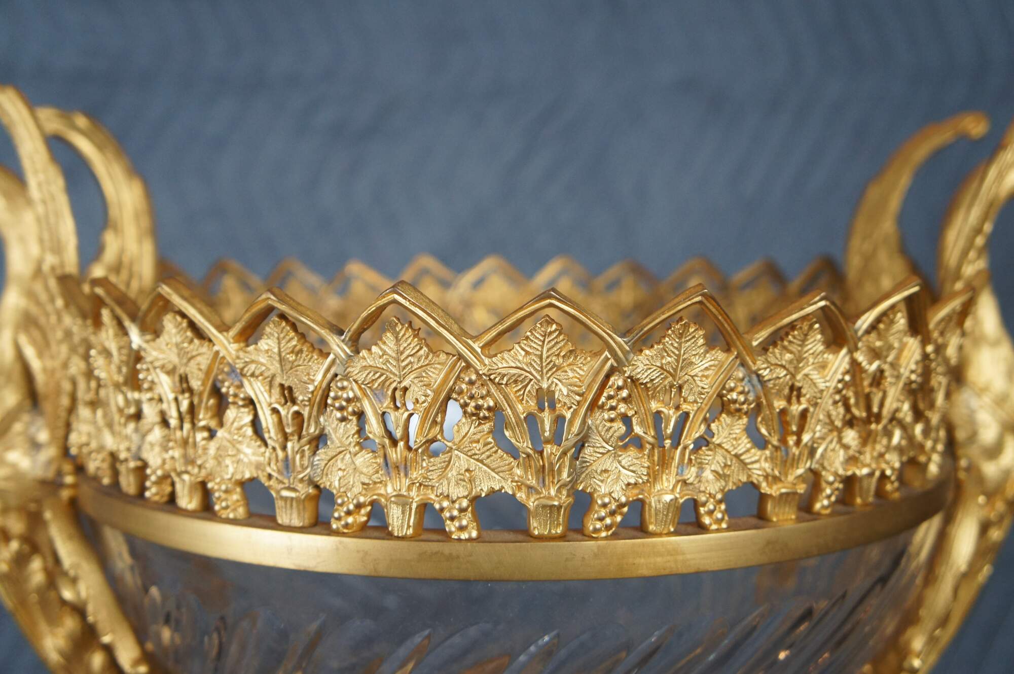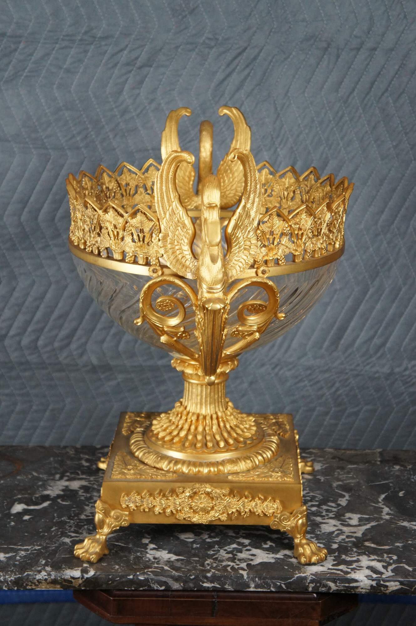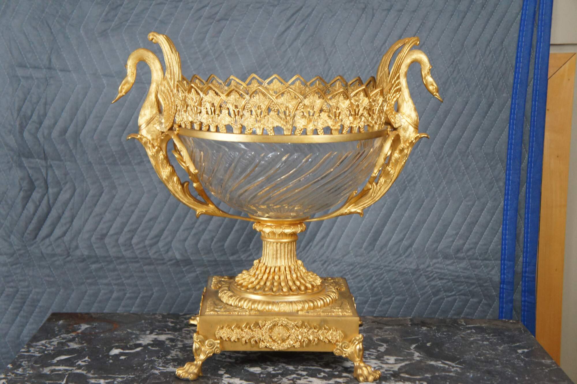 Late 20th Century Eric Stepniewski French Louis XV style Ormolu & Crystal Footed Champagne Chiller / Compote / Centerpiece Bowl / Vase. Features a regal 24k gold finished body with interlaced sawtooth rim over grapevine motif, flanked by figural swan handles with outstretched wings. The crystal bowl has a swirled gadrooning pattern and rests upon a fluted Corinthian style column leading to a square plinth base with ornate applied medallions over paw feet. A breathtaking specimen that will grab attention in any setting.