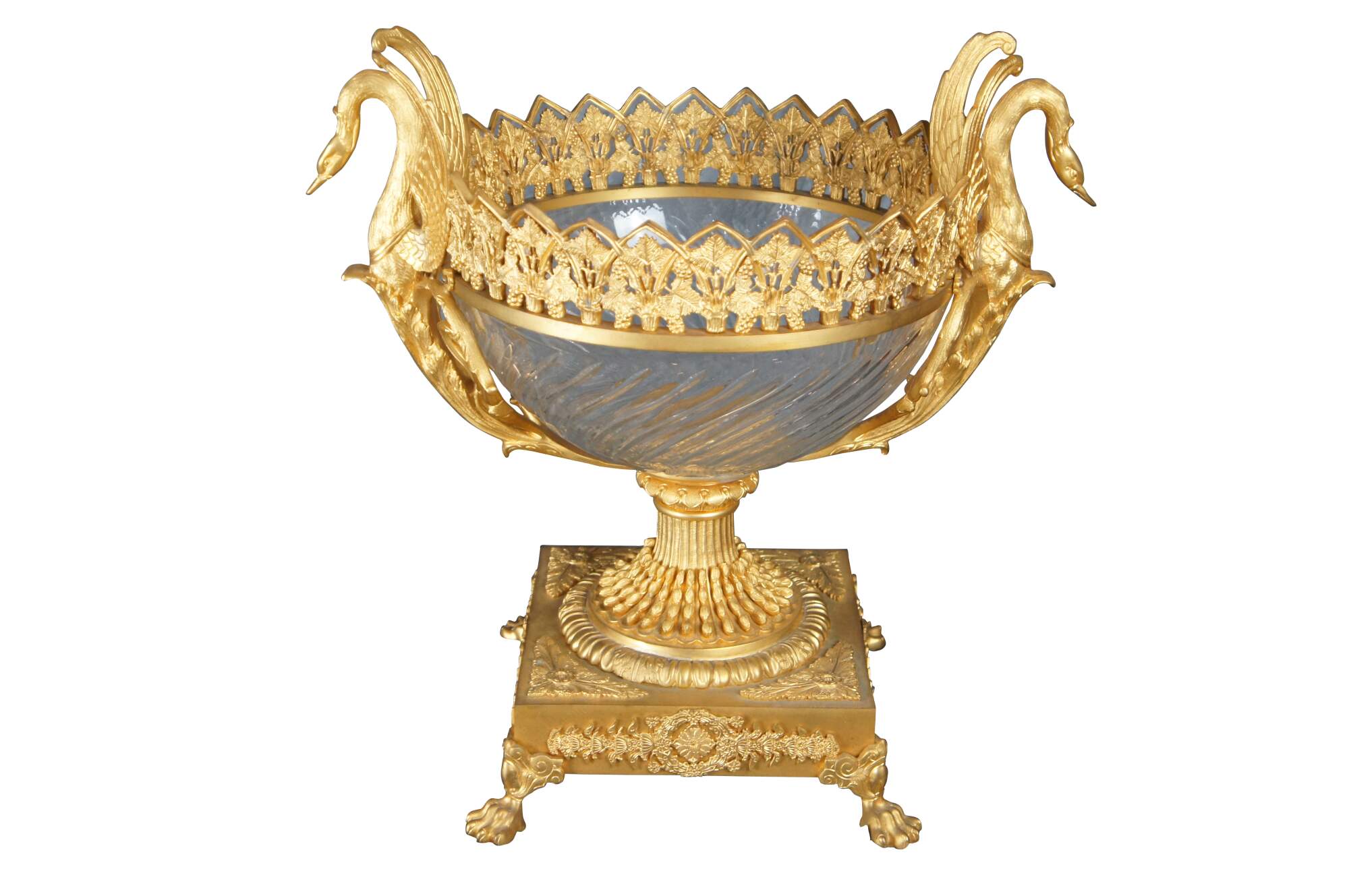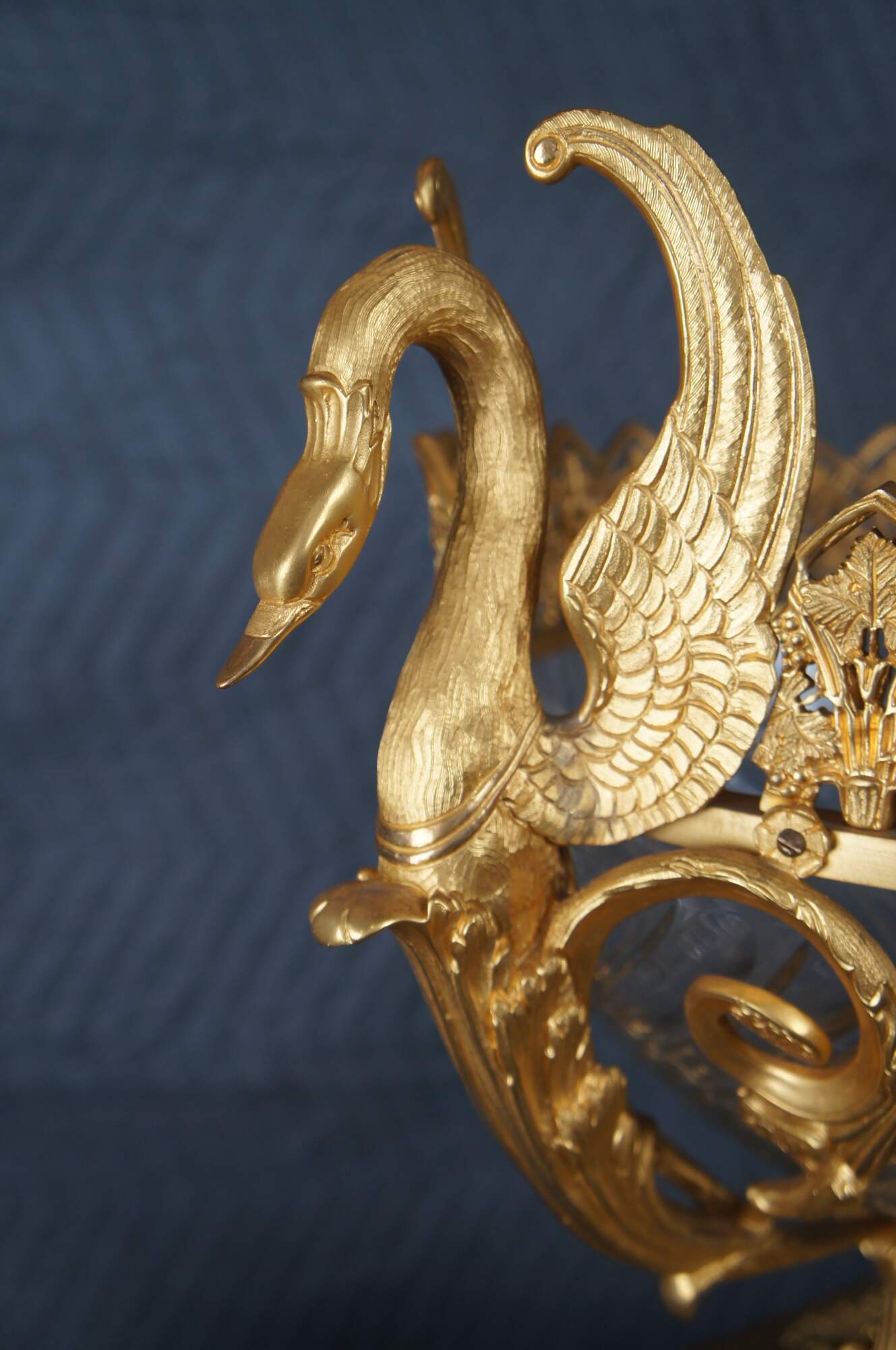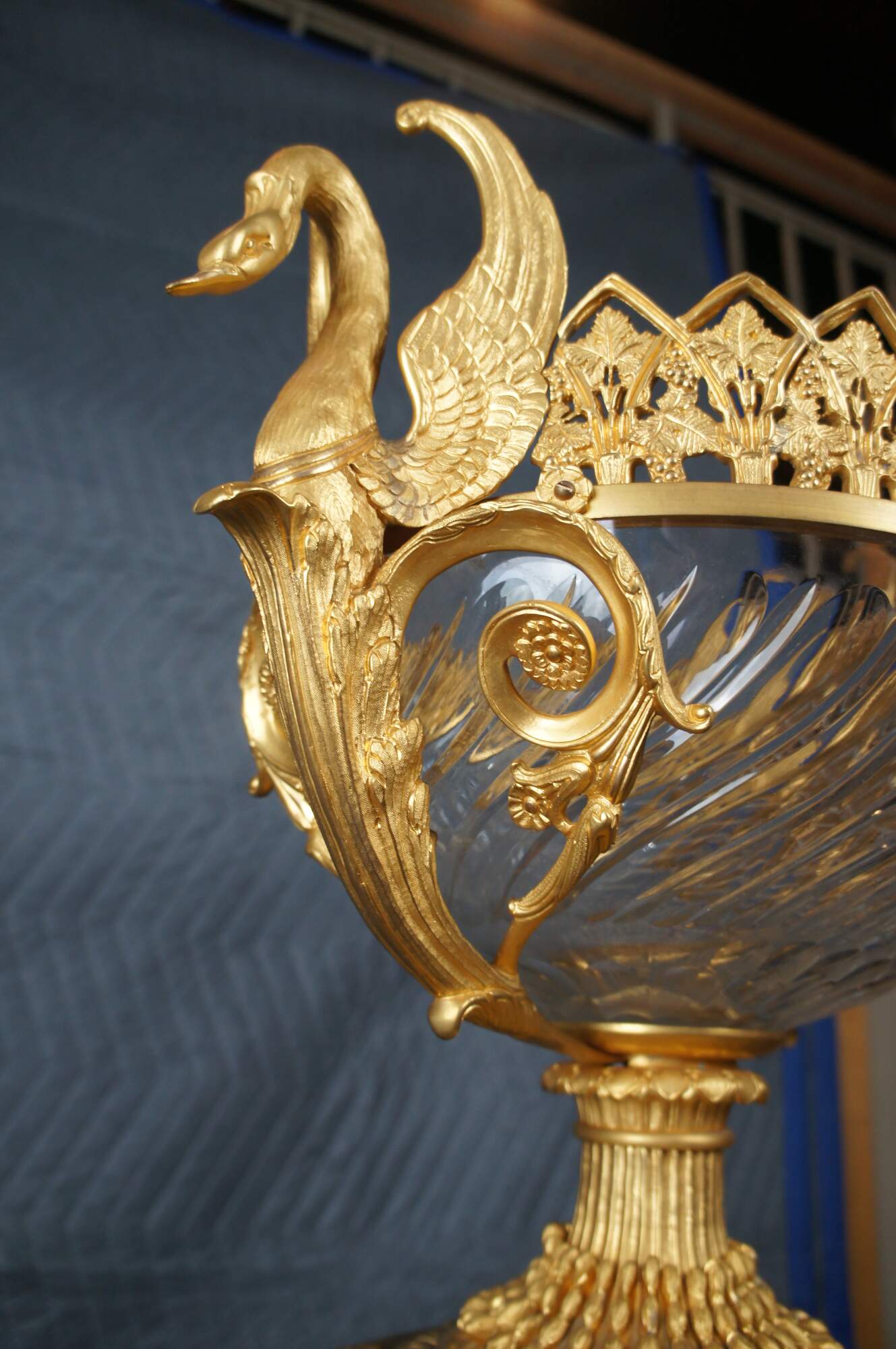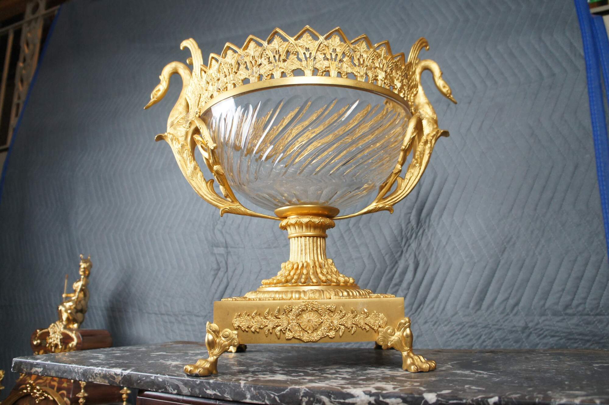 Late 20th Century Eric Stepniewski French Louis XV style Ormolu & Crystal Footed Champagne Chiller / Compote / Centerpiece Bowl / Vase. Features a regal 24k gold finished body with interlaced sawtooth rim over grapevine motif, flanked by figural swan handles with outstretched wings. The crystal bowl has a swirled gadrooning pattern and rests upon a fluted Corinthian style column leading to a square plinth base with ornate applied medallions over paw feet. A breathtaking specimen that will grab attention in any setting.