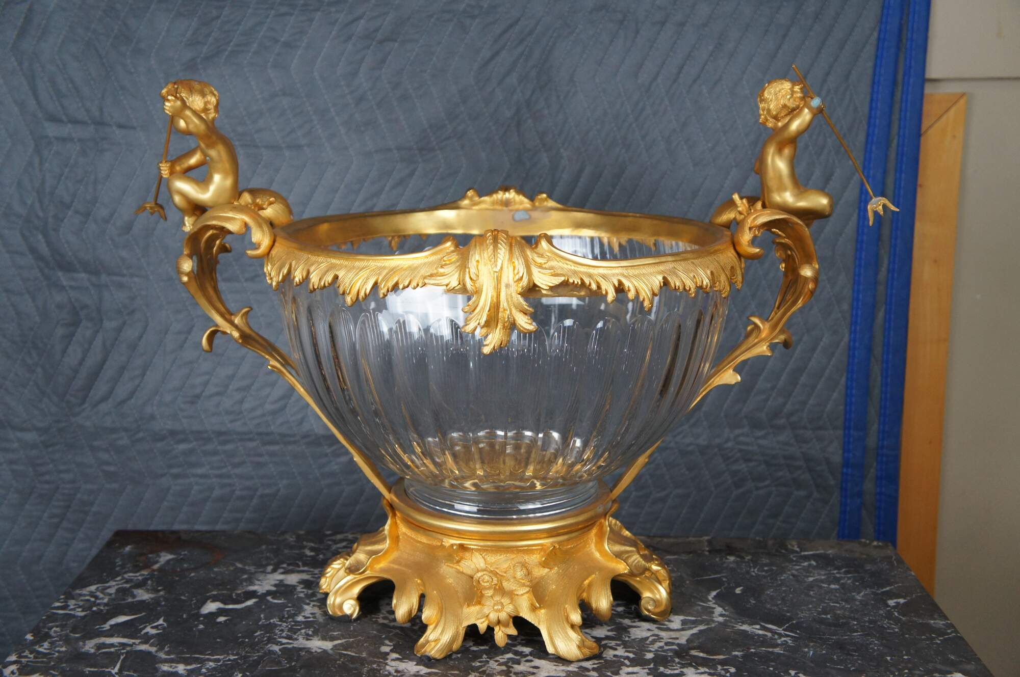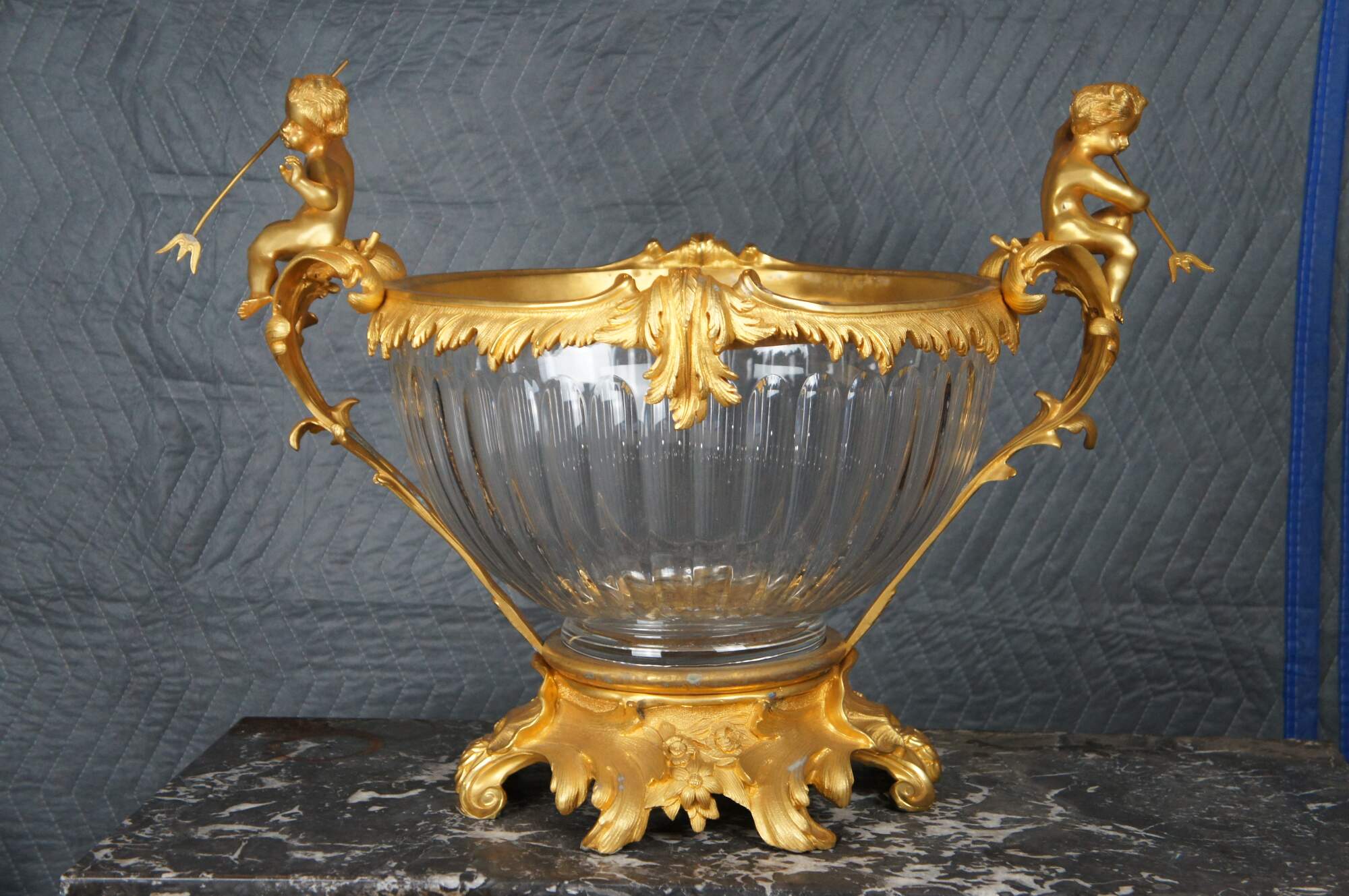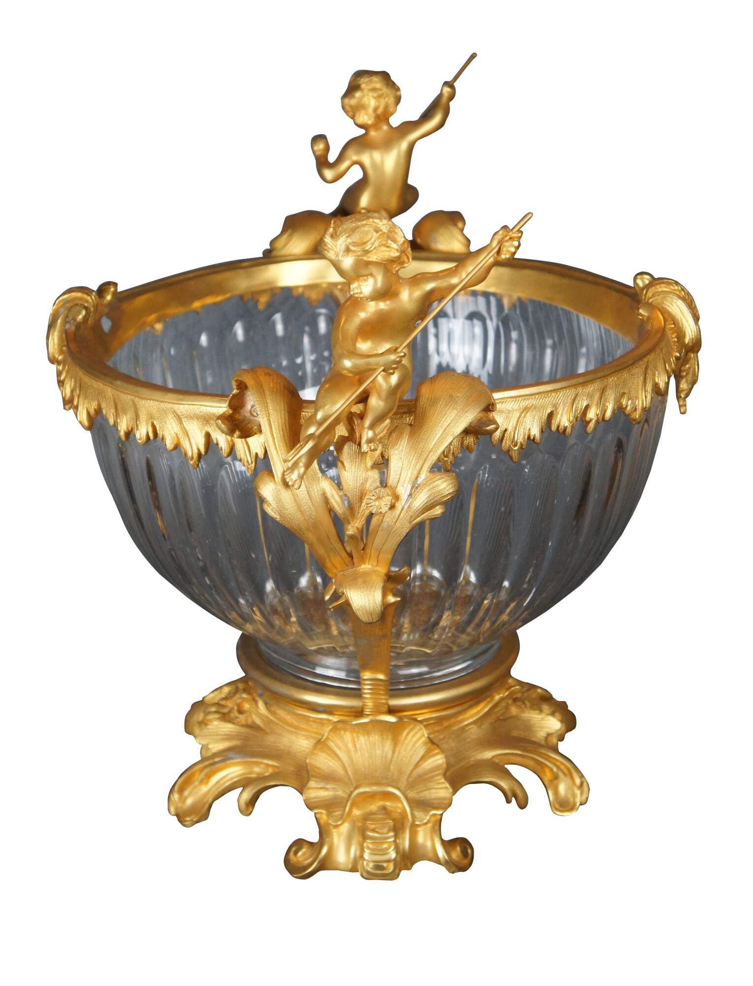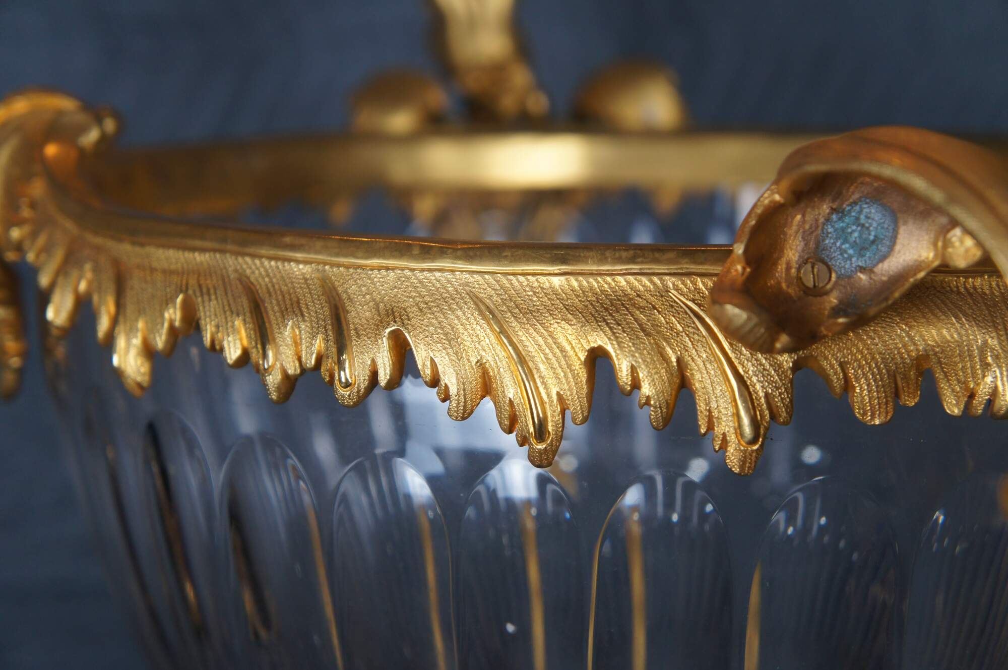 Late 20th Century Eric Stepnewski centerpiece bowl. Crafted from chiseled brass ormolu finished in 24k gold and crystal. Perfectly suited to function as a champagne bowl or simply as a decorative vase or centerpiece Features a gadrooned cut crystal body mounted to the rim with a foliate ormolu band and raised below by an ormolu foot moulded with acanthus leaves and rocaille forms. The bowl showcases twin leafy ormolu handles, with each handle surmounted by a charming seated putto holding a trident.