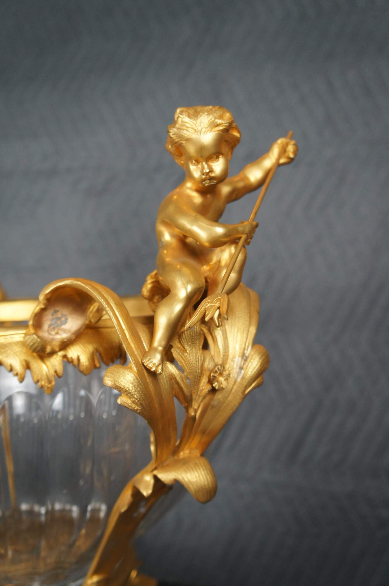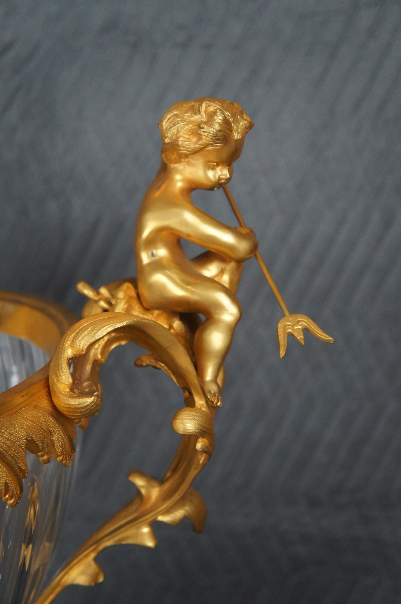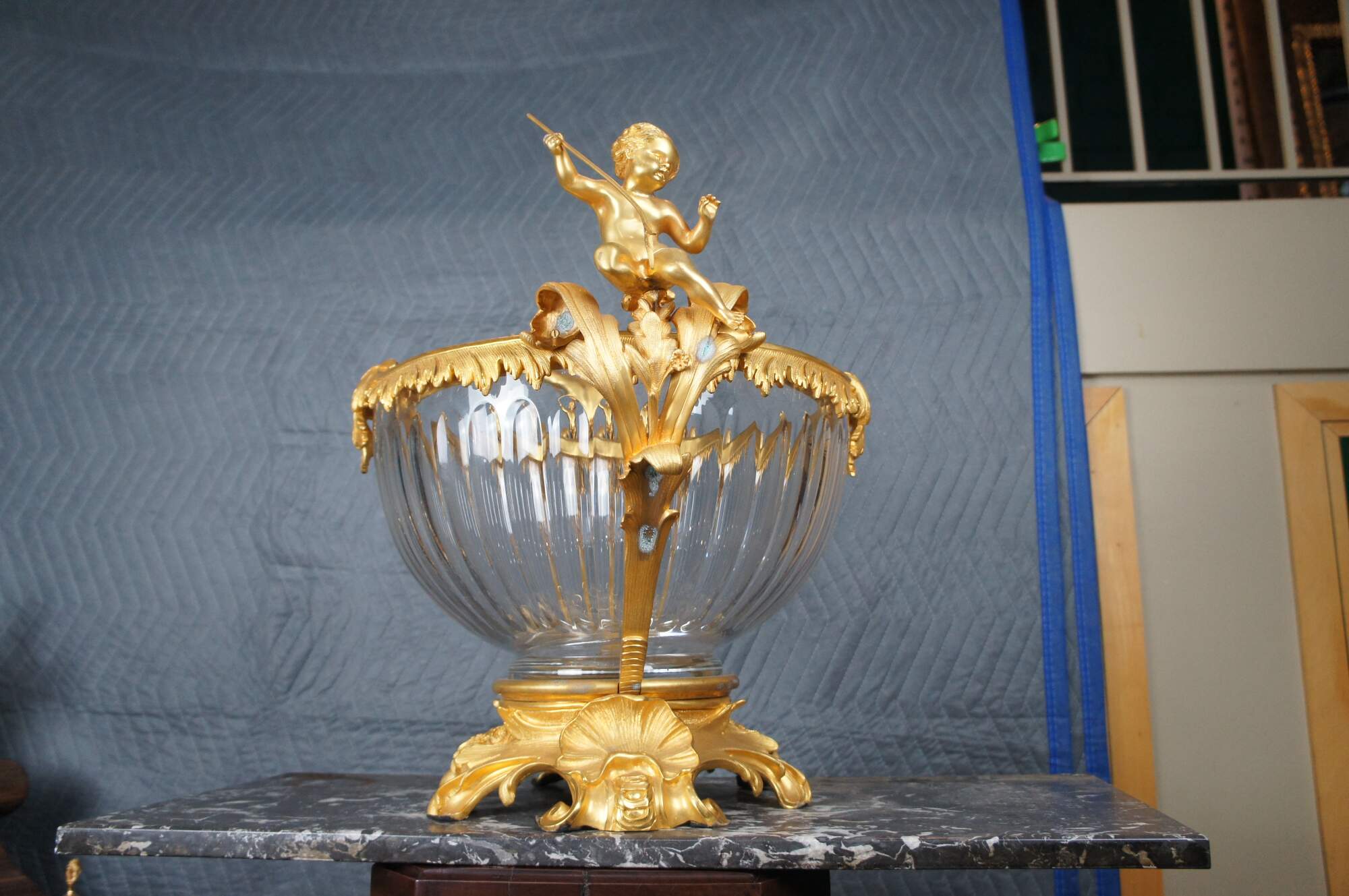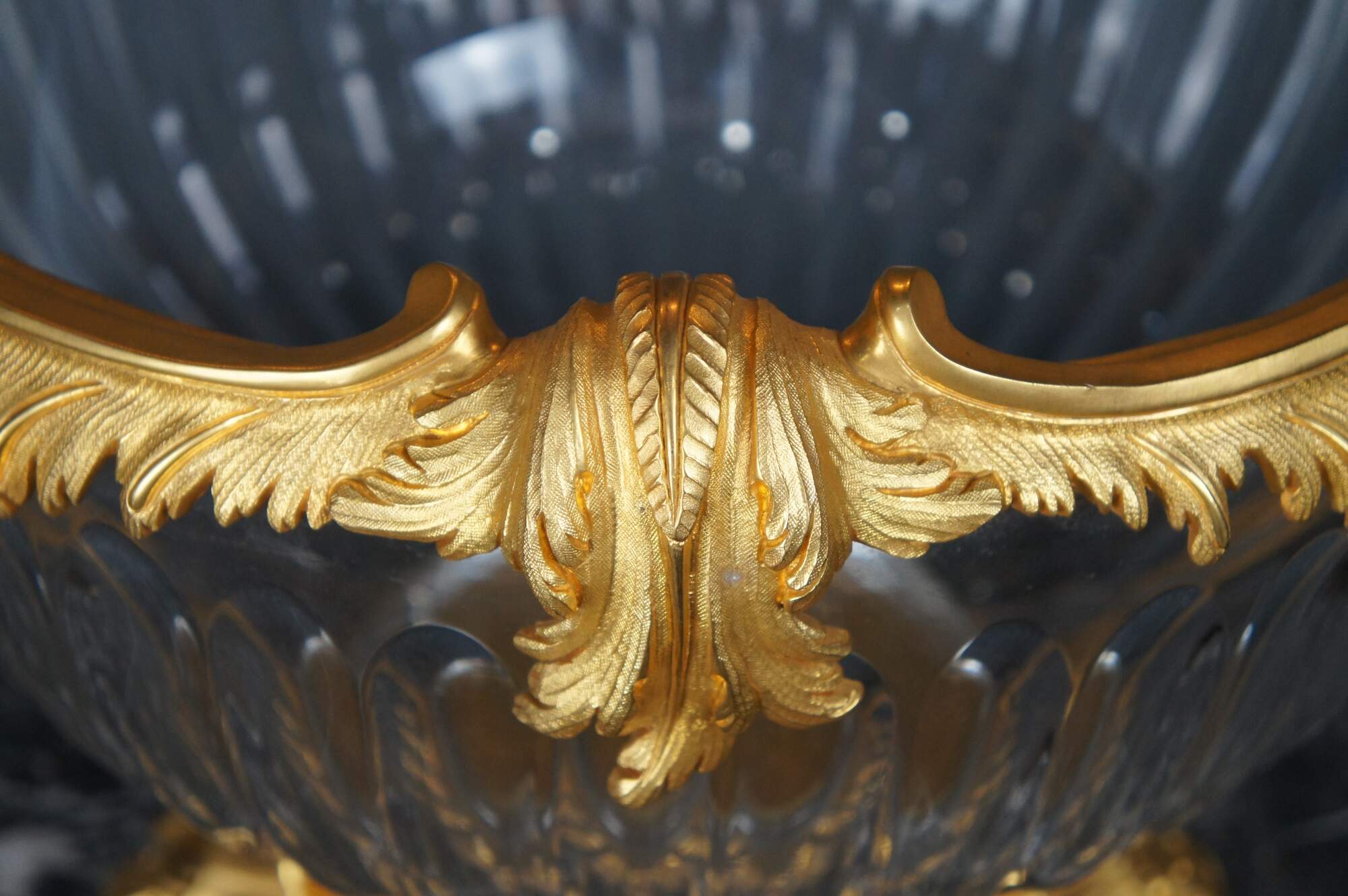 Late 20th Century Eric Stepnewski centerpiece bowl. Crafted from chiseled brass ormolu finished in 24k gold and crystal. Perfectly suited to function as a champagne bowl or simply as a decorative vase or centerpiece Features a gadrooned cut crystal body mounted to the rim with a foliate ormolu band and raised below by an ormolu foot moulded with acanthus leaves and rocaille forms. The bowl showcases twin leafy ormolu handles, with each handle surmounted by a charming seated putto holding a trident.