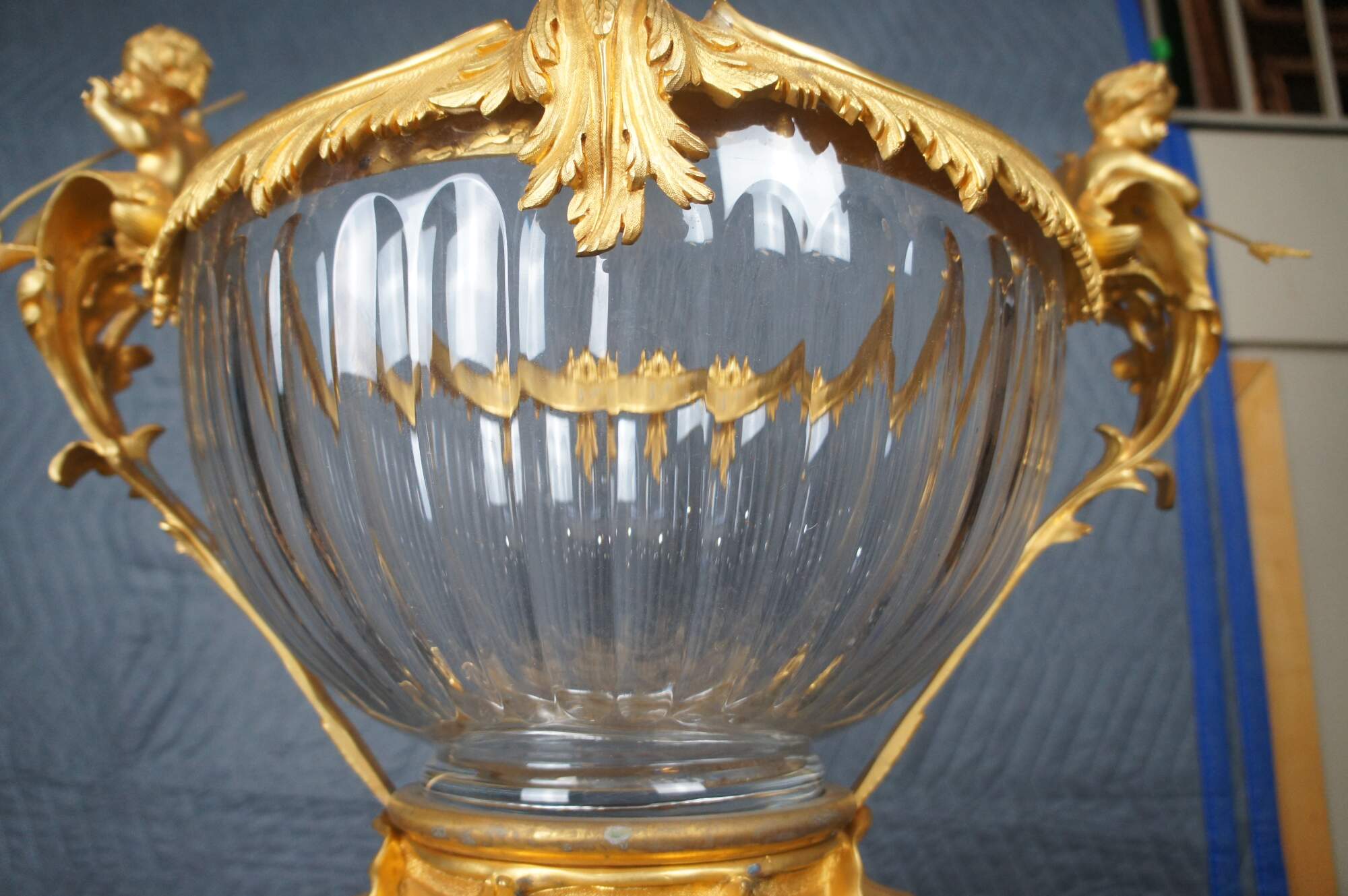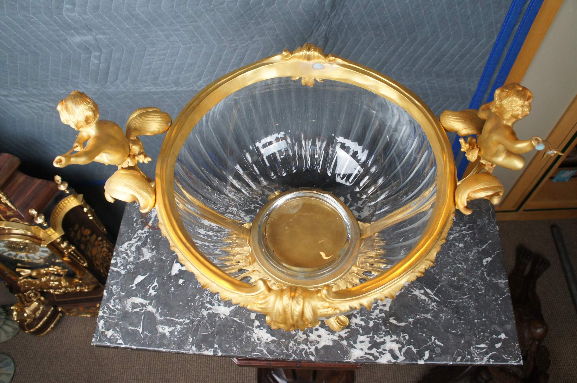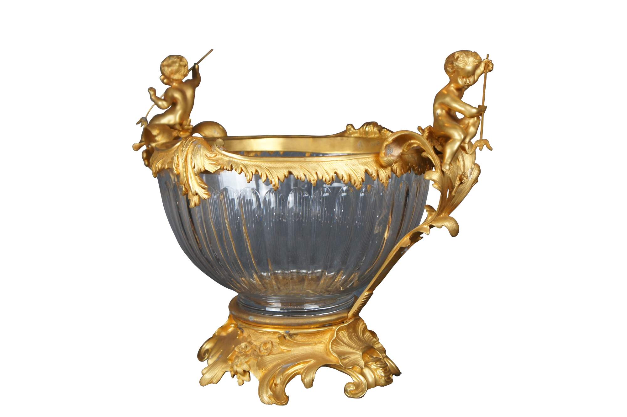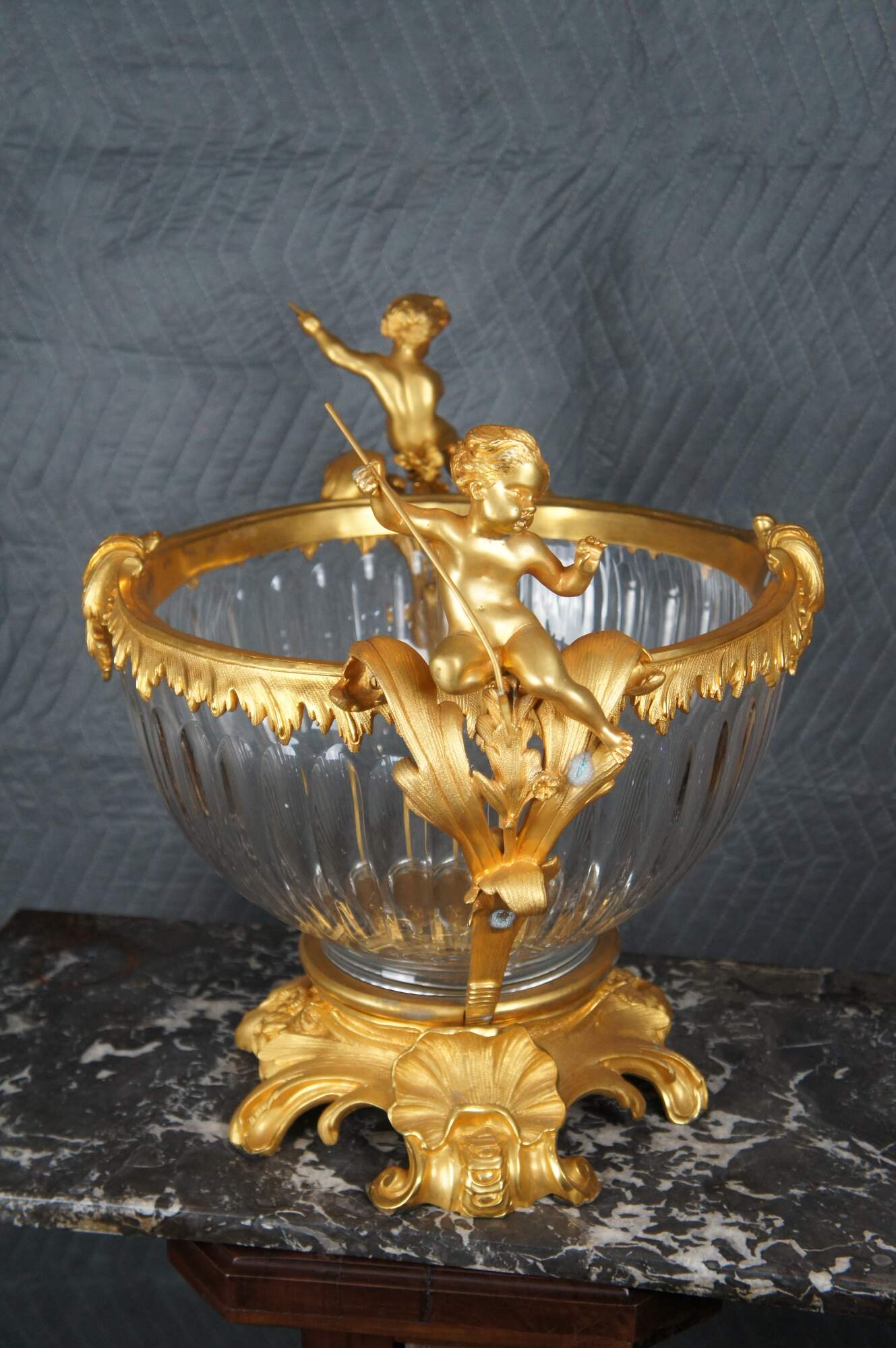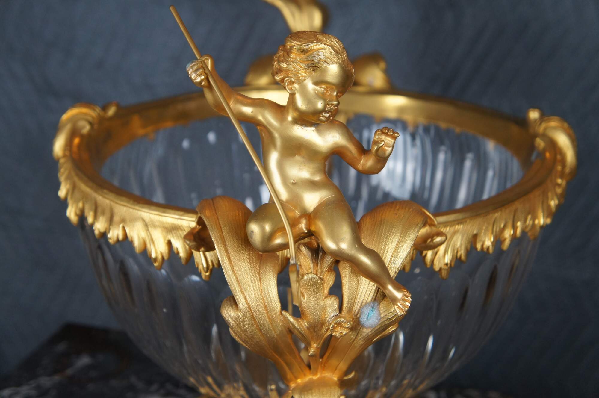 Late 20th Century Eric Stepnewski centerpiece bowl. Crafted from chiseled brass ormolu finished in 24k gold and crystal. Perfectly suited to function as a champagne bowl or simply as a decorative vase or centerpiece Features a gadrooned cut crystal body mounted to the rim with a foliate ormolu band and raised below by an ormolu foot moulded with acanthus leaves and rocaille forms. The bowl showcases twin leafy ormolu handles, with each handle surmounted by a charming seated putto holding a trident.