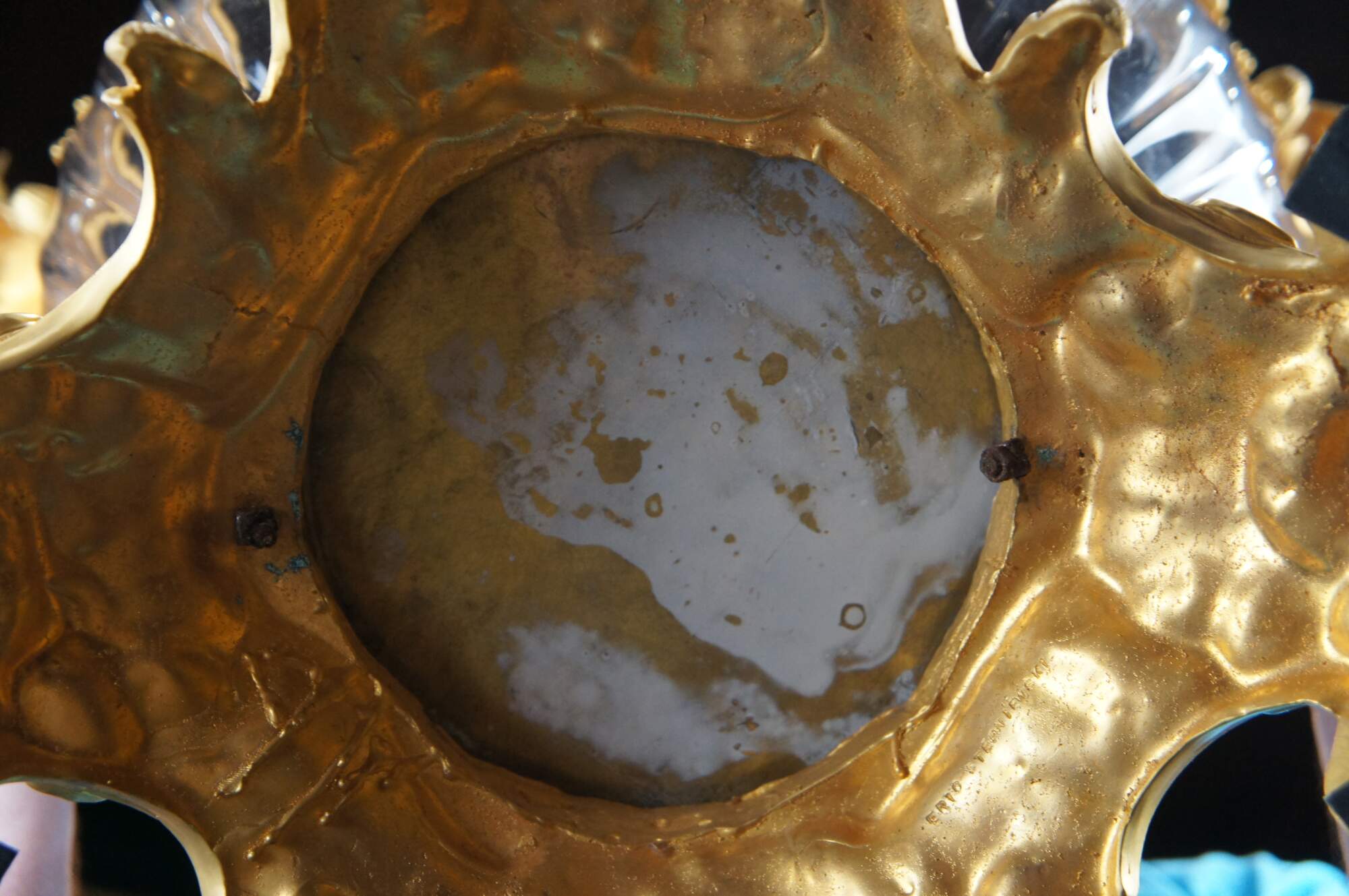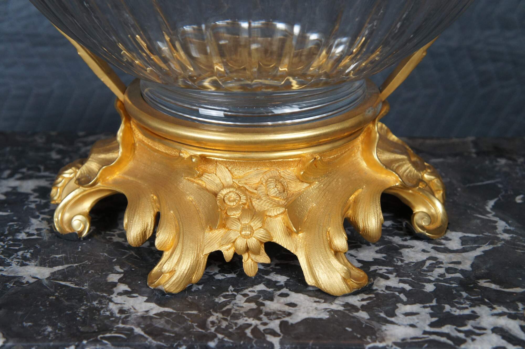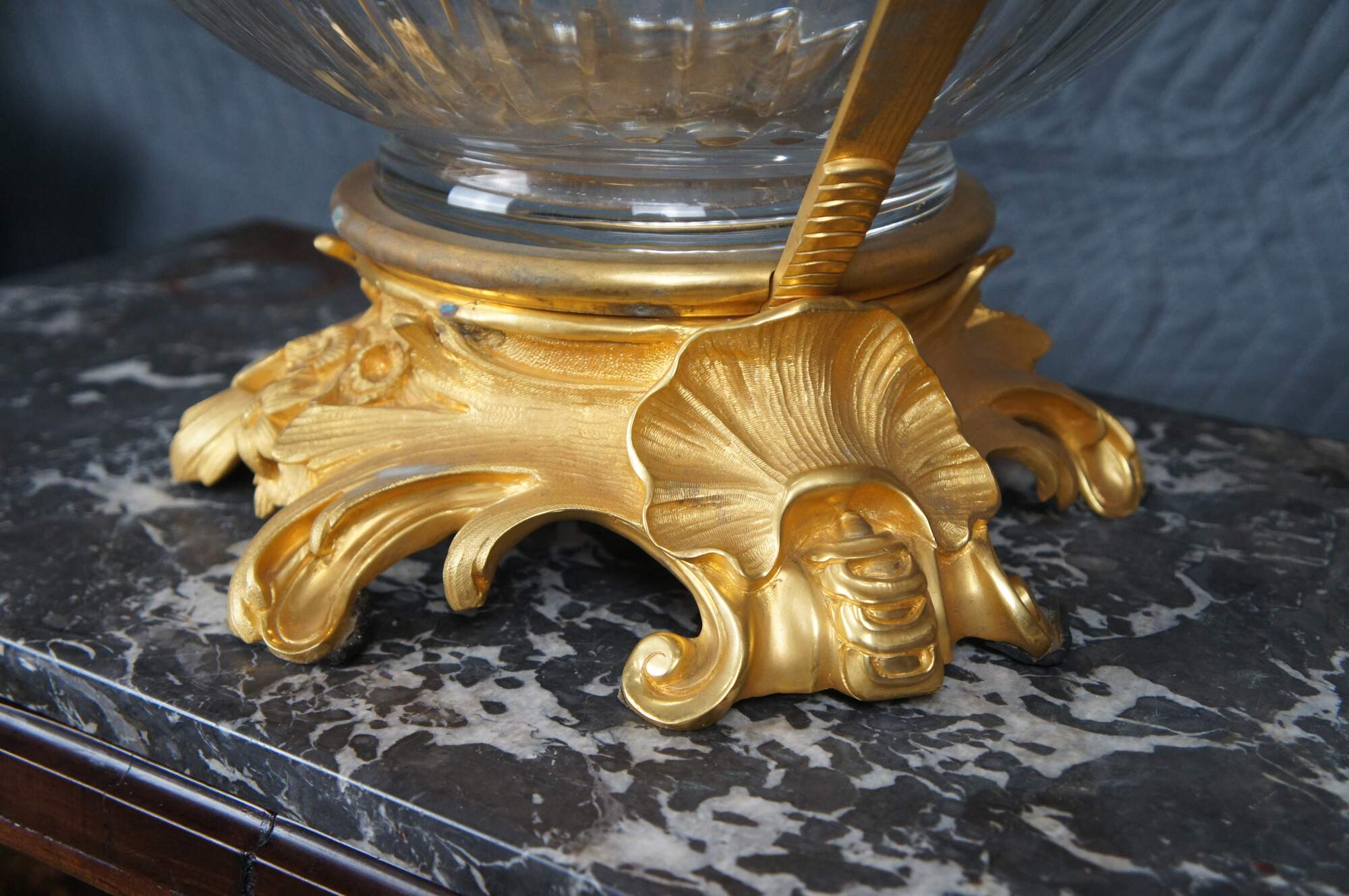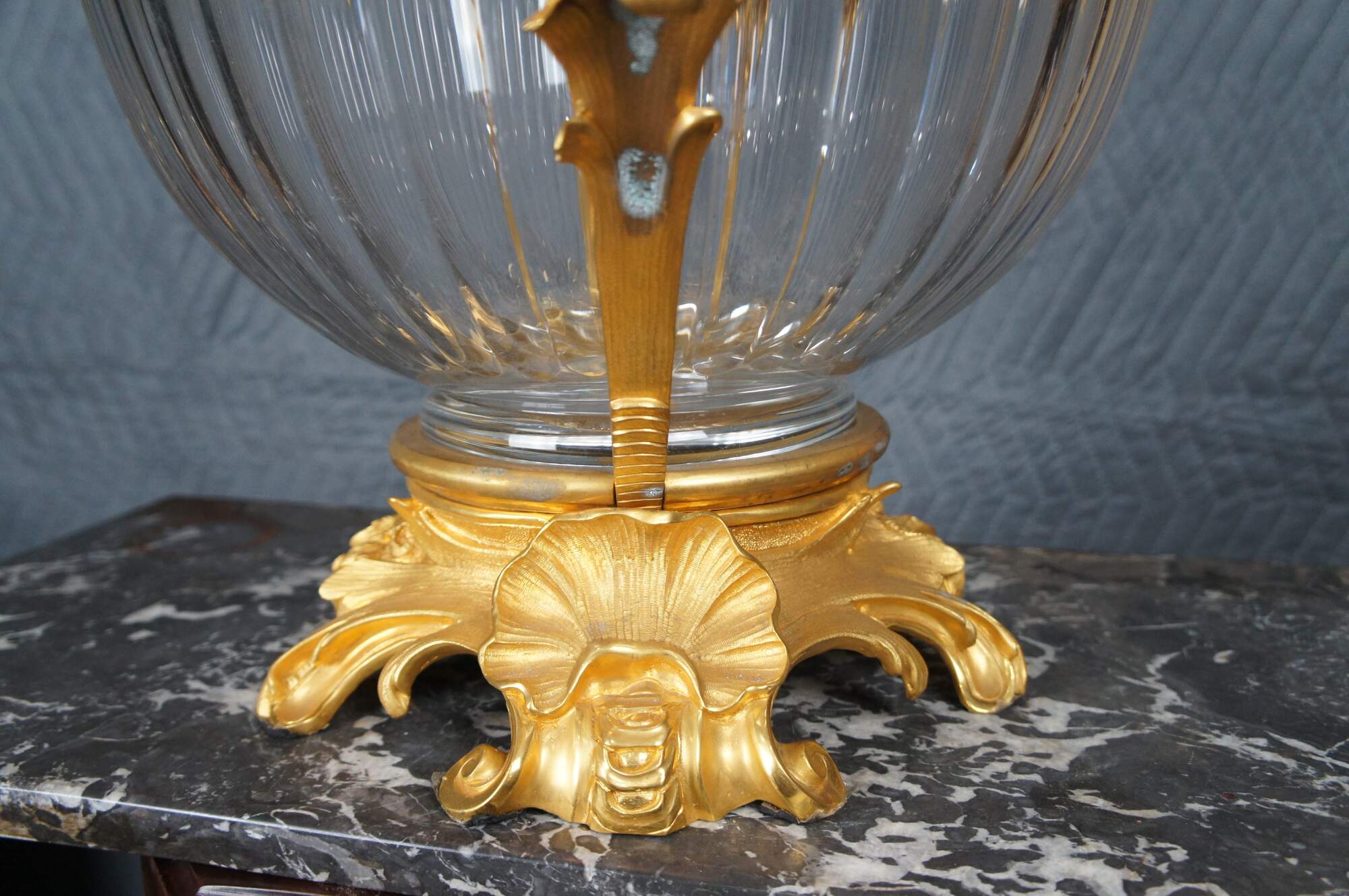 Late 20th Century Eric Stepnewski centerpiece bowl. Crafted from chiseled brass ormolu finished in 24k gold and crystal. Perfectly suited to function as a champagne bowl or simply as a decorative vase or centerpiece Features a gadrooned cut crystal body mounted to the rim with a foliate ormolu band and raised below by an ormolu foot moulded with acanthus leaves and rocaille forms. The bowl showcases twin leafy ormolu handles, with each handle surmounted by a charming seated putto holding a trident.