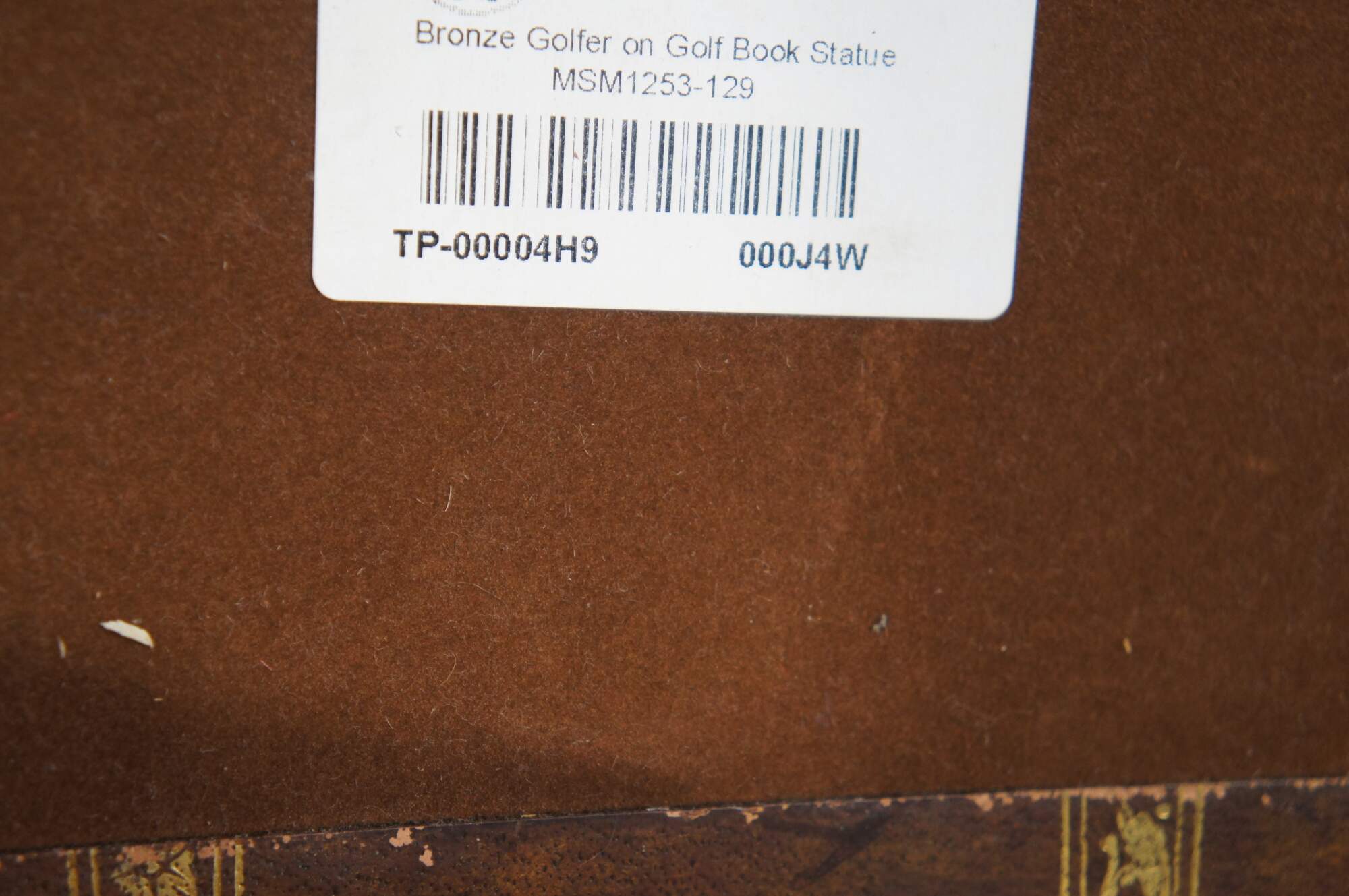Late 20th Century Maitland Smith Bronze Golfer on Book Sculpture / bookend. Features a right handed gentleman adressing the ball over a tooled leather book marked "Golf Book". The book has faux gilded pages.