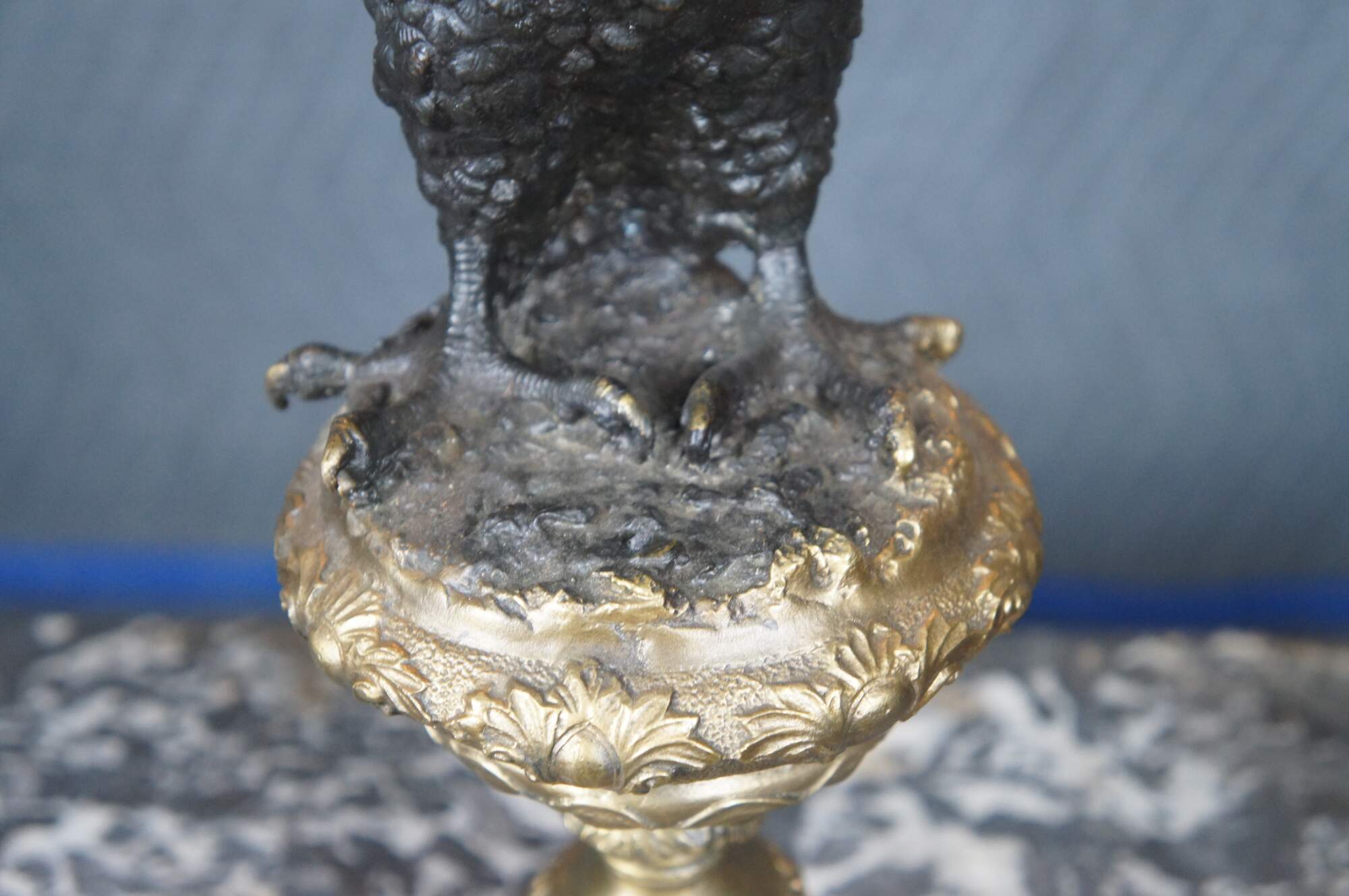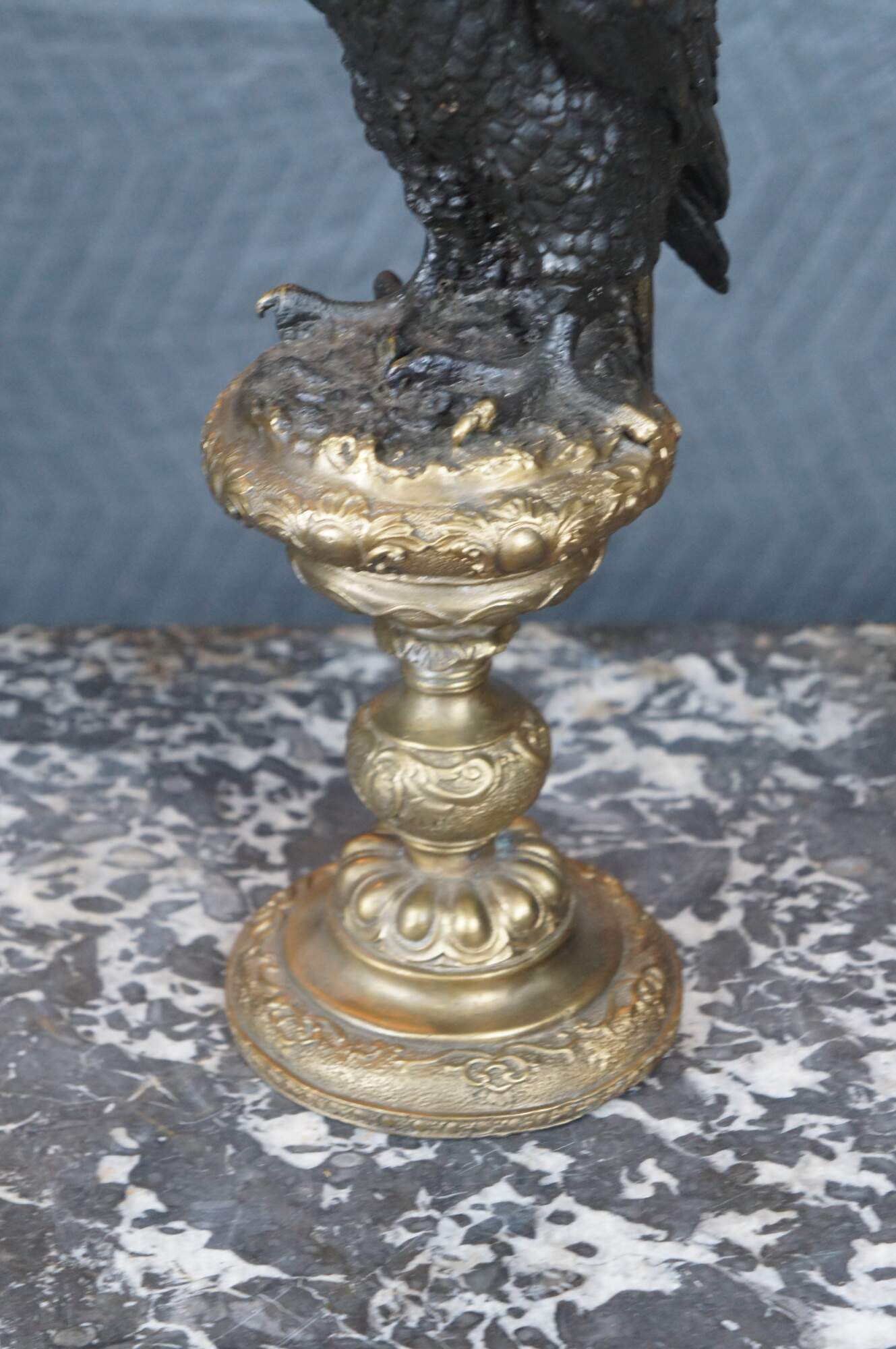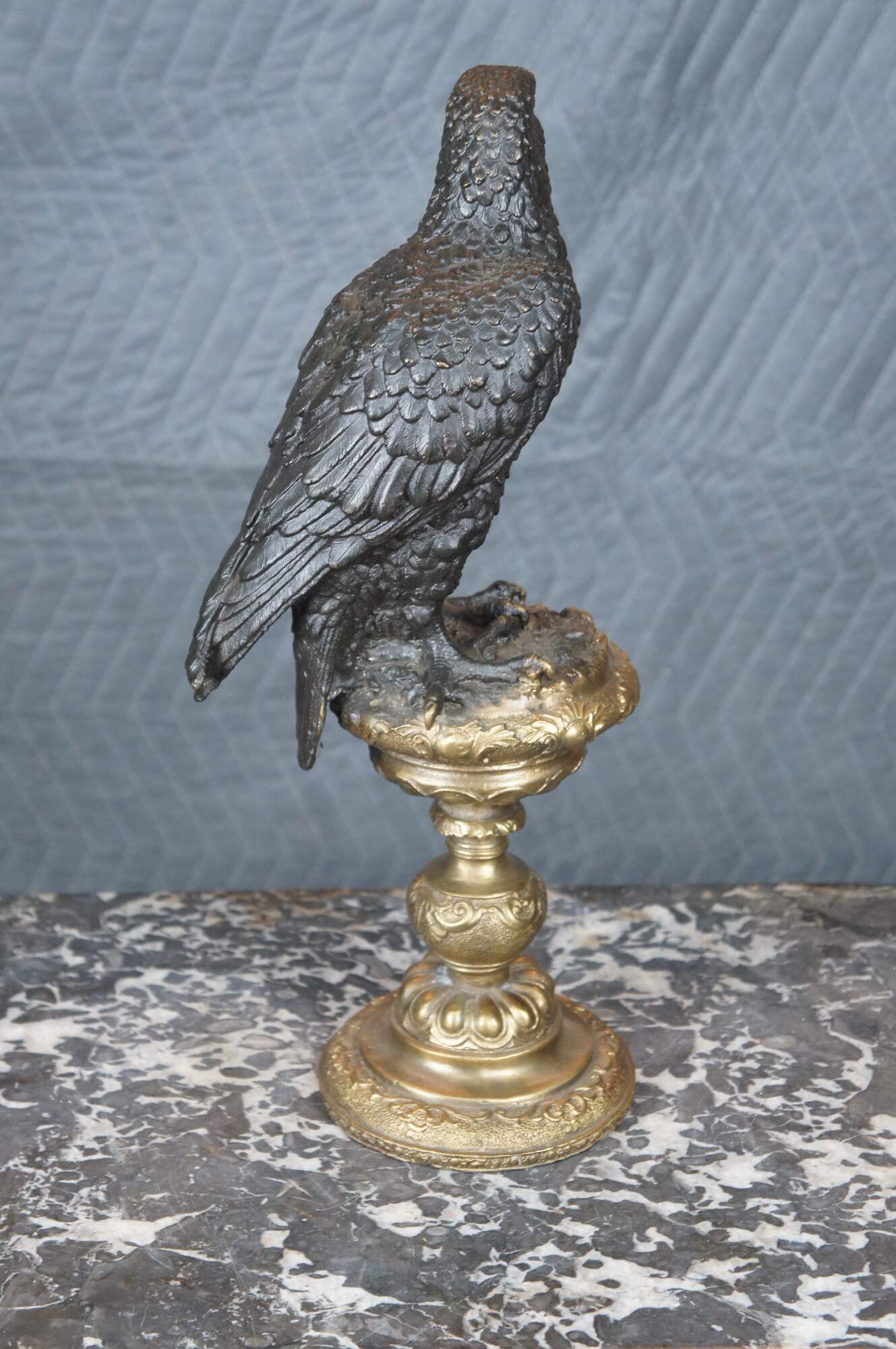 An impressive bronze eagle over an altar stick after Archibald Thorburn (Scottish 1860-1935). Features a bronze figure of a perched golden eagle. The eagle is in black with a gold beak over an ornate gold finished pedestal / altar stick. A beautiful representation that displays well in any setting.