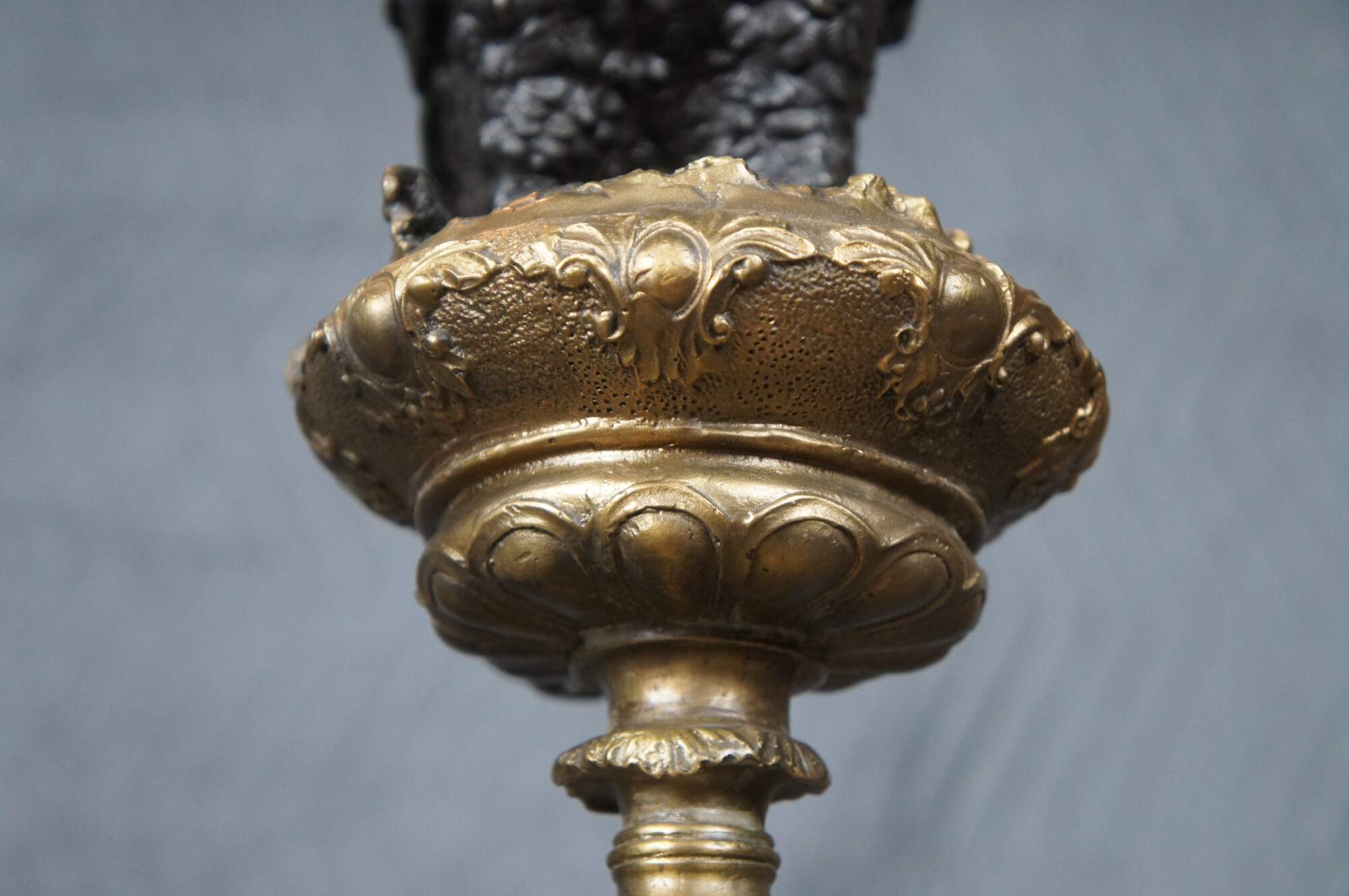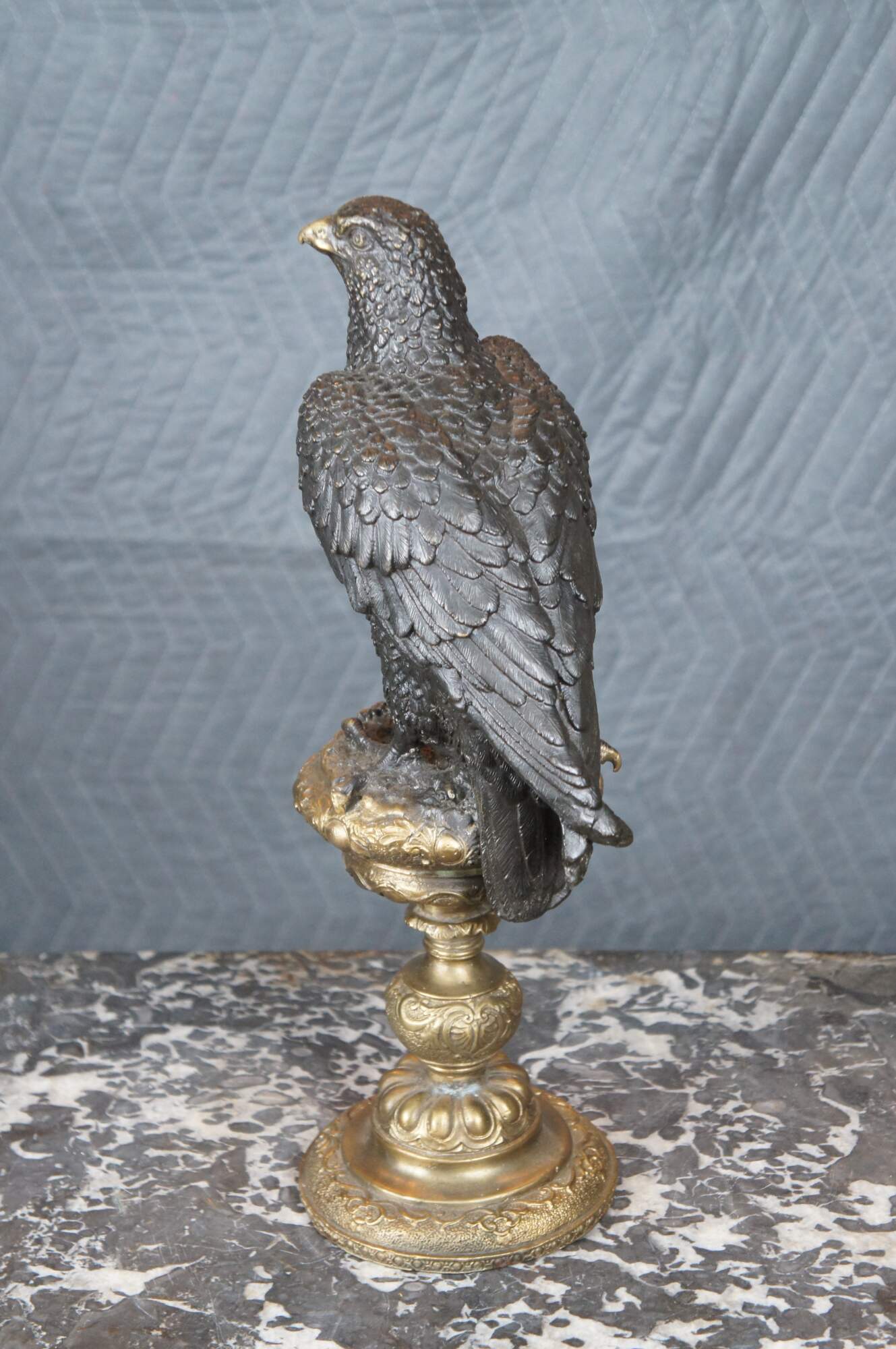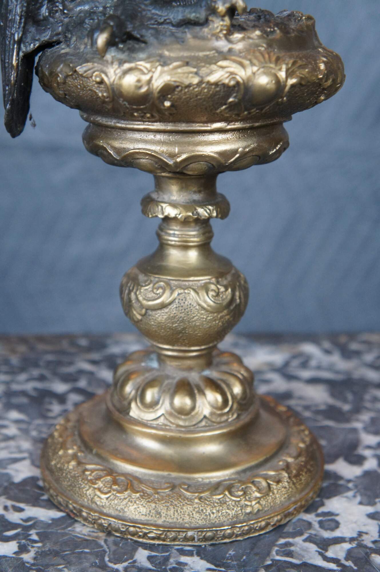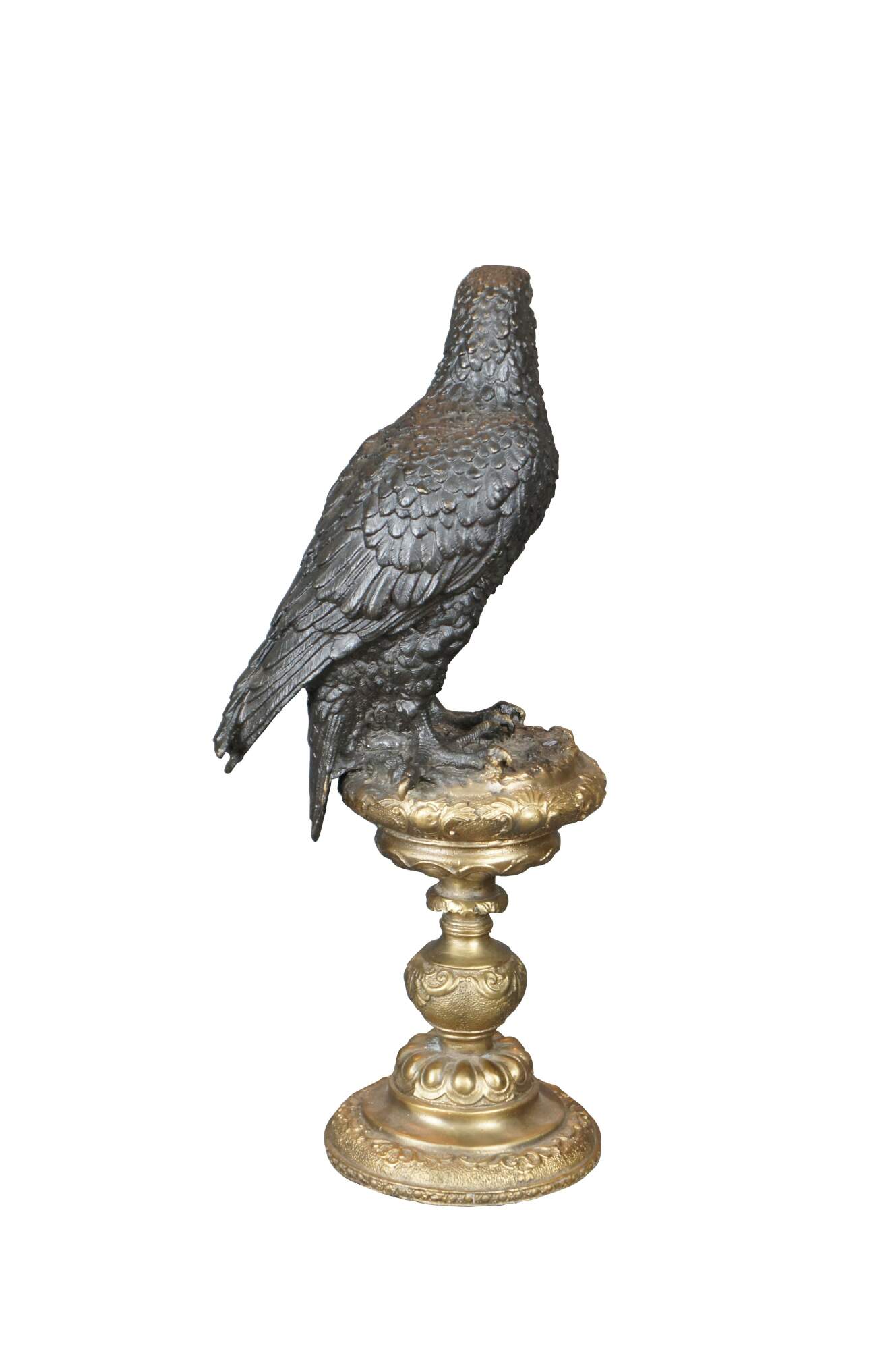 An impressive bronze eagle over an altar stick after Archibald Thorburn (Scottish 1860-1935). Features a bronze figure of a perched golden eagle. The eagle is in black with a gold beak over an ornate gold finished pedestal / altar stick. A beautiful representation that displays well in any setting.