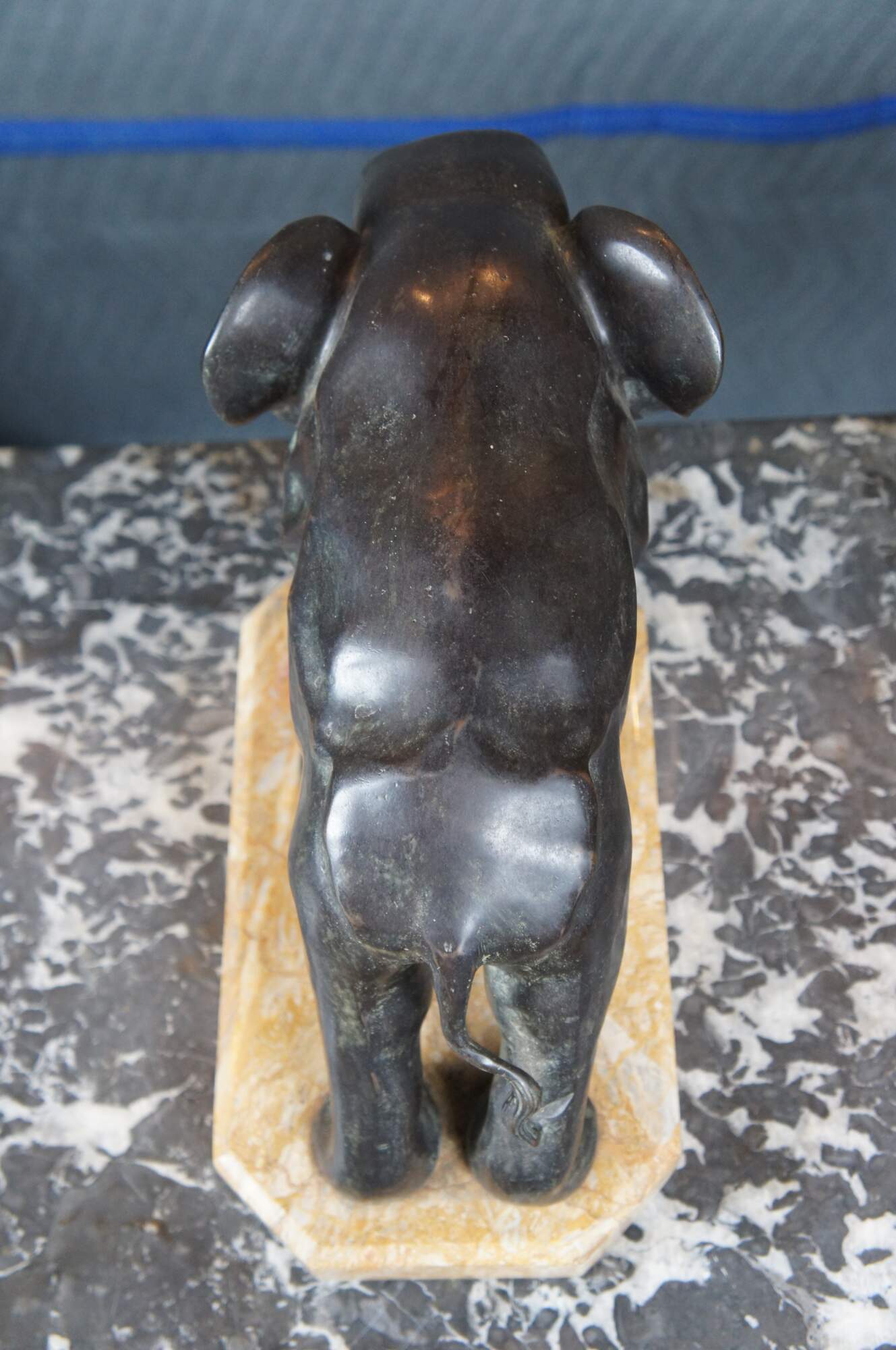 Art Deco bronze bookend, circa 1920s. An uncommon large size, depicting an elephant leaning forward bracing to hold up a row of books.