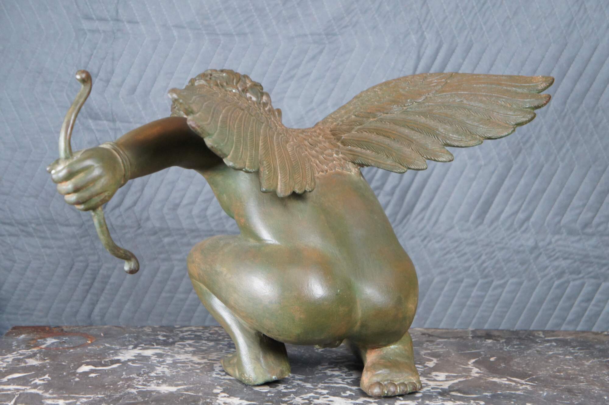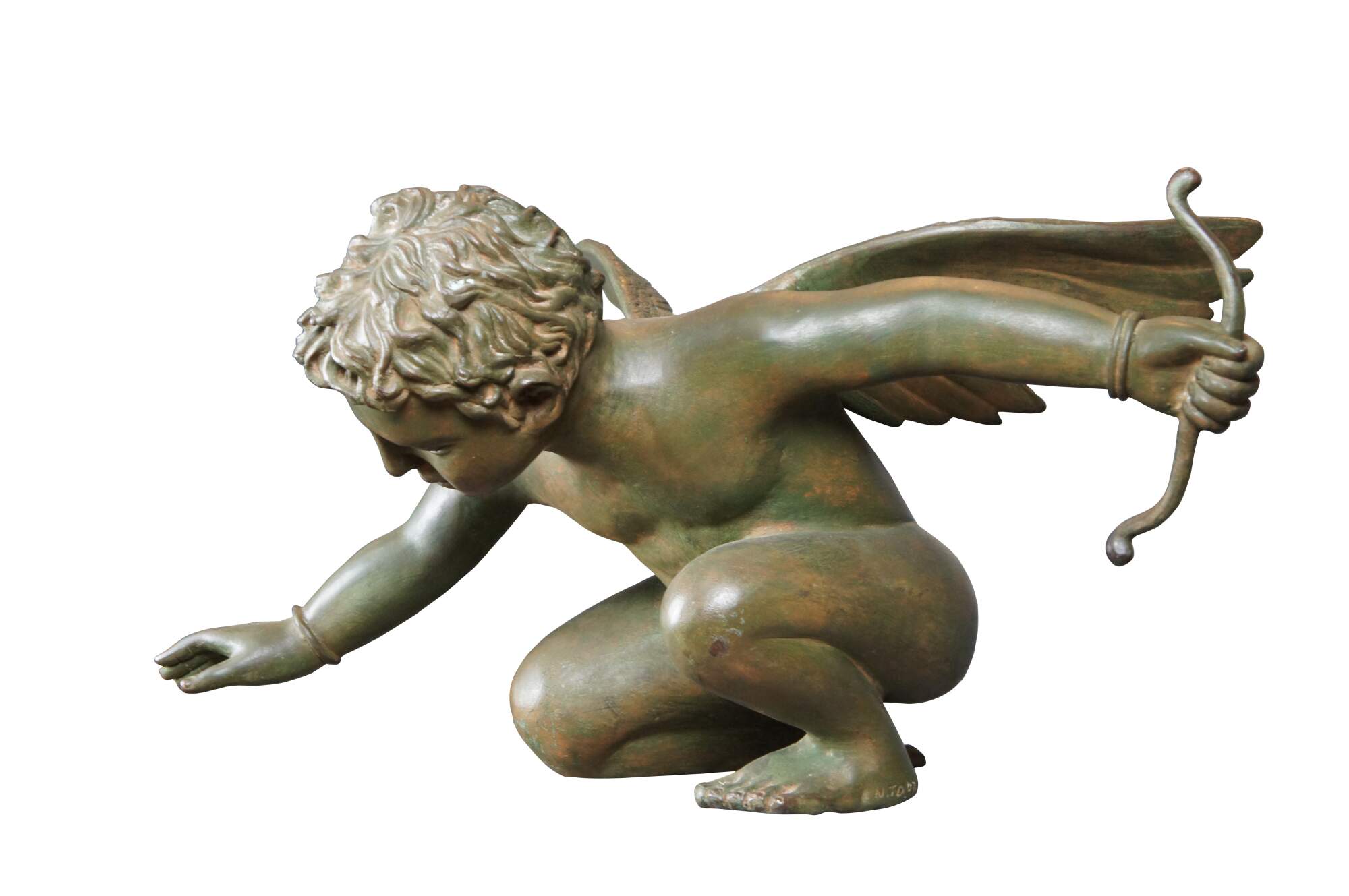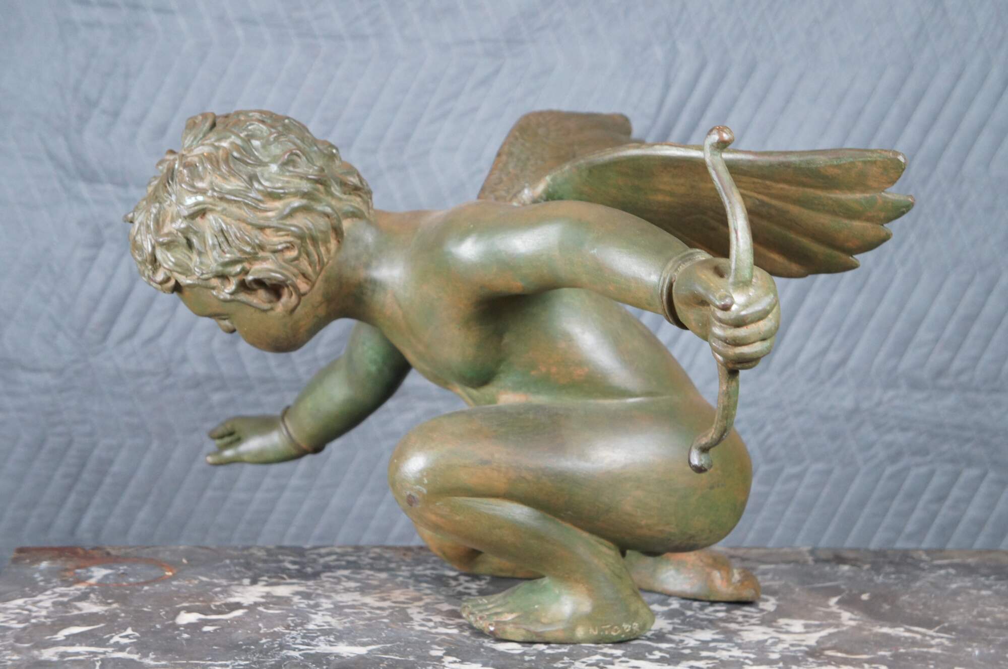 Features a winged cherub / putti in the kneeling postion with ab outstretched arm and bow. Signed along the side of the left foot. The bronze has a beautiful verdigris patina.