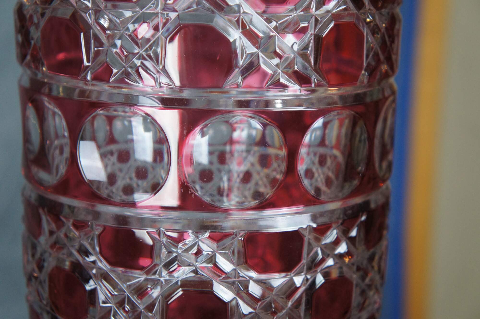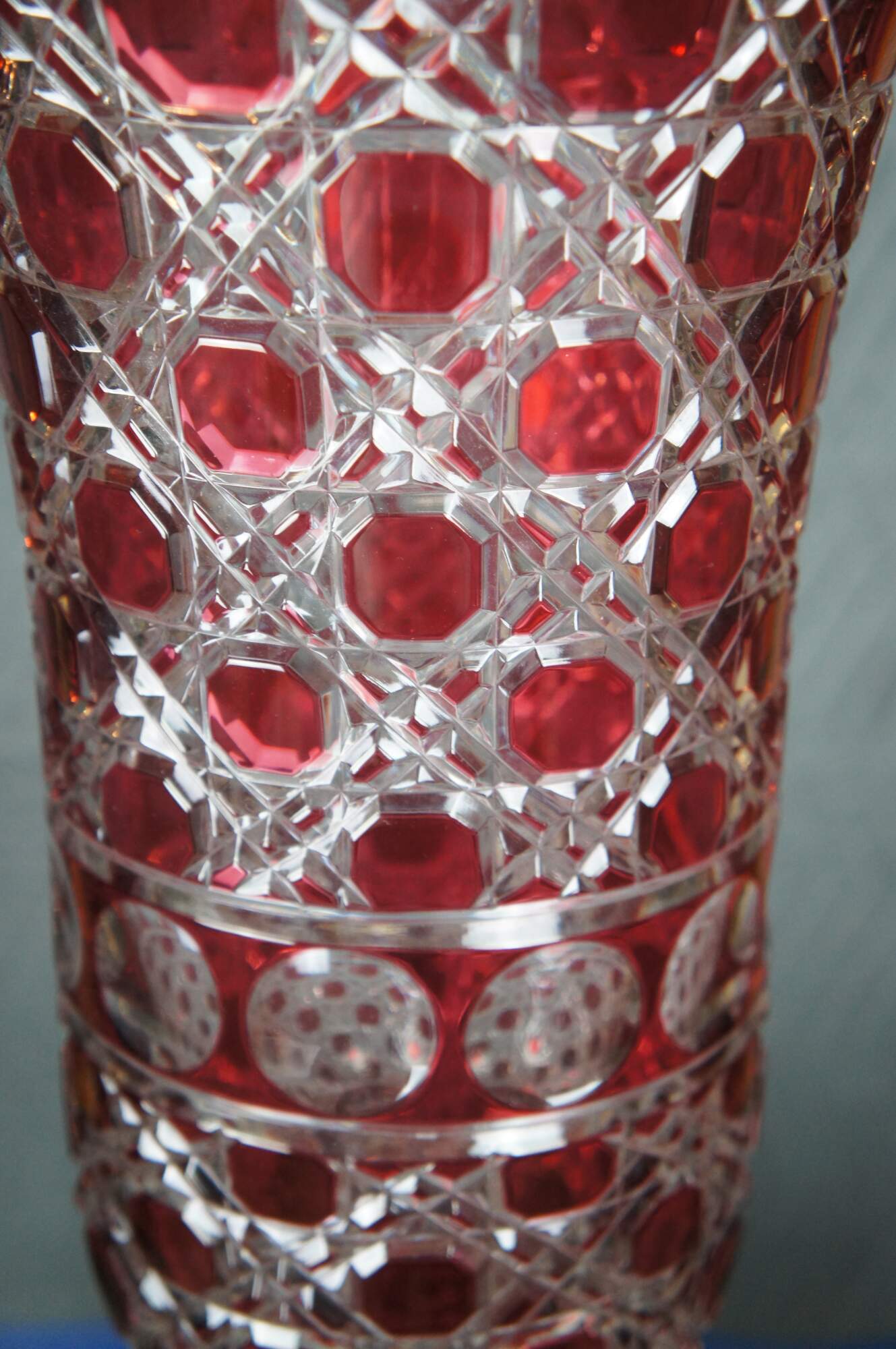 An impressive vintage Bohemian ruby cut to clear crystal vase. Features a coin dot and lattice pattern with sawtooth flared mouth. The vases is poised on a footed base.