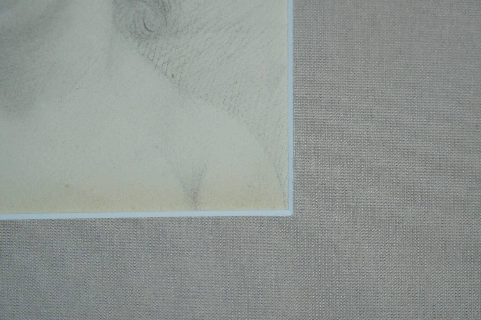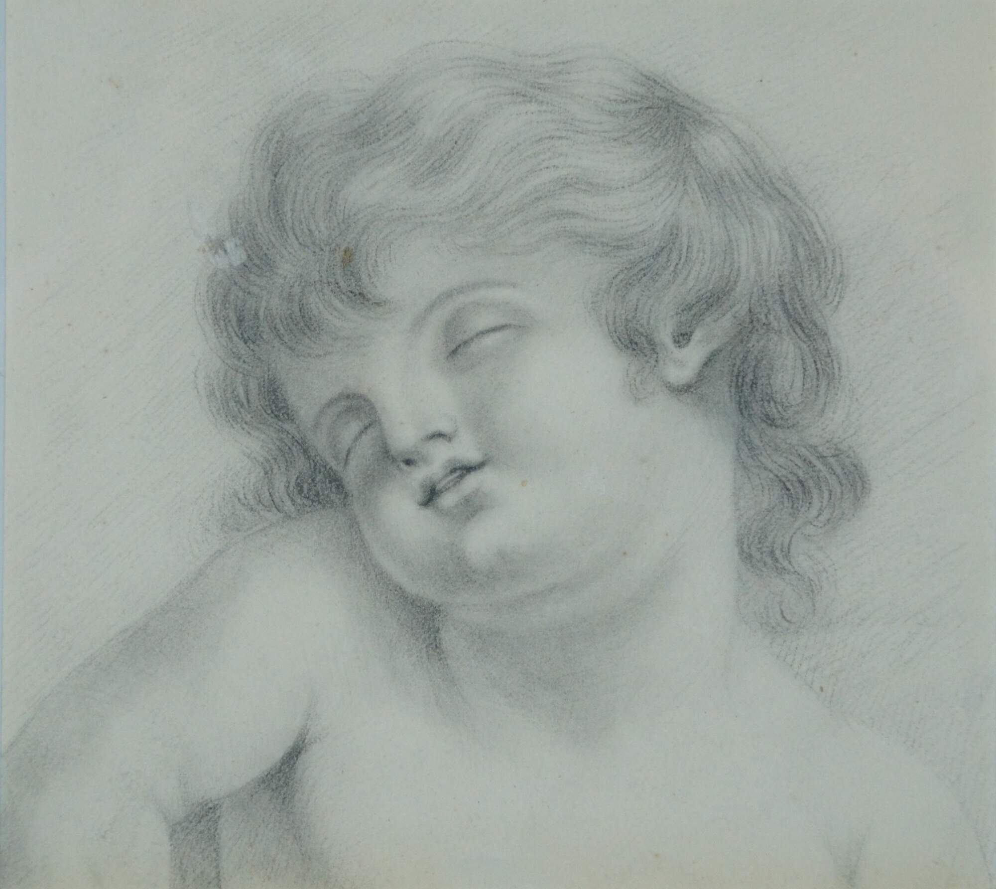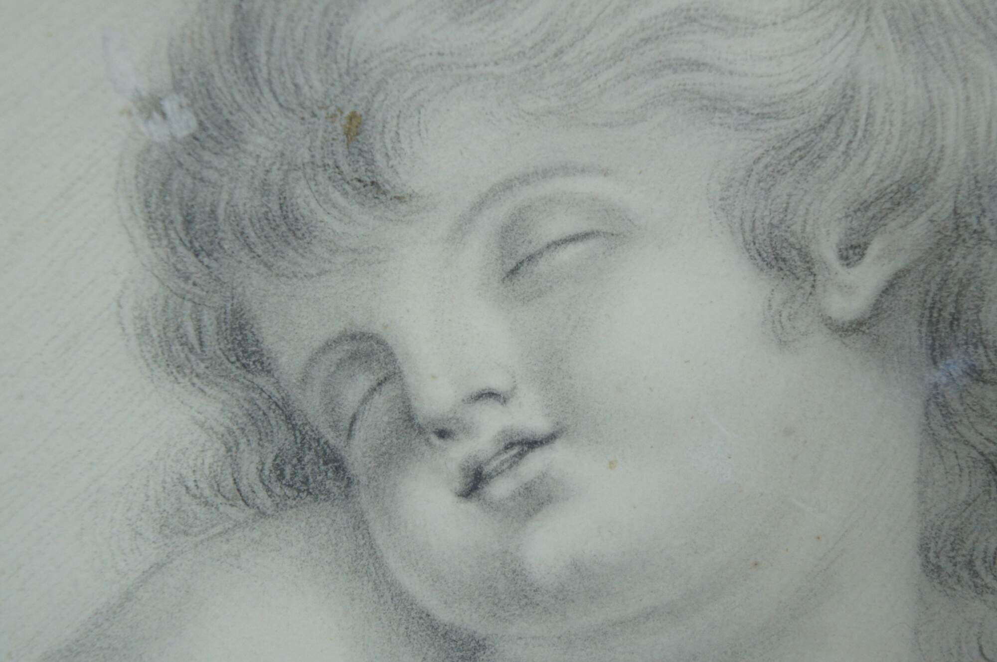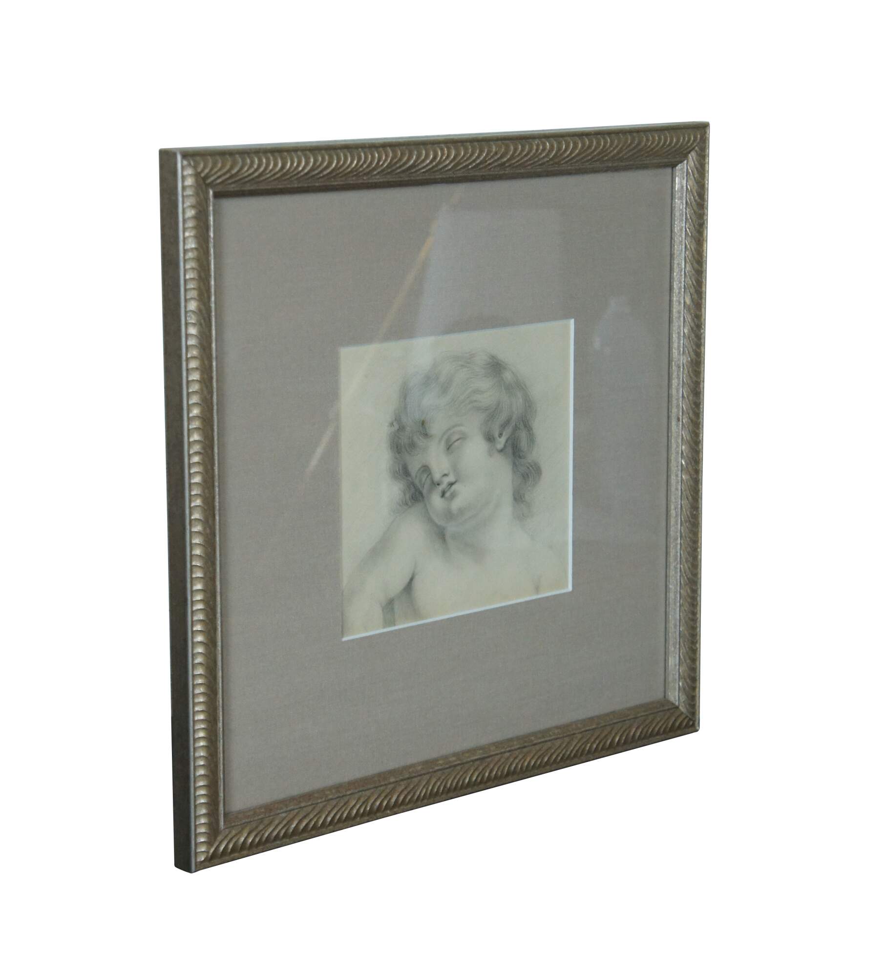 Vintage Renaissance style pencil sketch showing the face a of a sleeping child. Resembles baby Jesus, Madonna and Child (Virgin Mary and baby Jesus). Carved champagne gilt frame; gray mat.