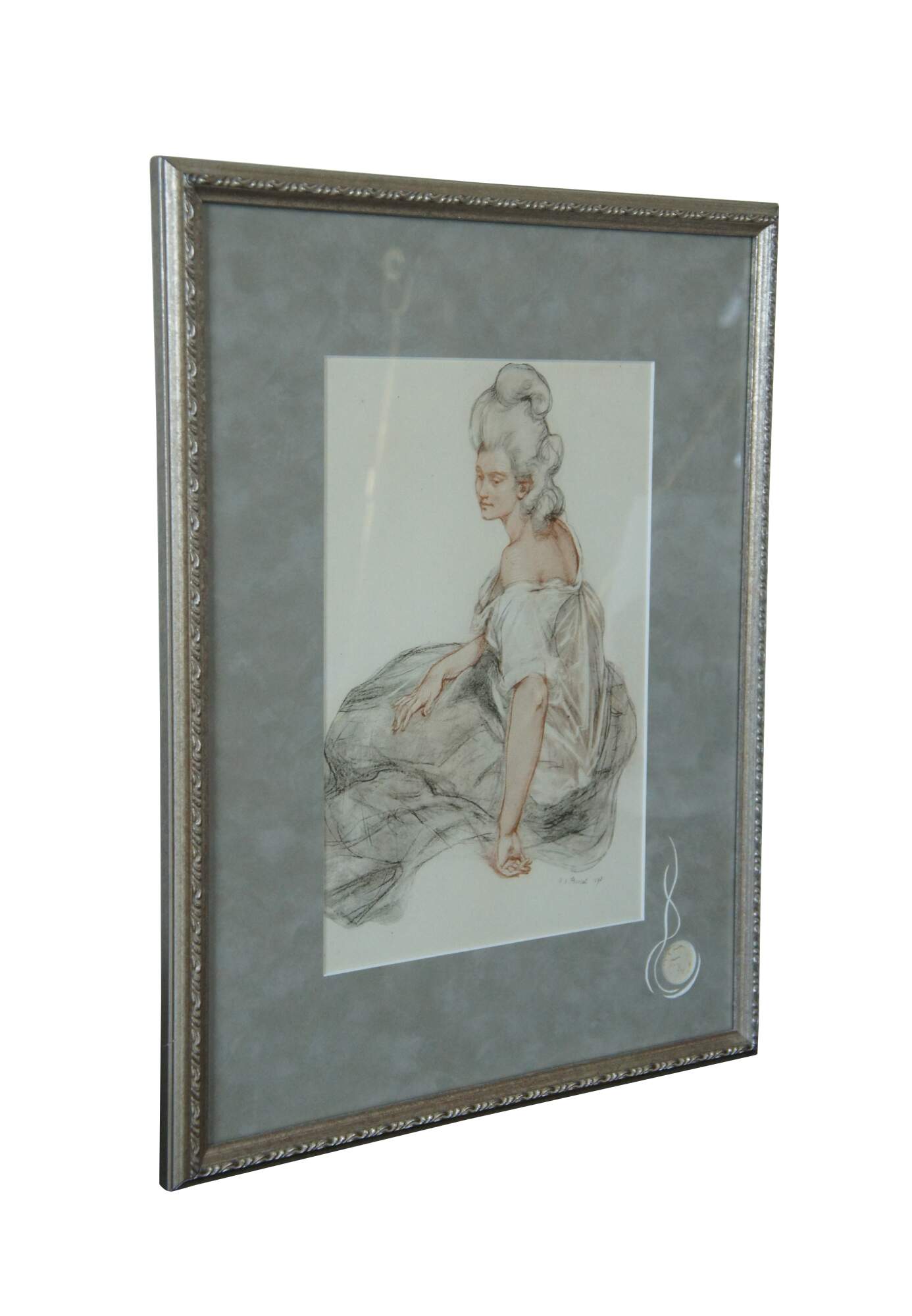 Late 19th century antique color lithograph print titled "Manon" by Rene-Xavier Francois Prinet. Shows a female figure with tall Pompador hair do, seated, looking over her left shoulder, dressed in a loose white chemise. Giltwood frame with raised foliate detail; mottled gray mat. Lithograph on wove paper. Signed on the plate lower right margin. L’Estampe Moderne’s blind stamp on the bottom right corner. Published by Masson & Piazza, Paris.