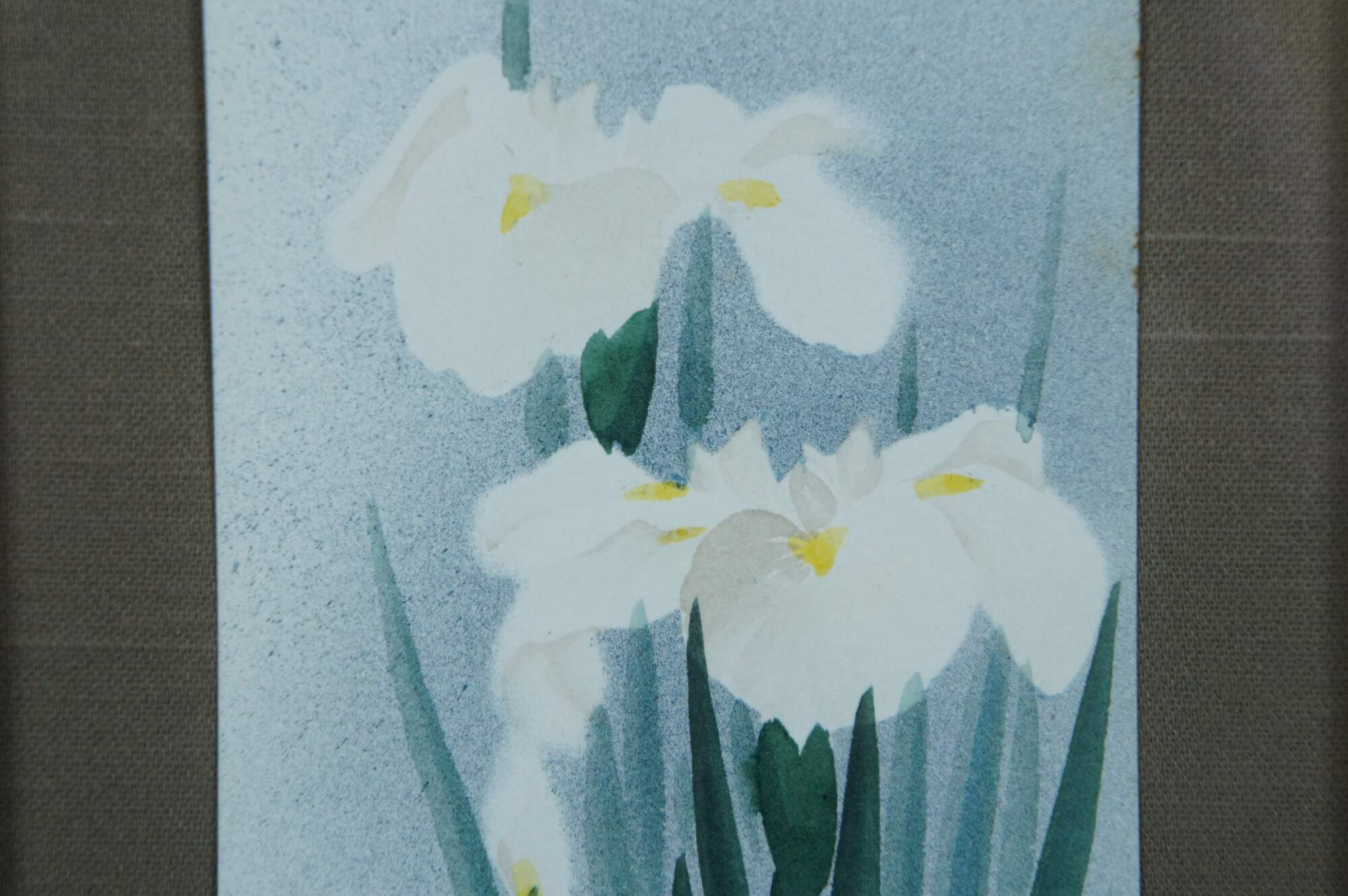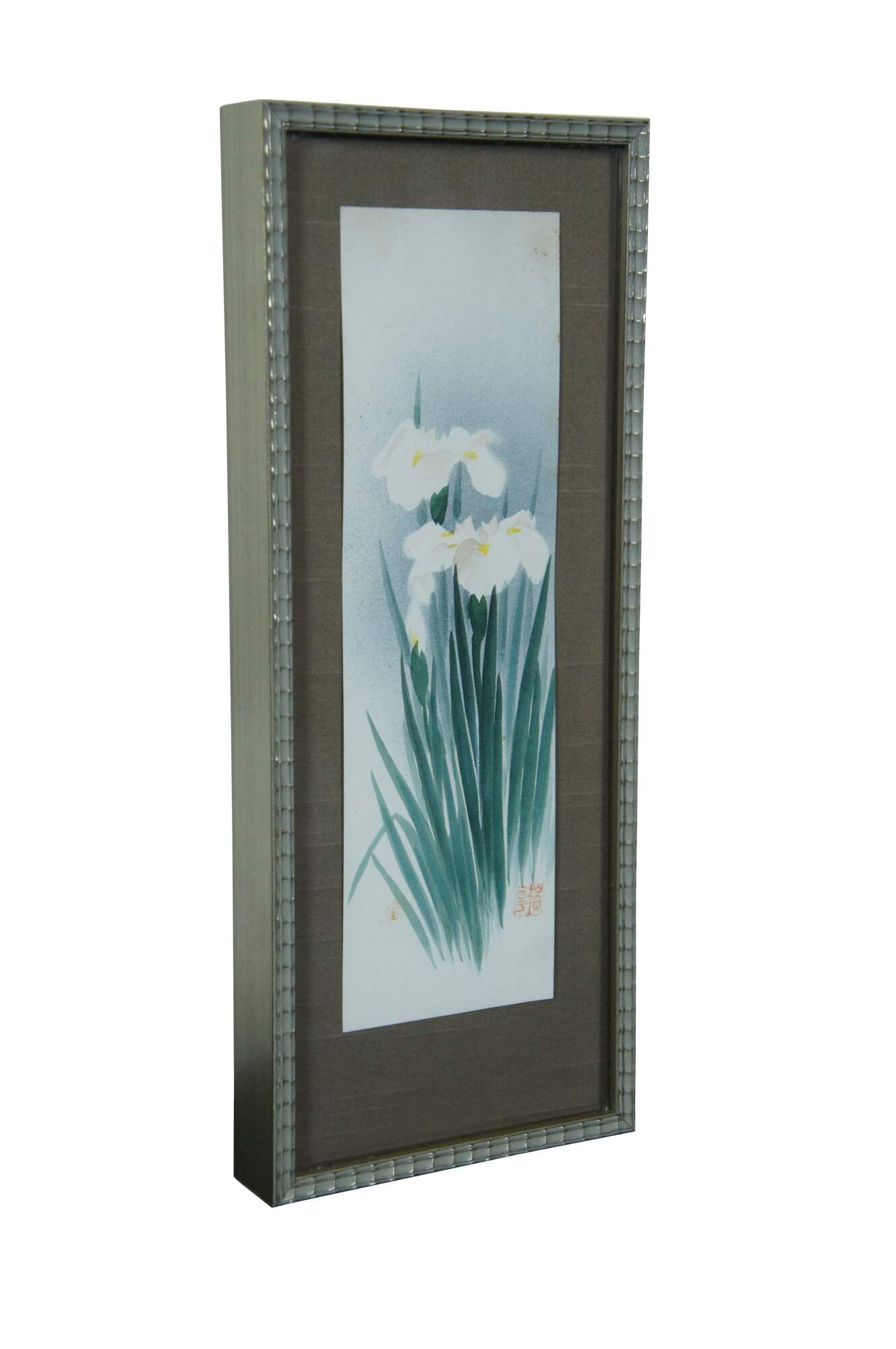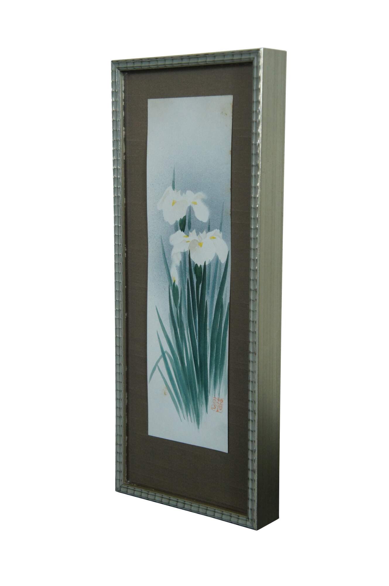 Vintage Japanese print of a strand of white irises in a blue background. Artist stamp in lower right corner. Light gray painted carved frame; brown linen mat.
