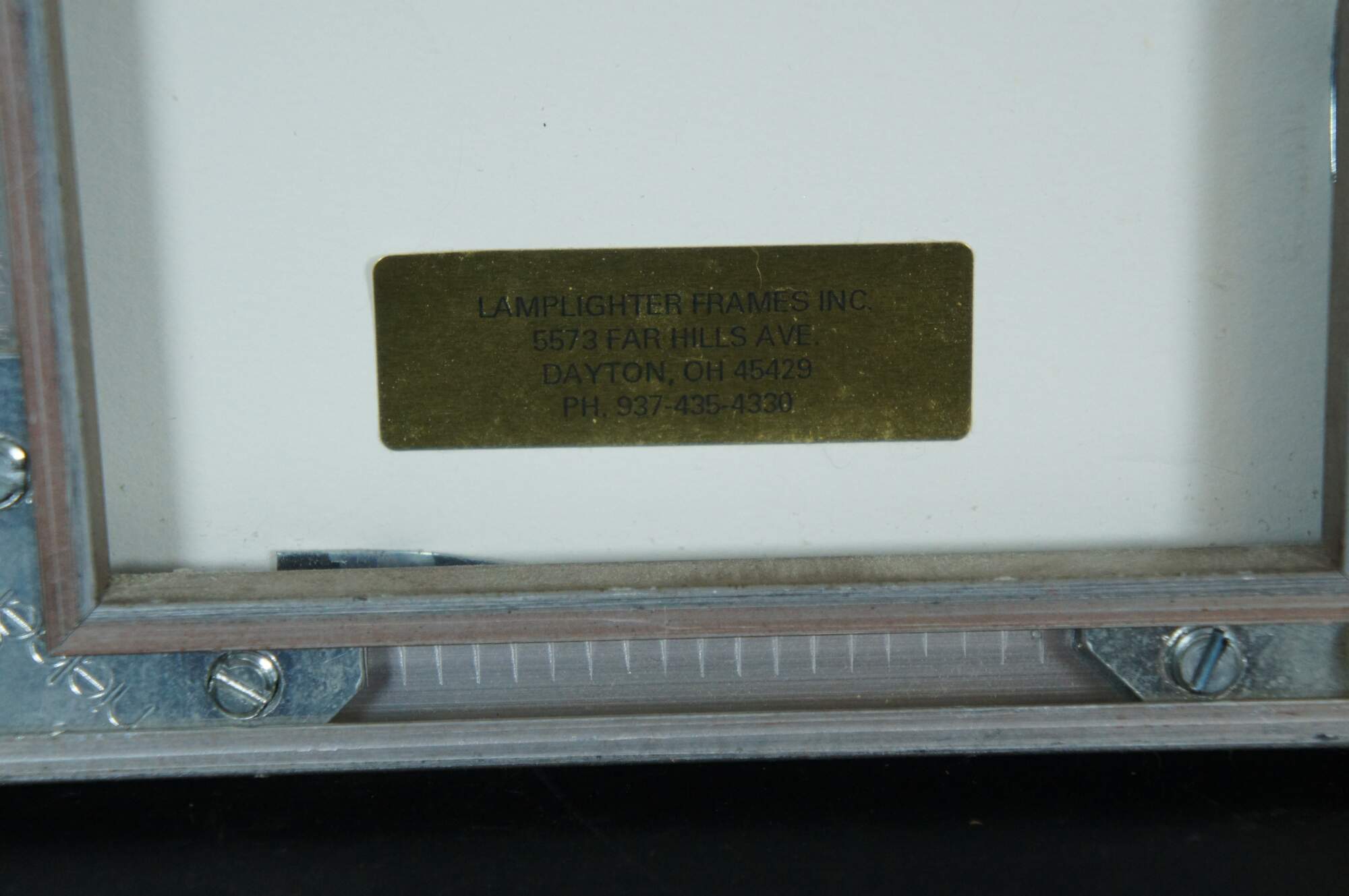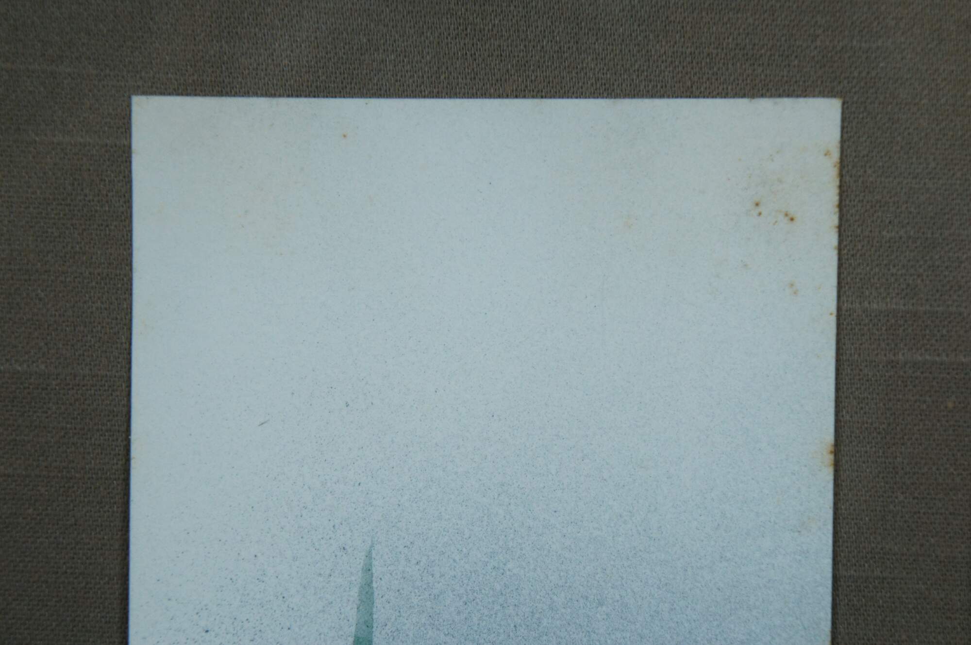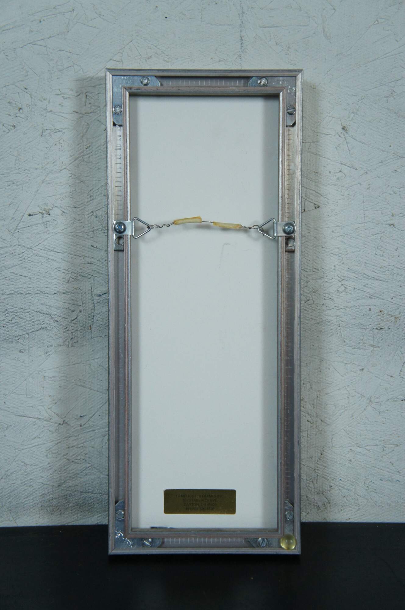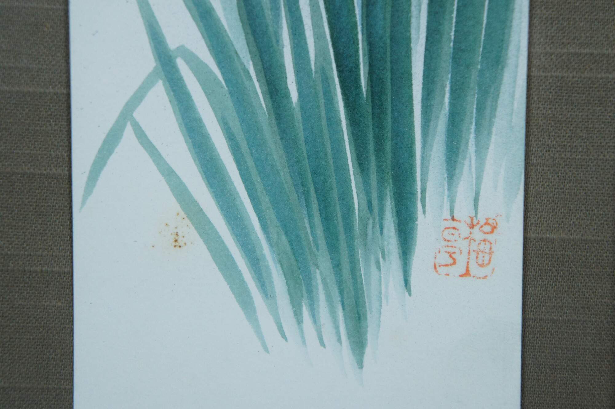 Vintage Japanese print of a strand of white irises in a blue background. Artist stamp in lower right corner. Light gray painted carved frame; brown linen mat.