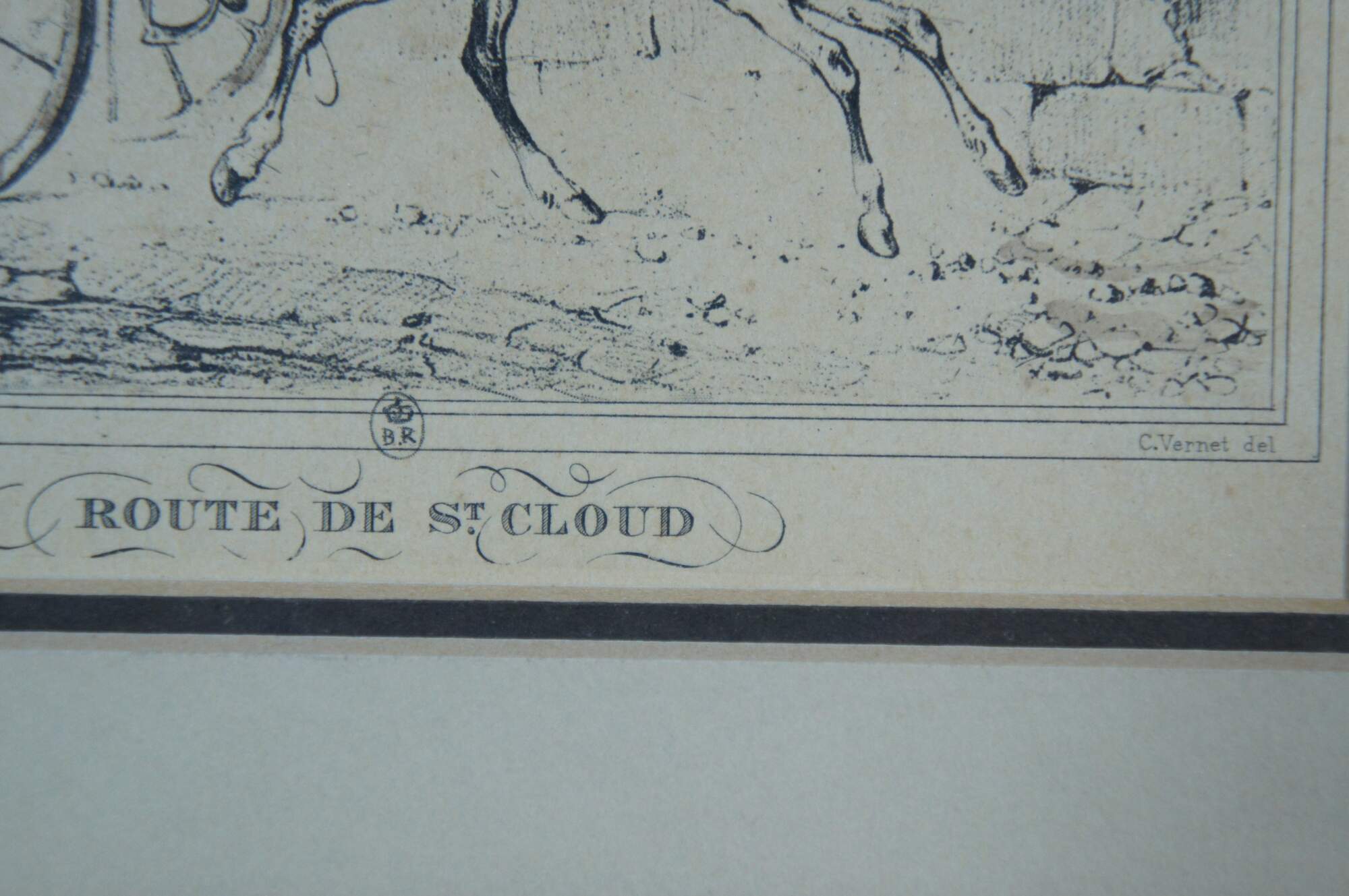 Early 19th century French aquatint engraving titled "Route de St. Cloud" after Carle Vernet's series Scènes de la vie quotidienne, Route et Chemins (Scenes of Daily Life, Roads and Paths). It features a equestrian scene with horse pulling carriage / buggy packed with passengers along a cobbled stone road. Published circa 1816 by Bance. Marked with a crowned BR in an oval, mimicking a British Royal cypher. Giltwood frame with raised bevel; off white and black layered mat.