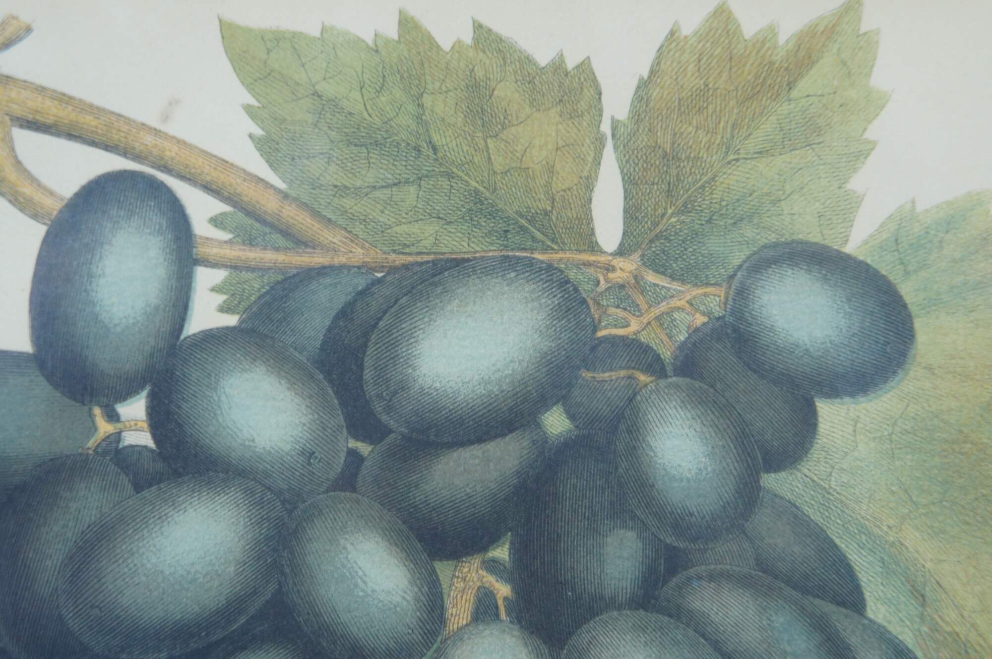 Antique circa 1870s color lithograph print of "Madresfield Court Grape" extracted from the book "The New Practical Gardener, and Modern Horticulturist," edited by James Anderson, published by William Mackenzie. Beveled giltwood frame with bunches of plumes carved along the edge; blue mat.