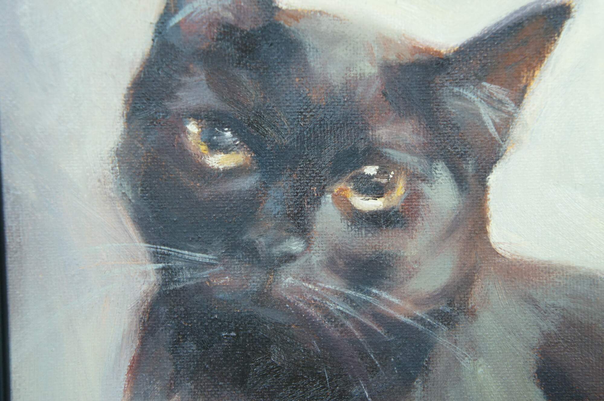 Late 20th century oil on canvas painting of a seated black cat with yellow eyes. Signed RH in lower left corner.