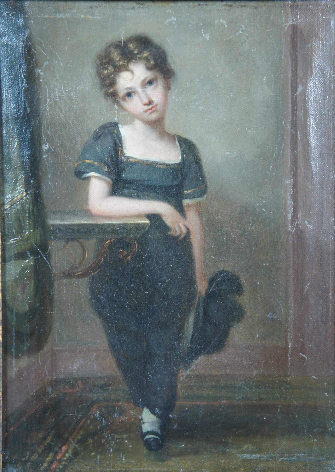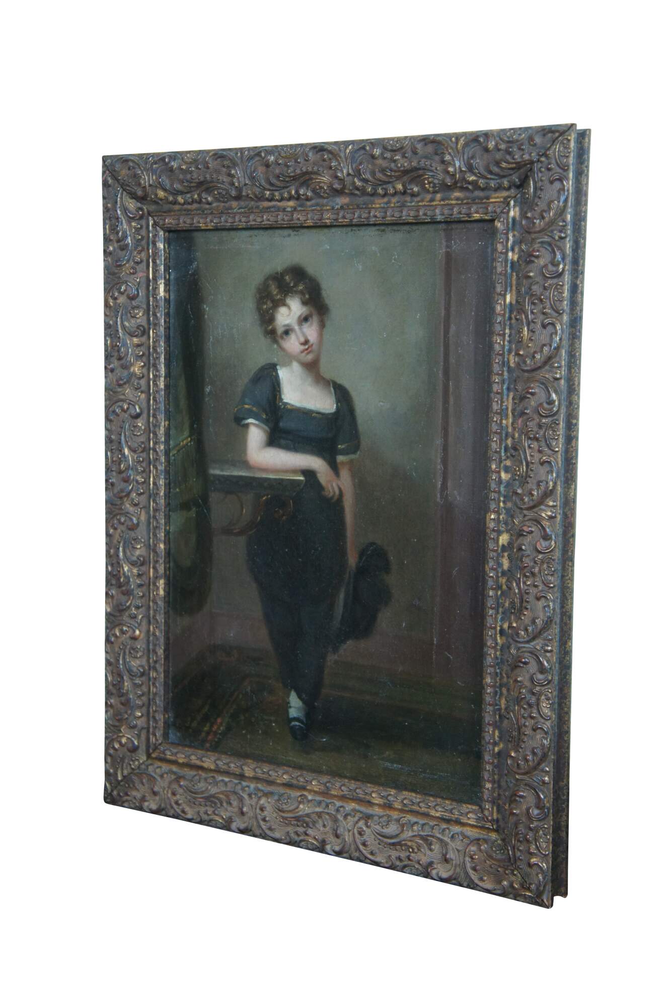 19th century antique portrait oil painting on canvas of a sassy young girl with blonde curls and large blue eyes, dressed in dark clothes, holding a hat. Gilded / distressed foliate carved frame.