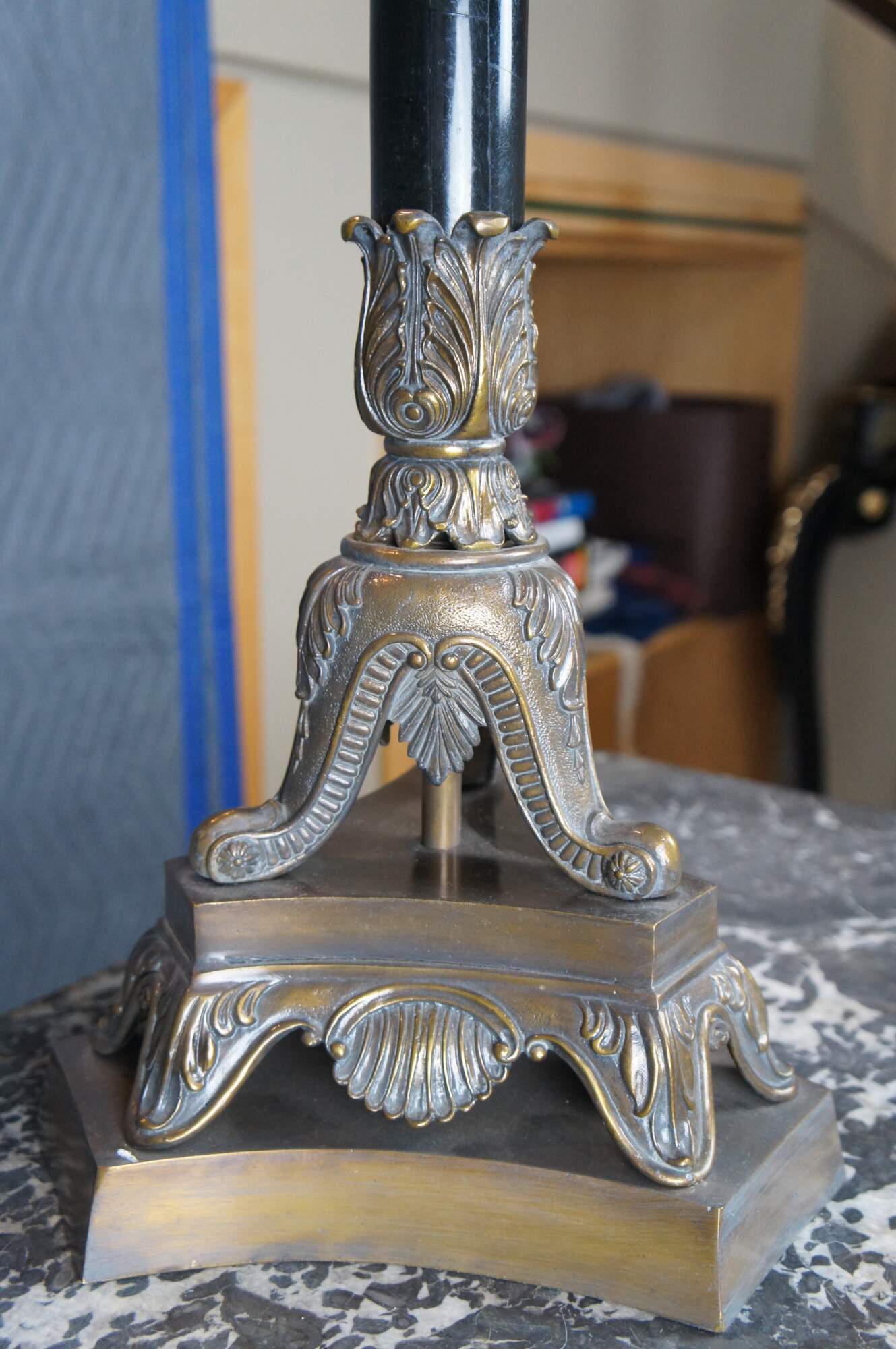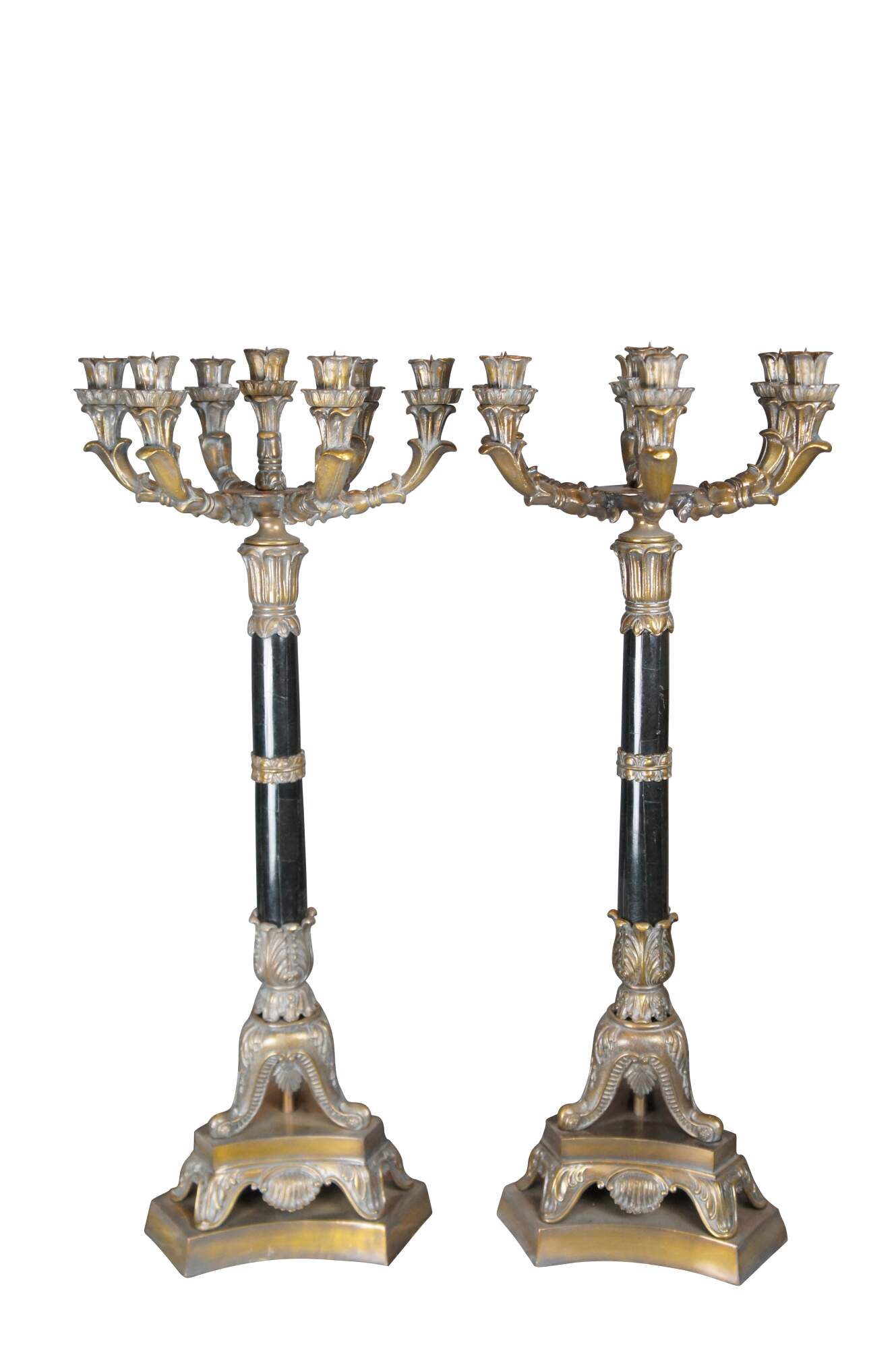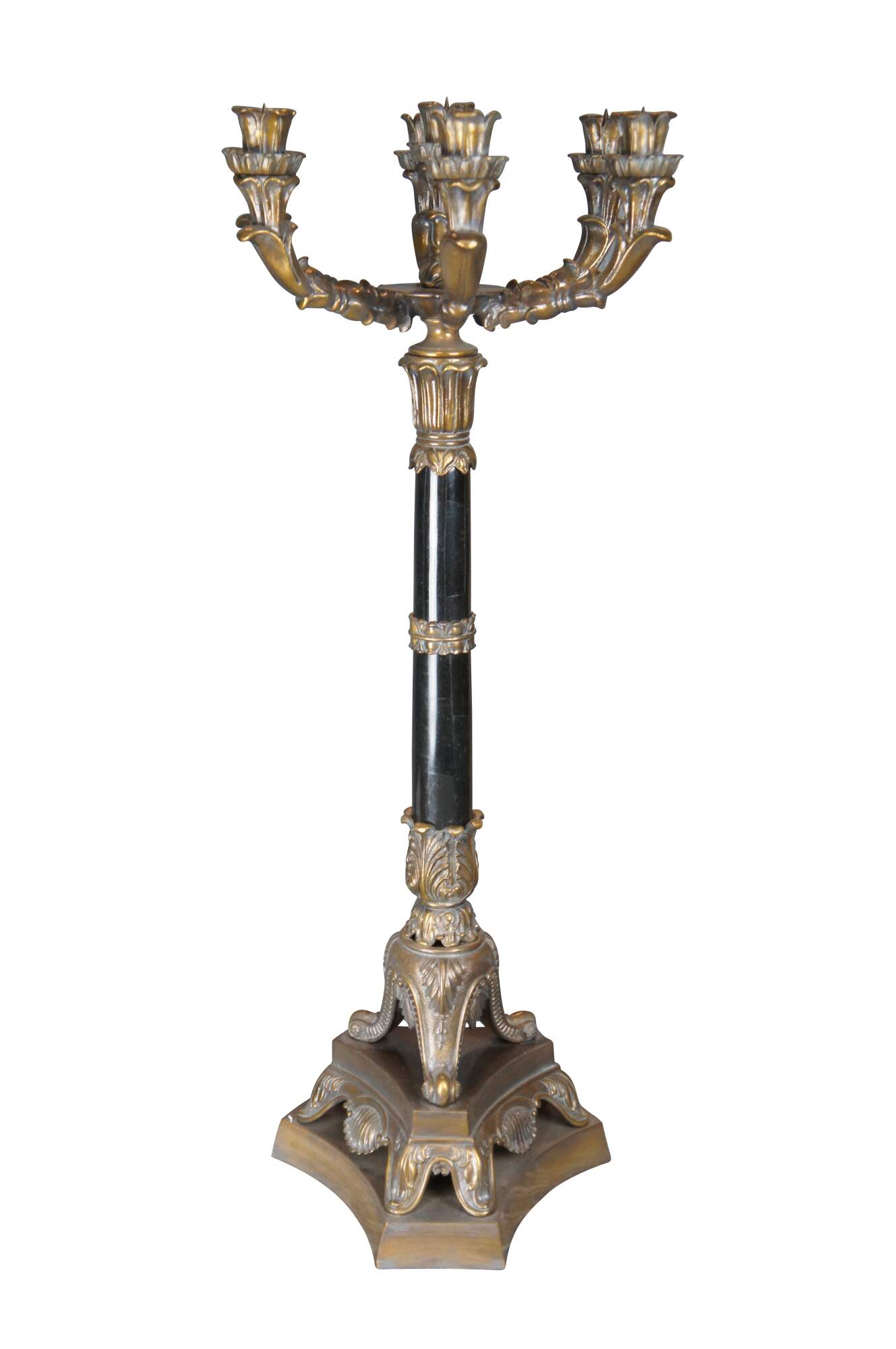 A large pair of Maitland Smith candlesticks, circa last quarter 20th century. Features French styling with exceptional craftmanship. Each candle holder is made from bronze with a seven light candelabra along the top over a central Grecian column with tessellated marble, foliate and acanthus motif. The candle stick is mounted on tripod with downswept legs over a layer tri-form plinth vase.