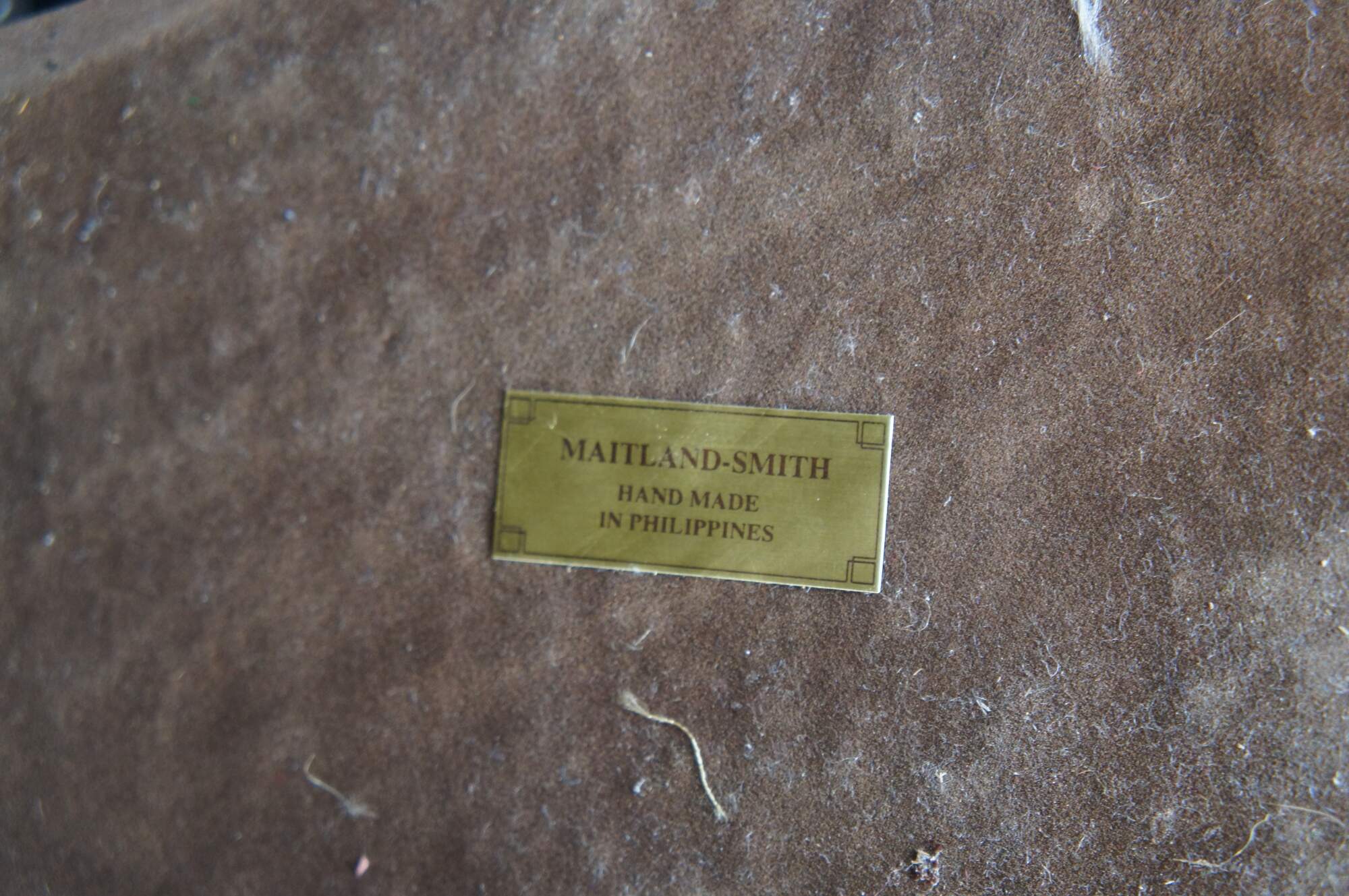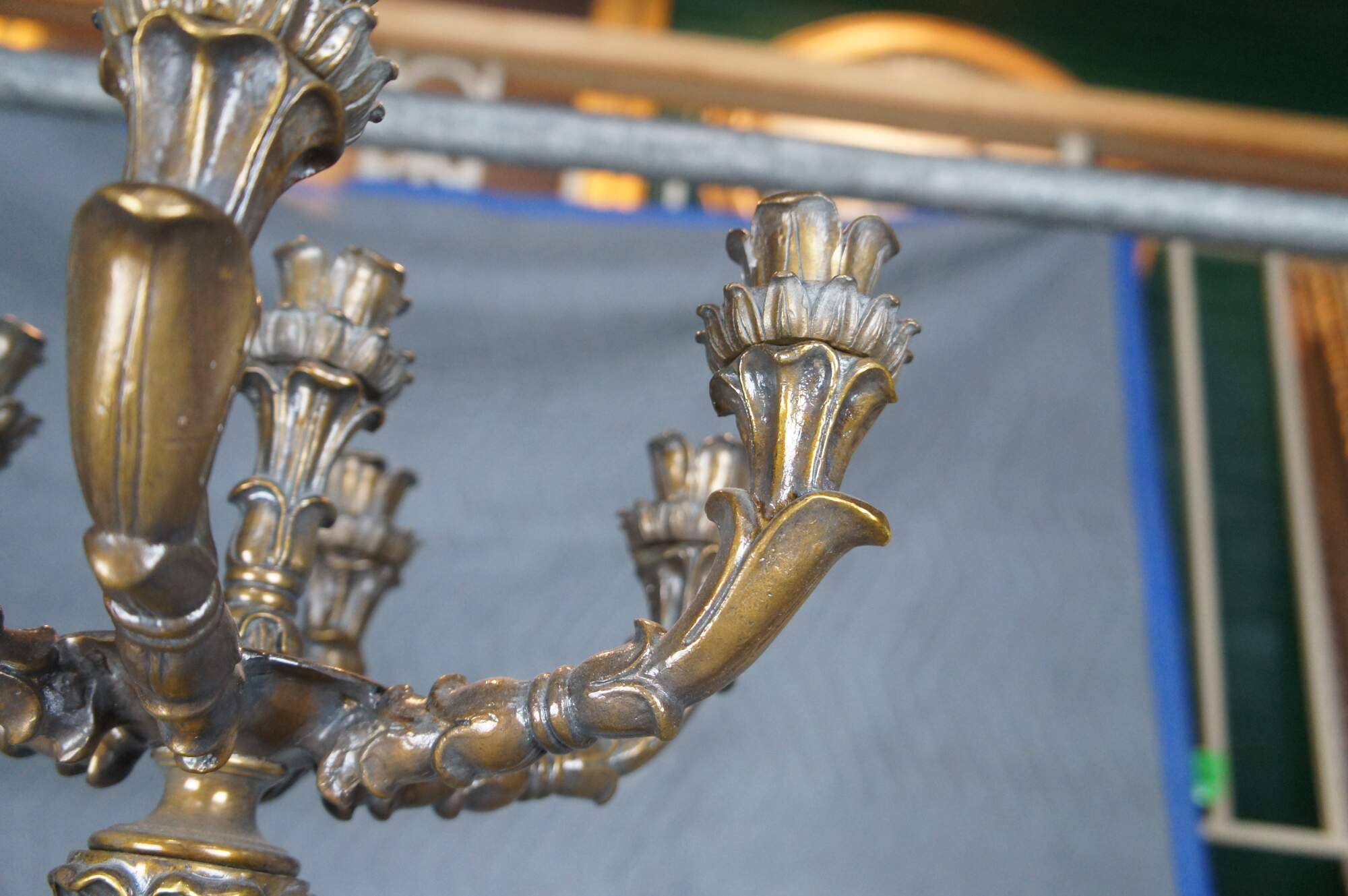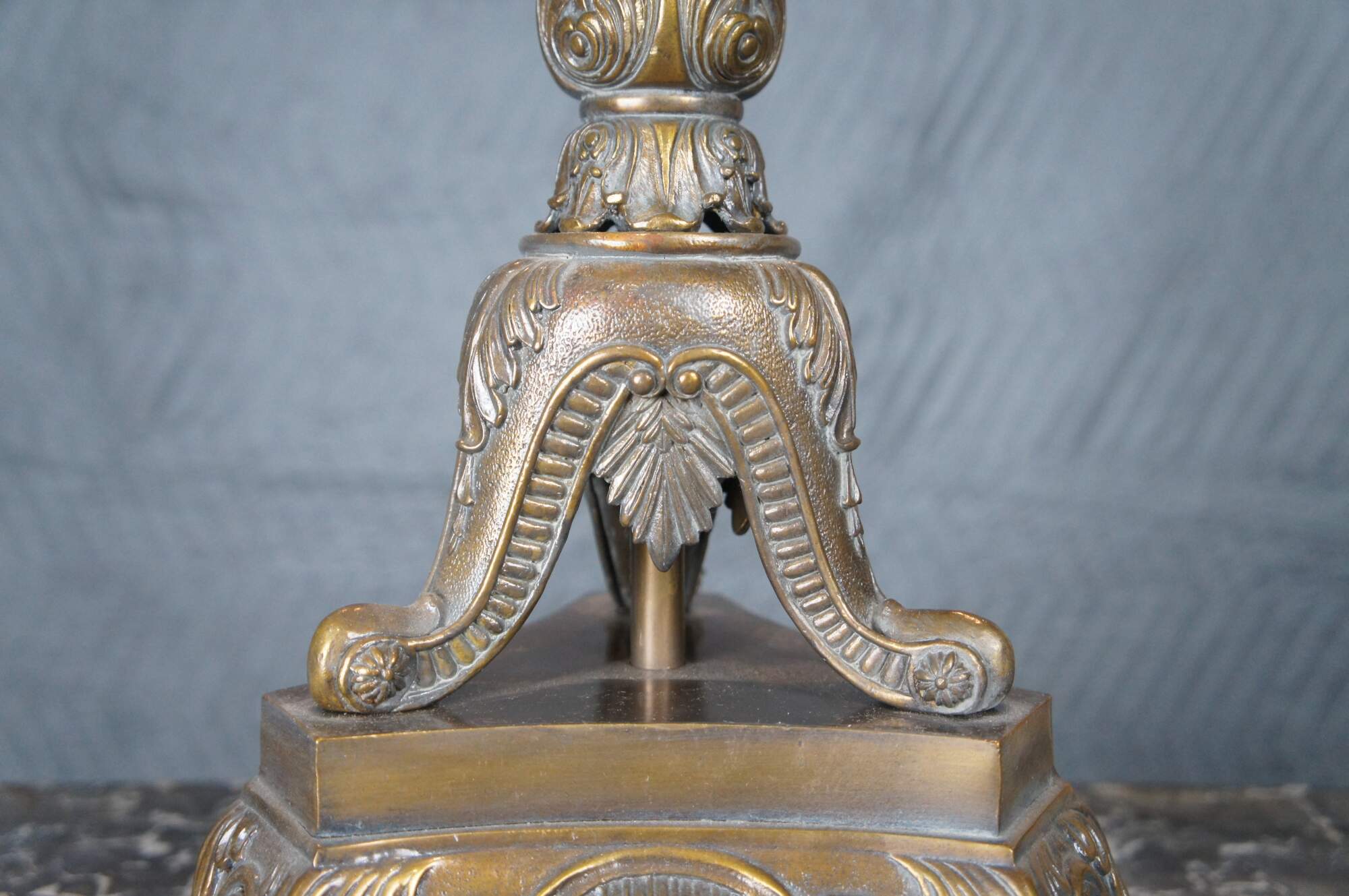 A large pair of Maitland Smith candlesticks, circa last quarter 20th century. Features French styling with exceptional craftmanship. Each candle holder is made from bronze with a seven light candelabra along the top over a central Grecian column with tessellated marble, foliate and acanthus motif. The candle stick is mounted on tripod with downswept legs over a layer tri-form plinth vase.
