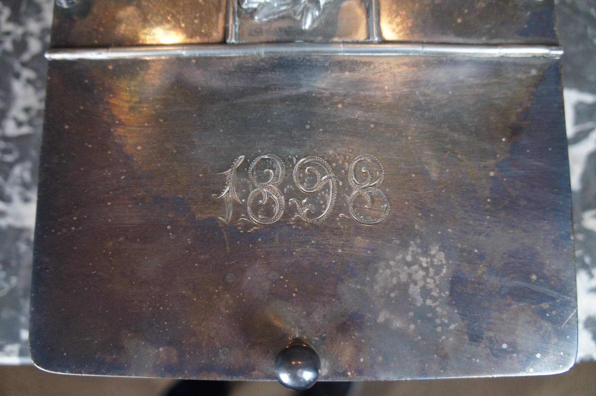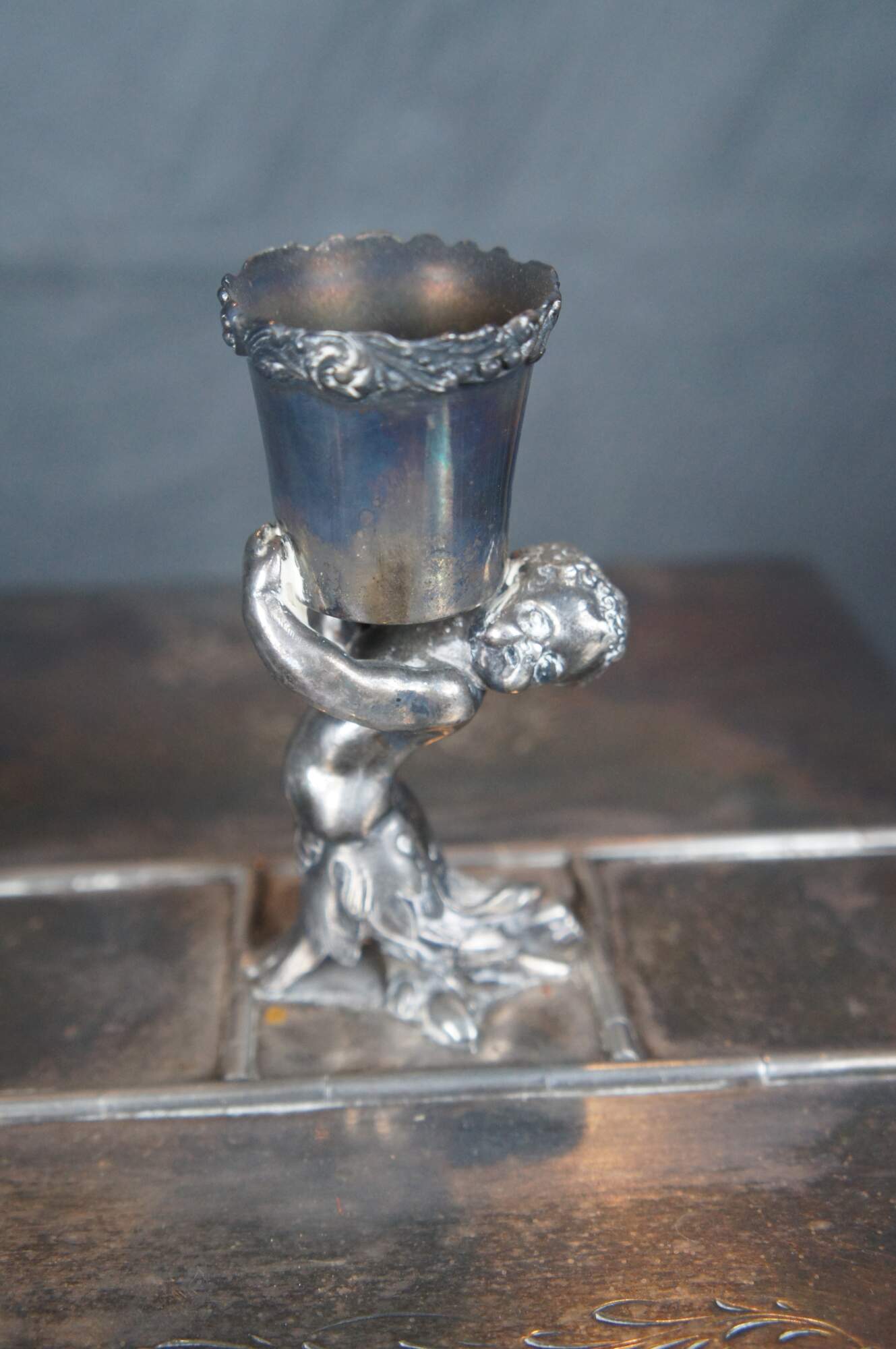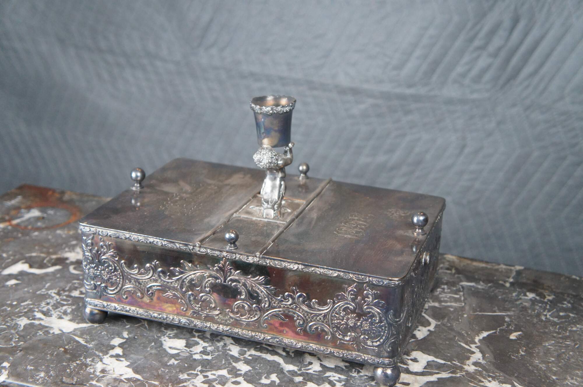 A divided Humidor by Meriden B. Company, Circa 1898. Made from silverplate with chased baroque pattern. The footed box has two large compartments and two small opening that allow access to the center. Along the top is a cherub holding a candleholder allowing the user to have light when accessing their favorite kind of smoke. The Humidor is marked 1898 and monogrammed along the top. The monogram reads To Blanche from Milly. Each side has a lock.