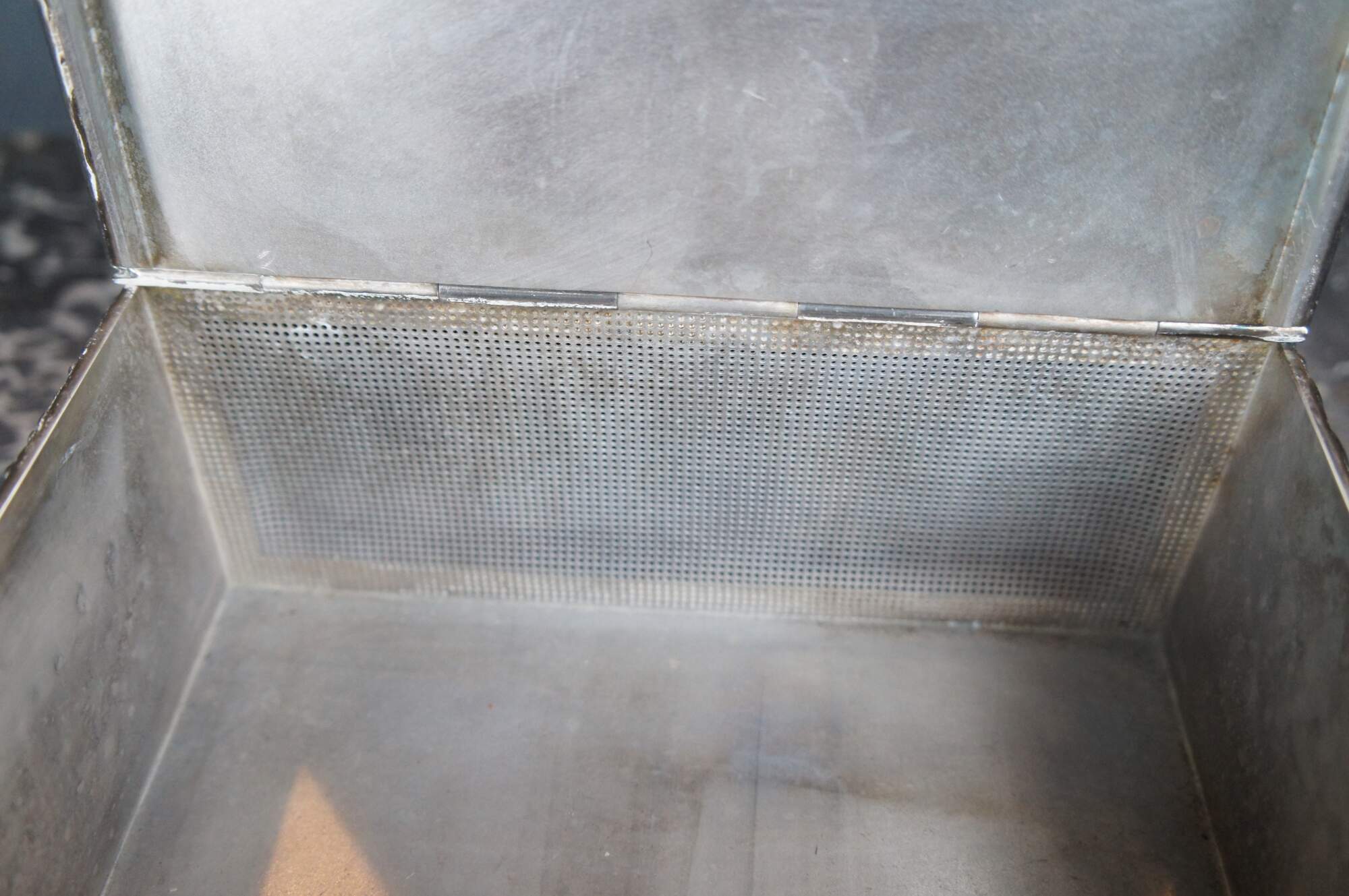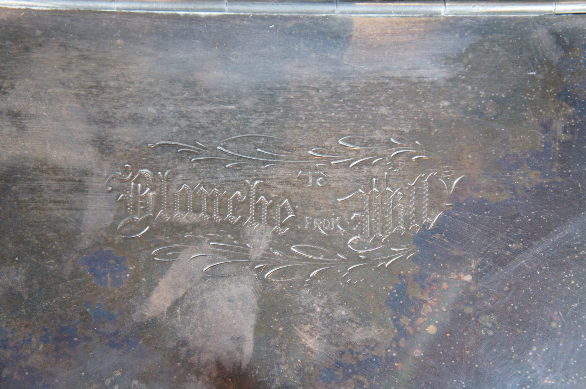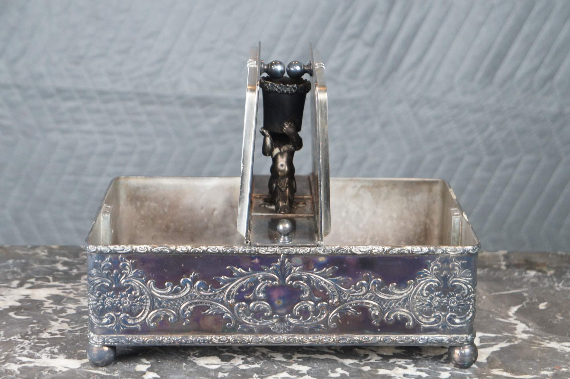 A divided Humidor by Meriden B. Company, Circa 1898. Made from silverplate with chased baroque pattern. The footed box has two large compartments and two small opening that allow access to the center. Along the top is a cherub holding a candleholder allowing the user to have light when accessing their favorite kind of smoke. The Humidor is marked 1898 and monogrammed along the top. The monogram reads To Blanche from Milly. Each side has a lock.