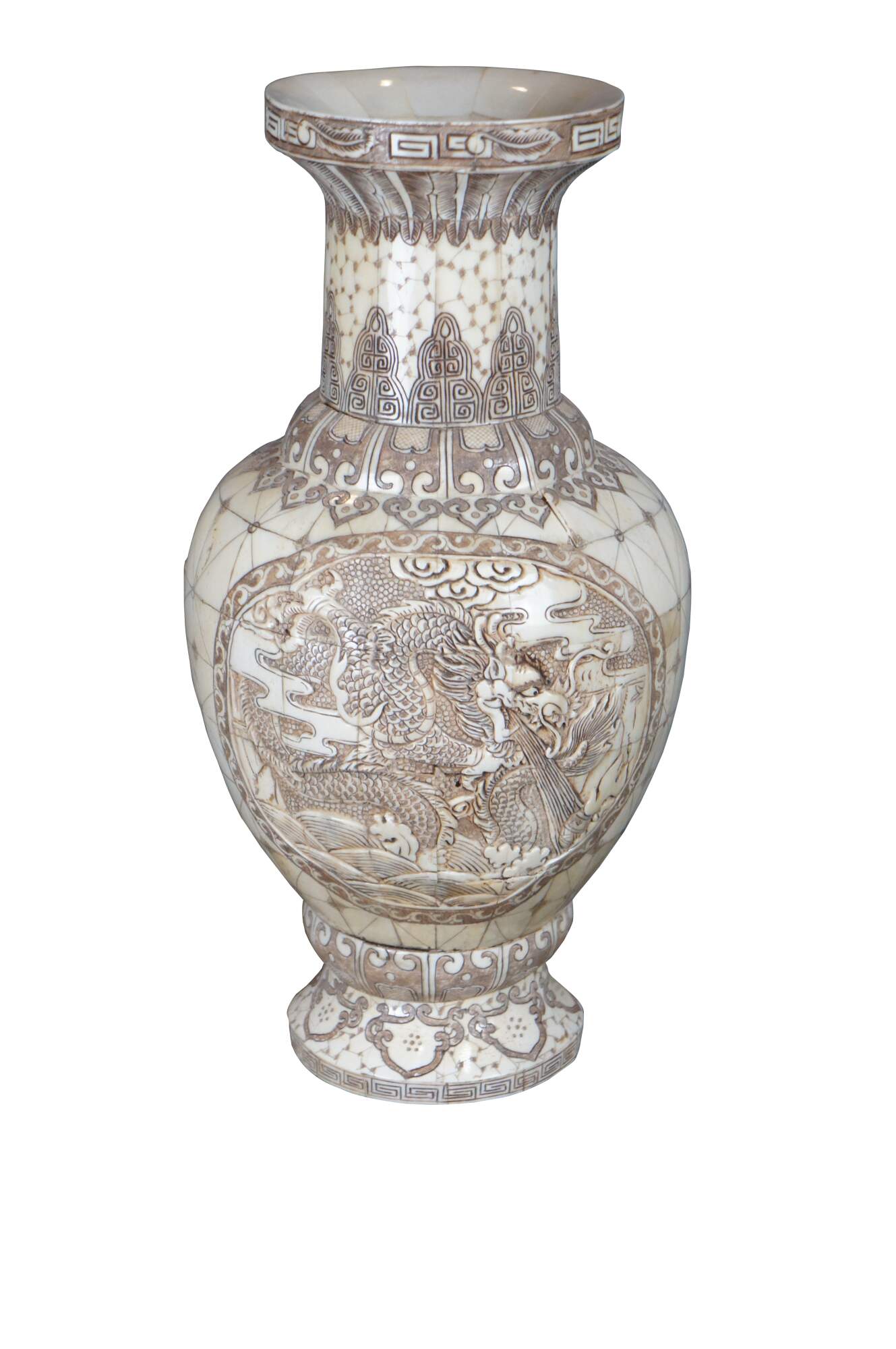 An intriguing Chinese 20th century cow bone veneered vase or bottle. Features a tessellated frame decorated on each side with to gnarling dragons and incised Chinese motifs.