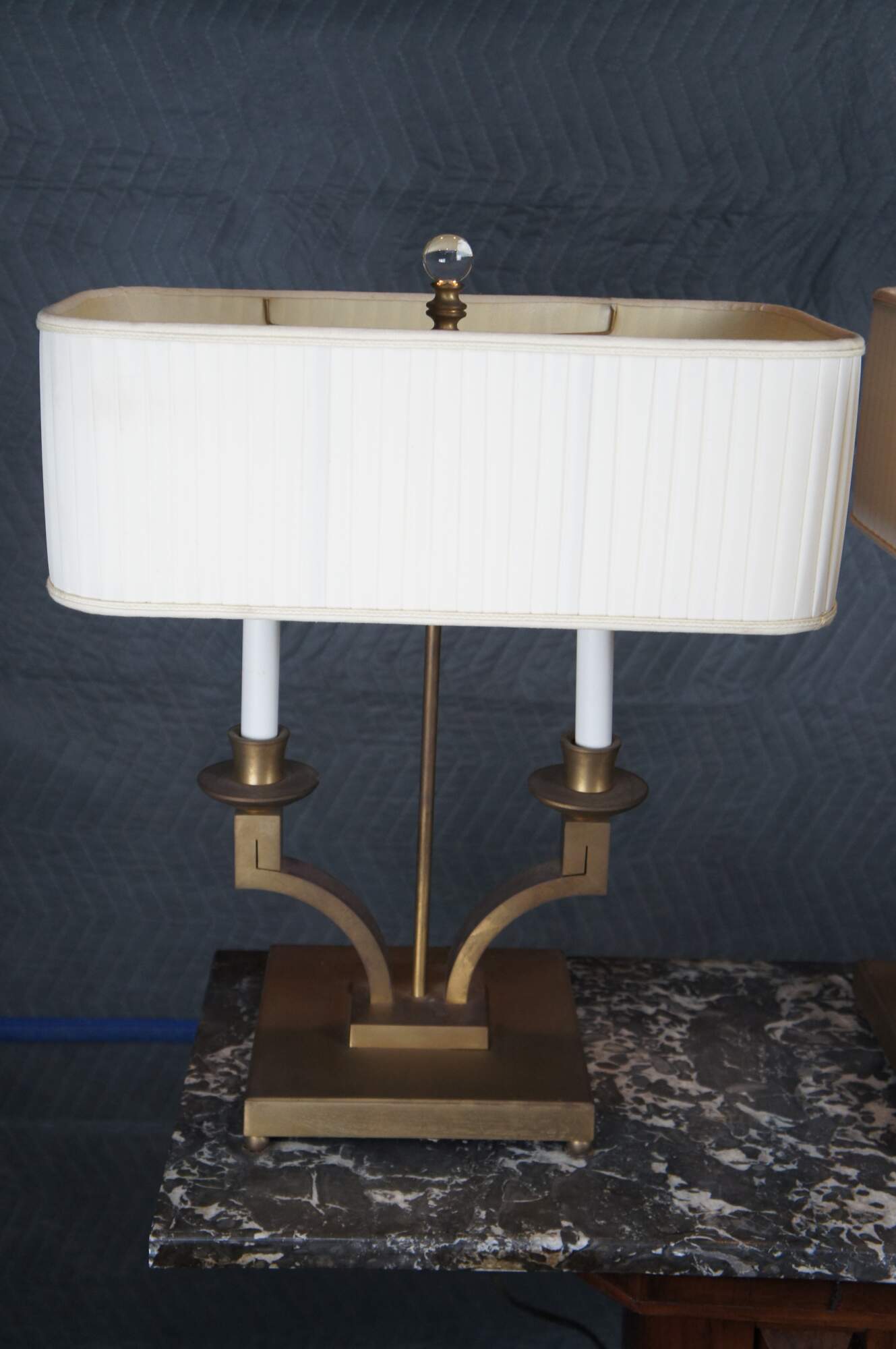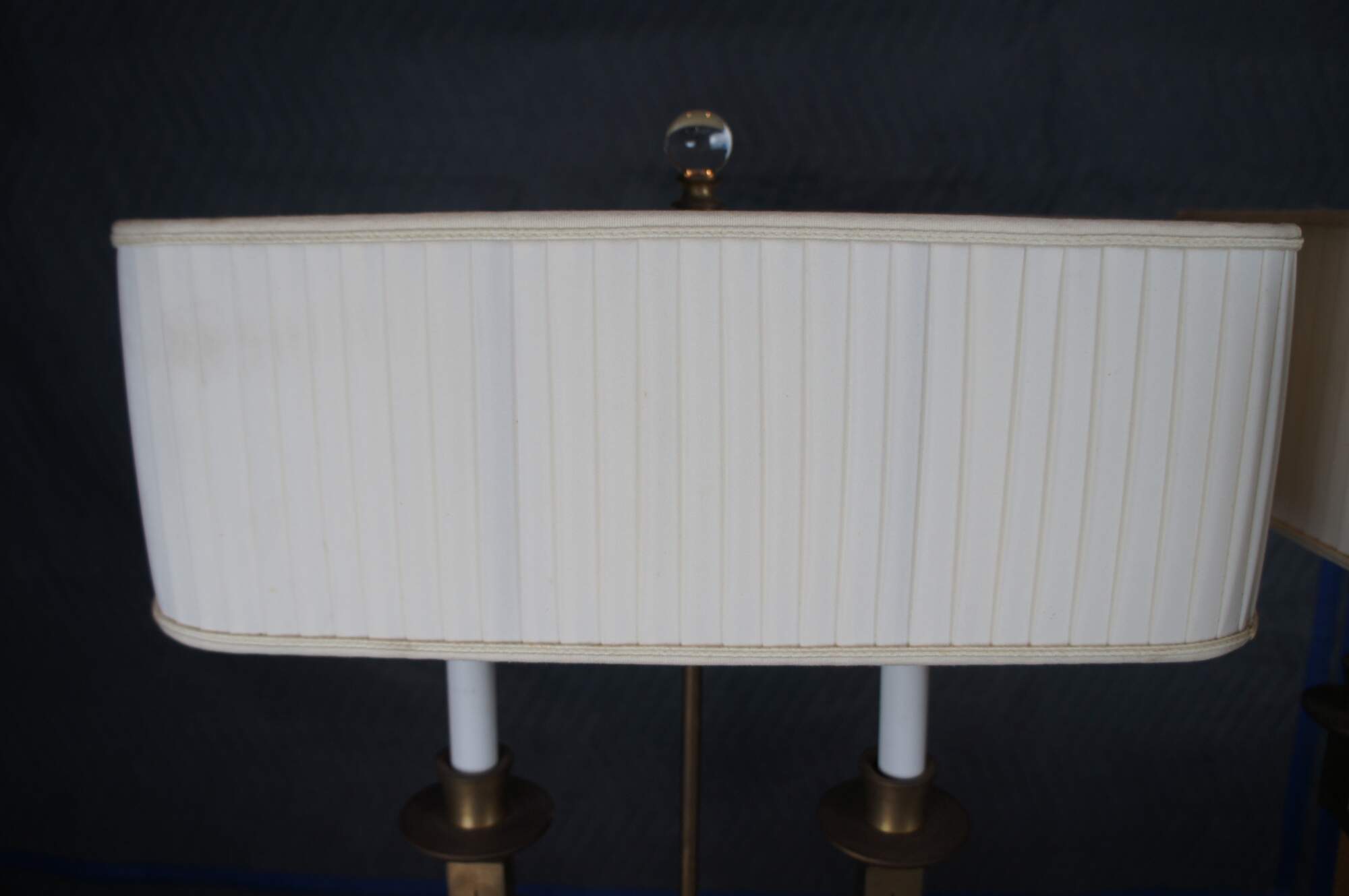 Pair of Modern Laurent Bouillotte double bulb table lamps by Baker Furniture. Part of the Jacques Garcia Collection. Finished in a Champagne colored brass base with curved pleated shade, Murano glass ball finial and round brass feet.