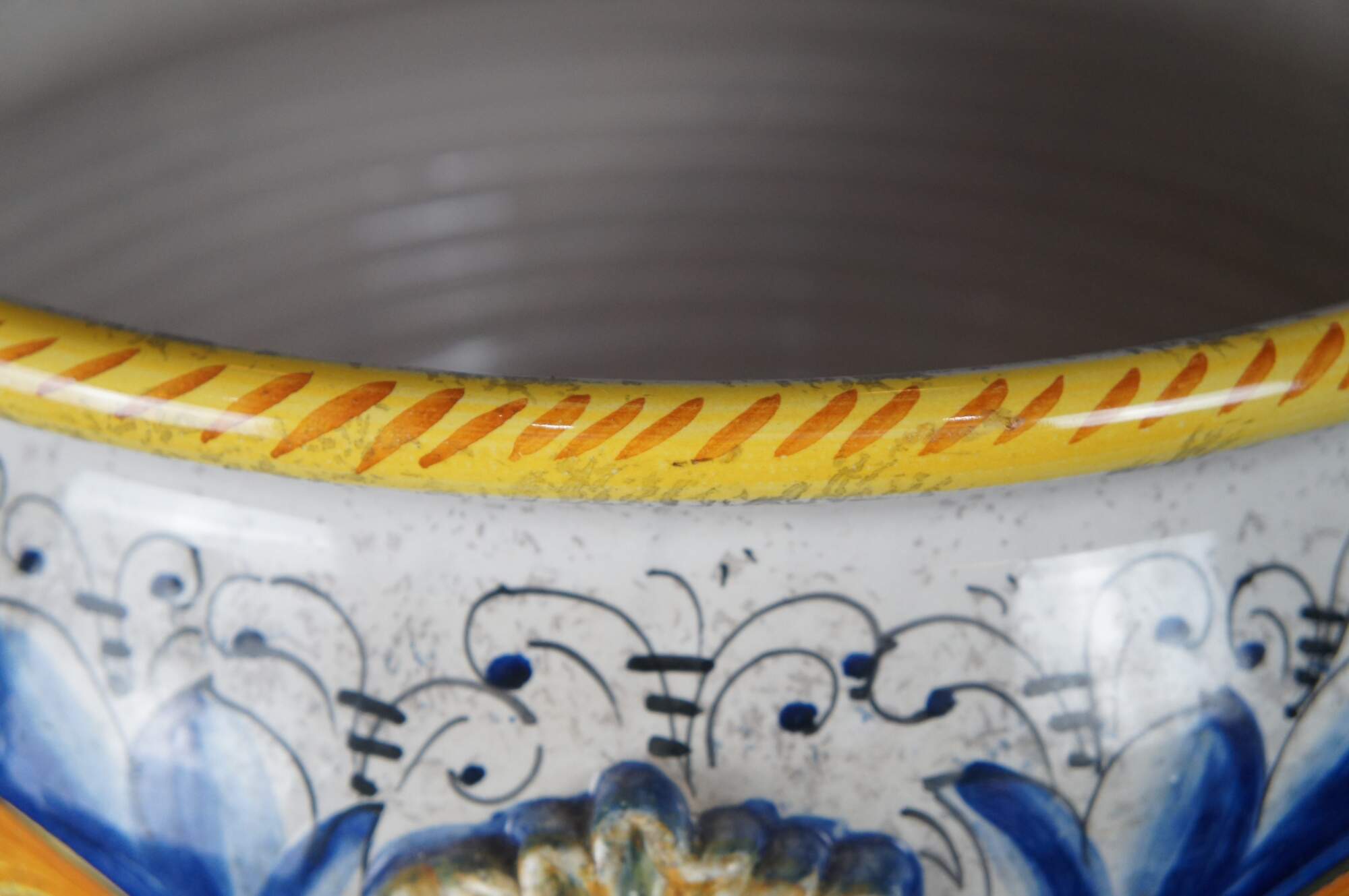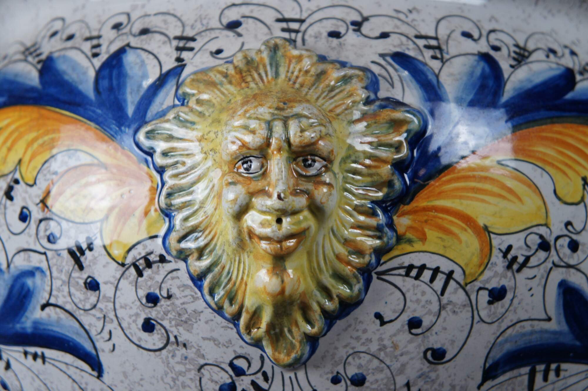 A beautiful 20th century jardiniere by Deruta pottery. Features a polychrome finish with elegant scrolling folitate motifs. The planter has three figural sunfaces along the exterior.