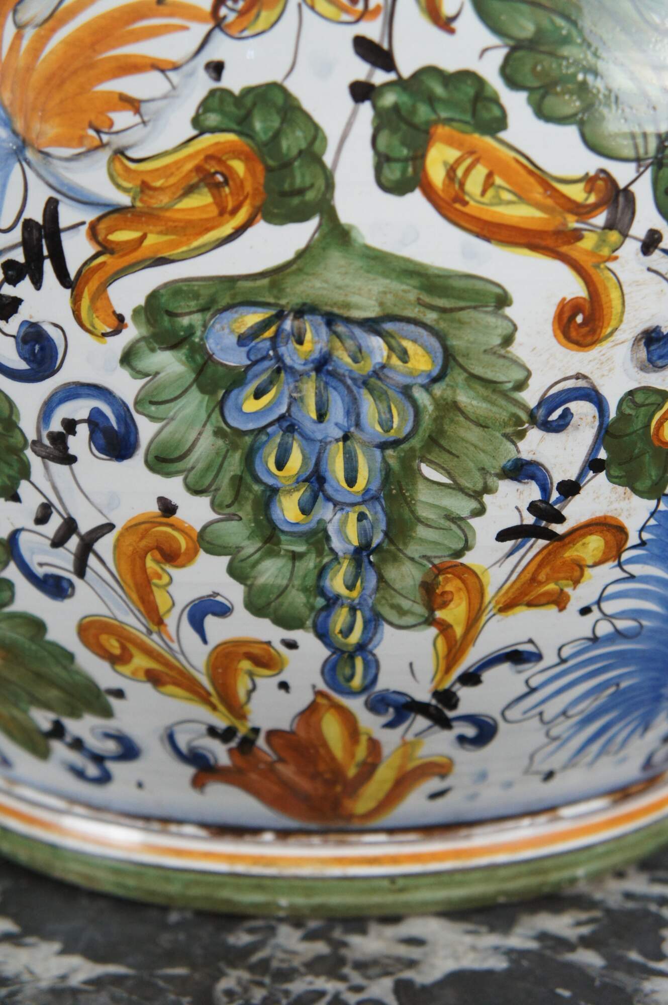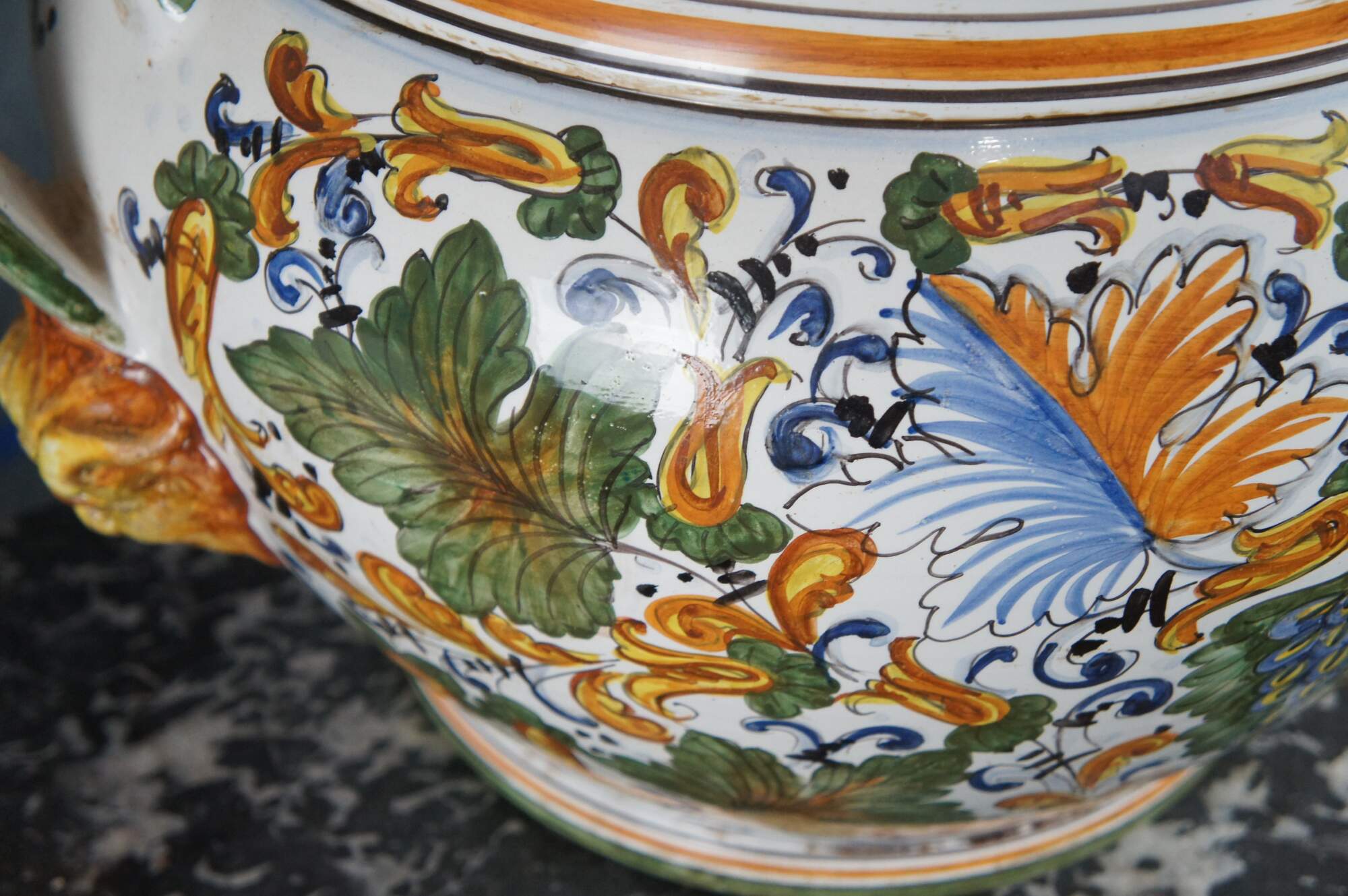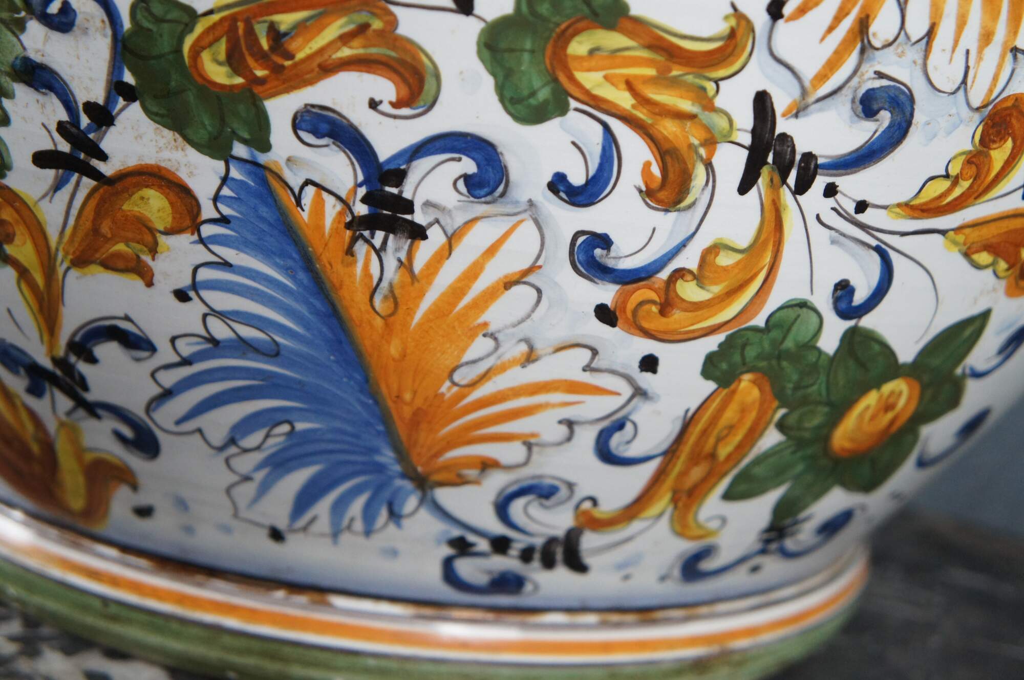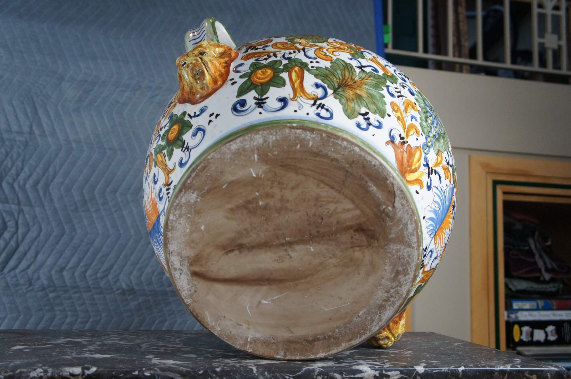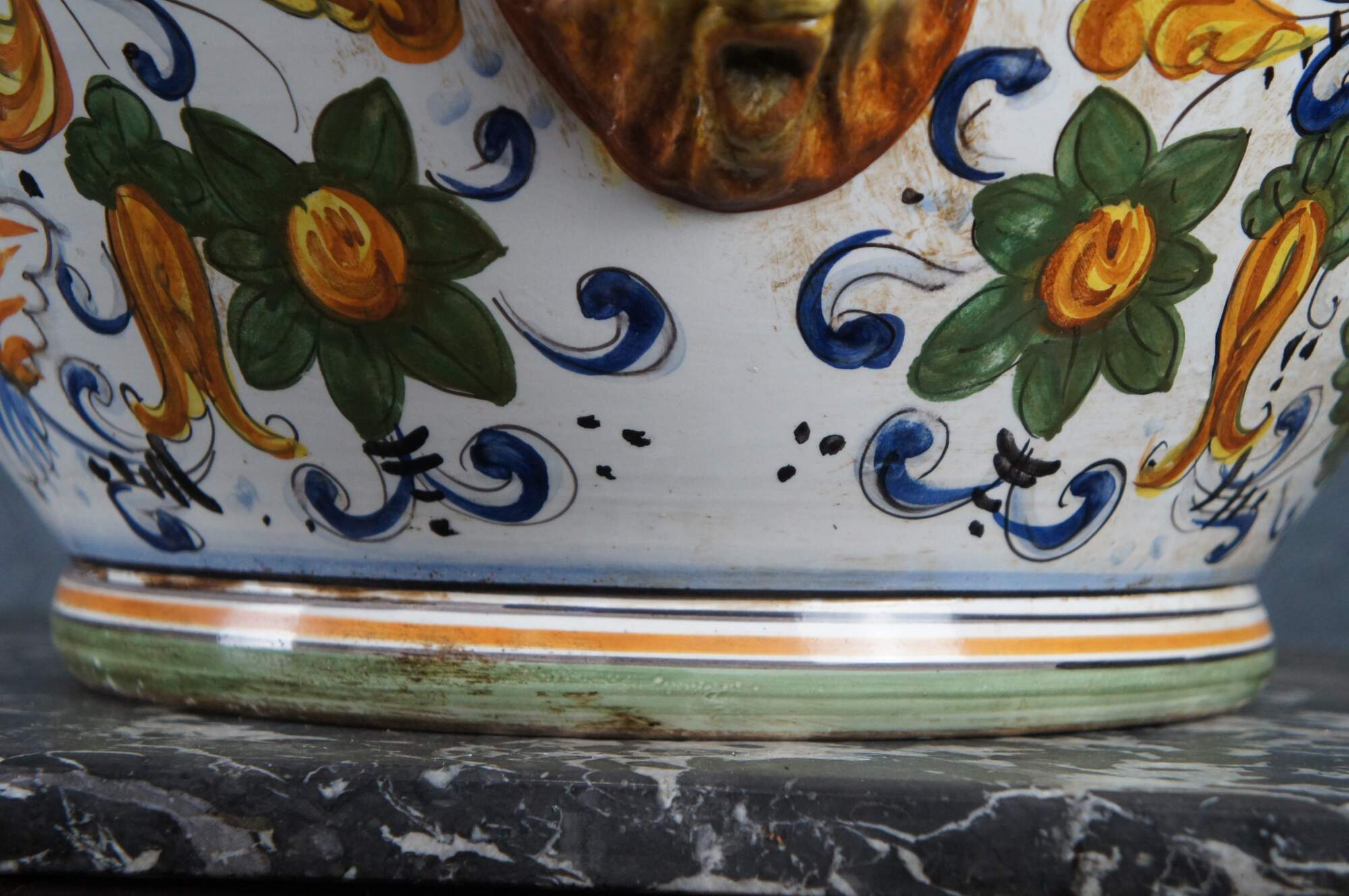 A beautiful 20th century Caffaggiolo jardiniere by Deruta pottery. Features a polychrome finish with elegant scrolling folitate motifs. The planter is handled with figural northwind face beneath. Exceptional craftmanship and color. Made in Italy