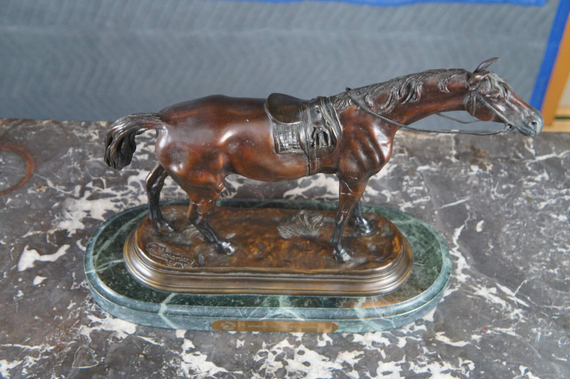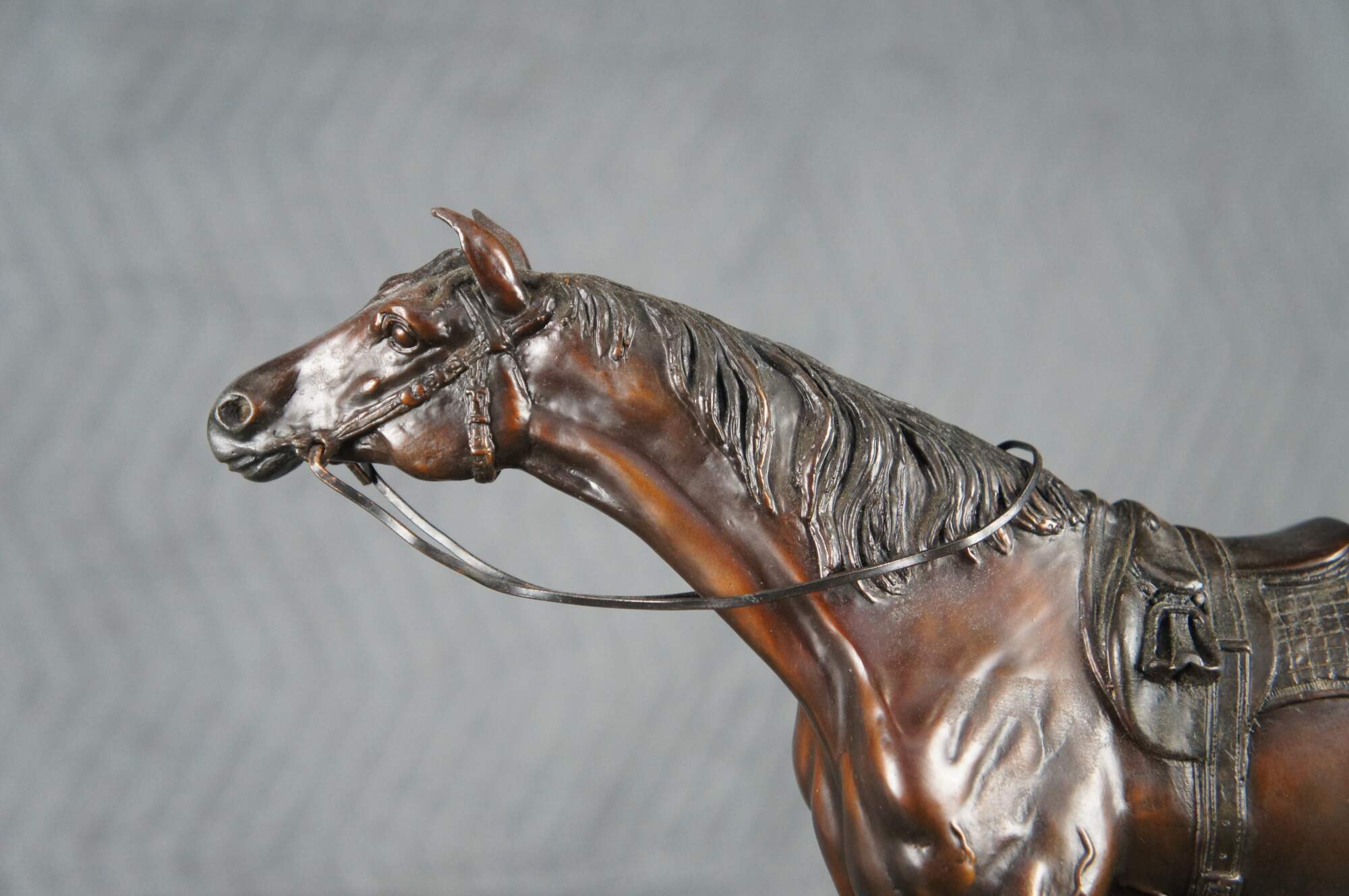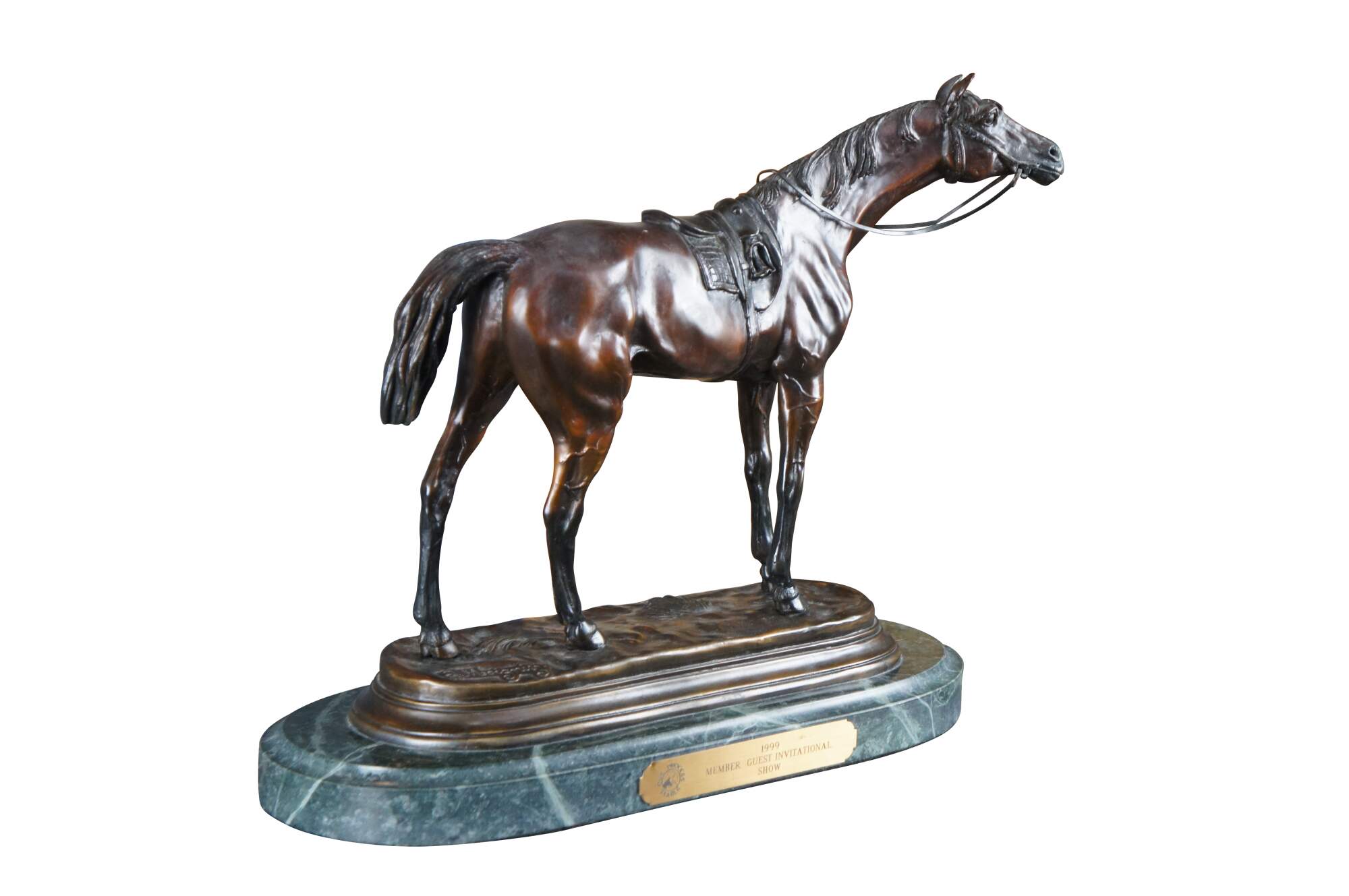 20th Century bronze depicting a saddled race horse. After Jules Moigniez (French, 1835-1894). Signed along the top by the hind legs. The bronze is mounted to a oval green plinth base. Originally used as a trophy for the 1999 Member Guest Invitational at Due Process Stables. The plaque is removable.