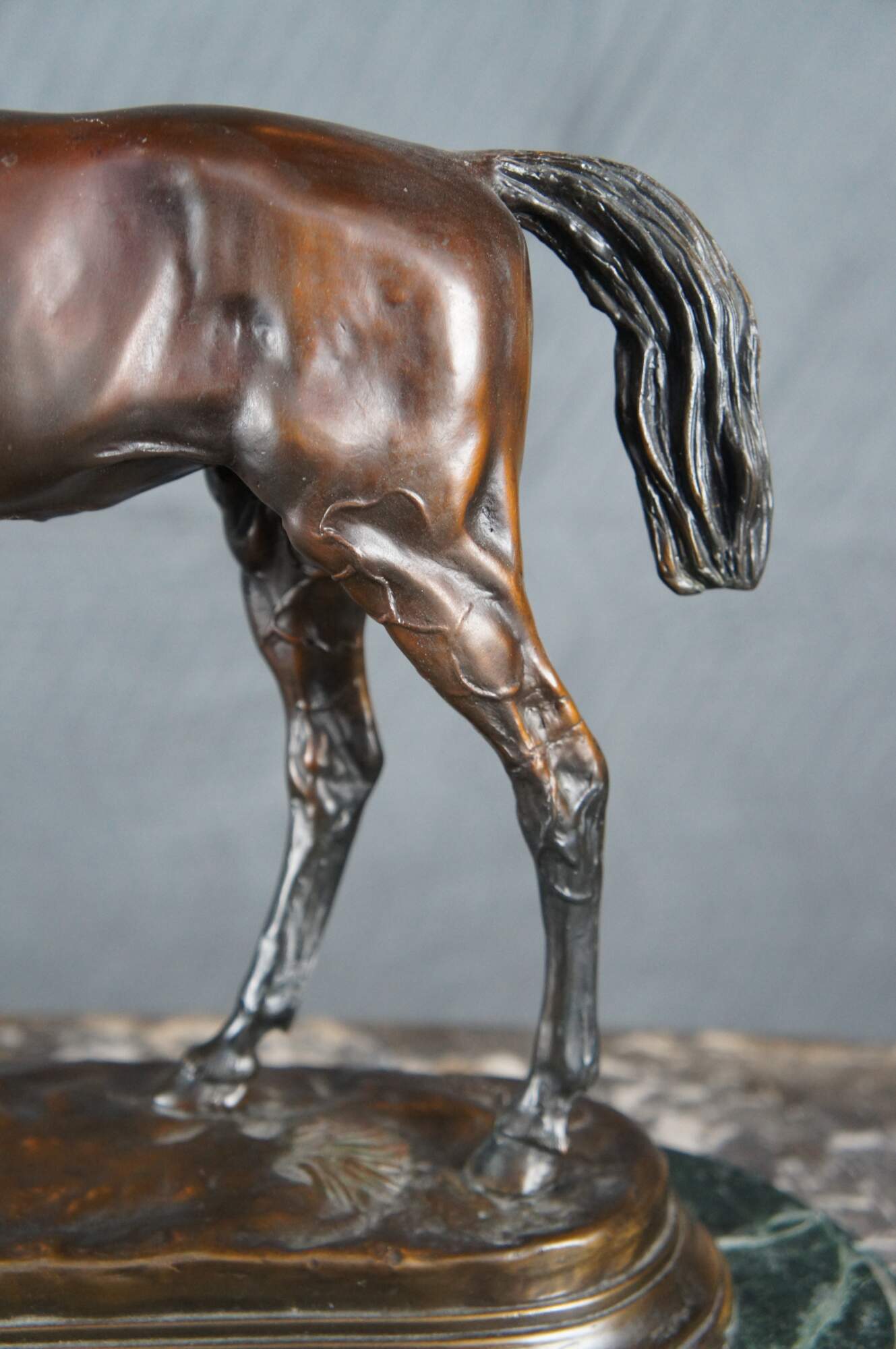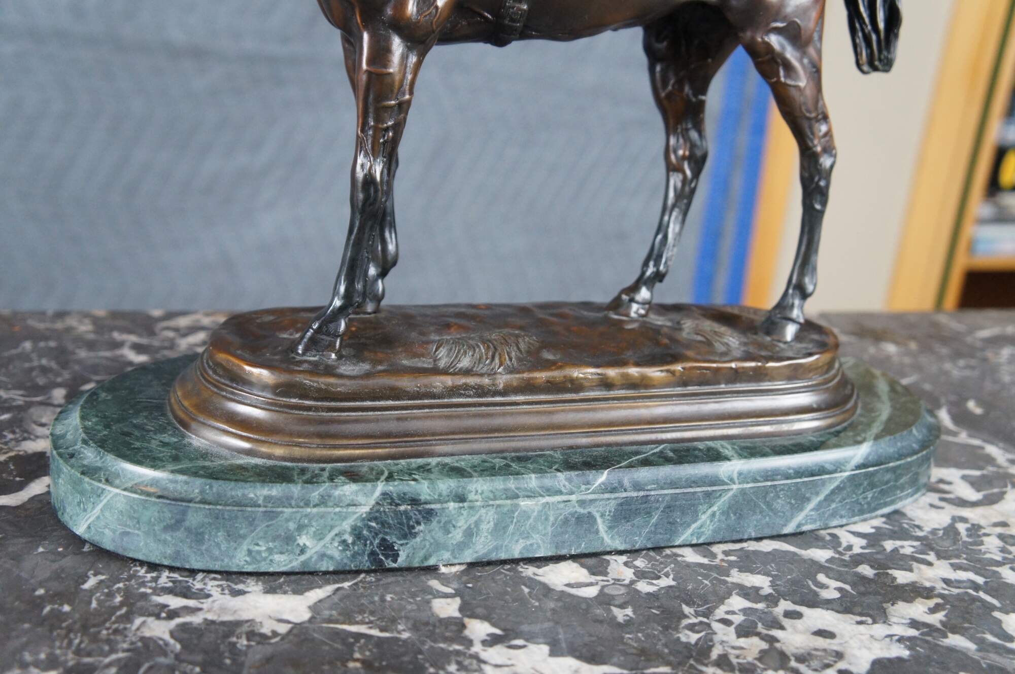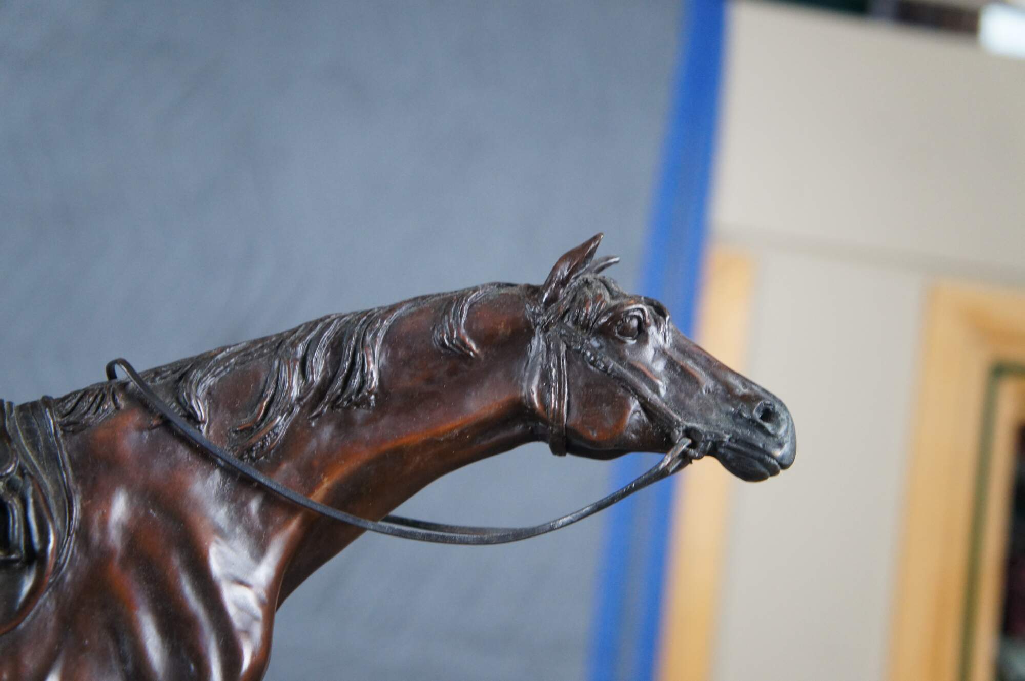 20th Century bronze depicting a saddled race horse. After Jules Moigniez (French, 1835-1894). Signed along the top by the hind legs. The bronze is mounted to a oval green plinth base. Originally used as a trophy for the 1999 Member Guest Invitational at Due Process Stables. The plaque is removable.