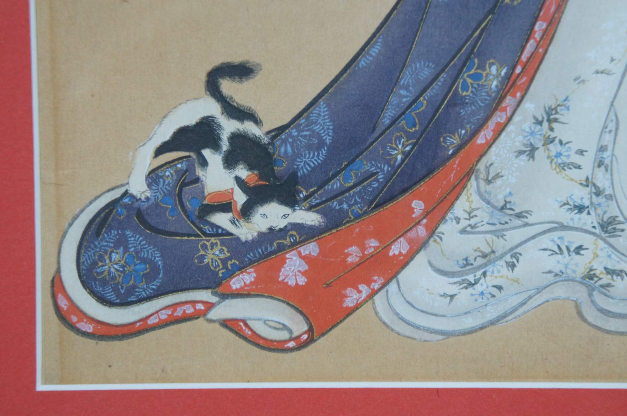 Antique late 18th century edo ukiyo-e style Japanese woodblock print titled "A Beauty with a Cat" by Katsukawa Shunsho. Shows an elegant geisha gazing down at the black and white cat playing on the edge of her kimono. Matte black painted wood frame; red mat.