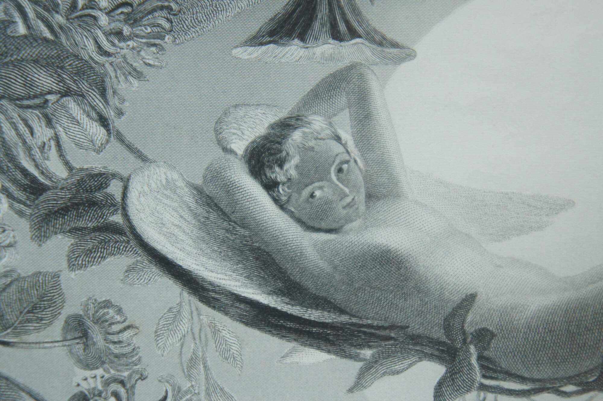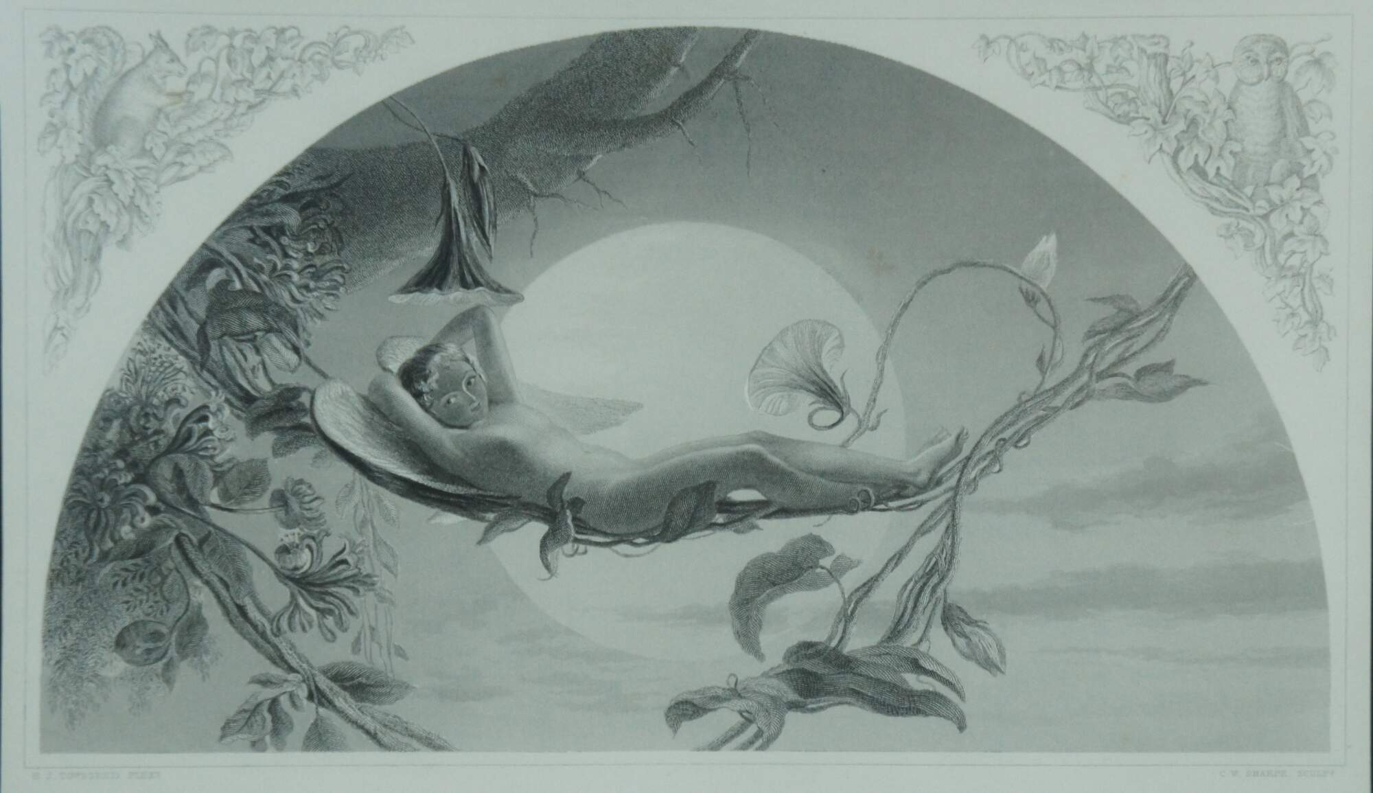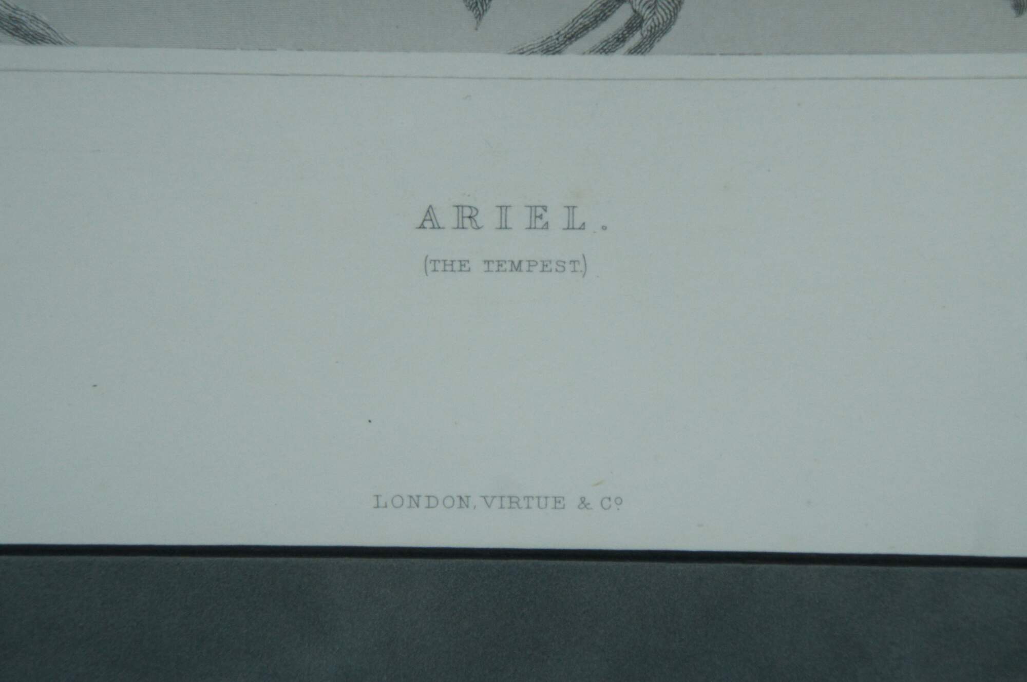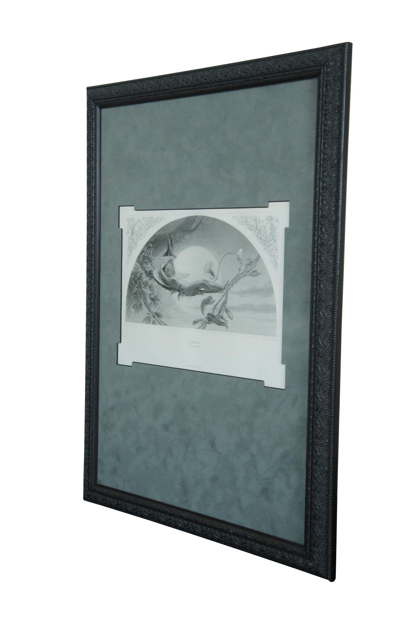Antique 1873 engraving of "Ariel (from Shakespeare) The Tempest" by Henry James Townsend, engraved by C.W. Sharpe, published by Virtue & Co, London. Beaded and foliate carved frame; blue-green mat.
