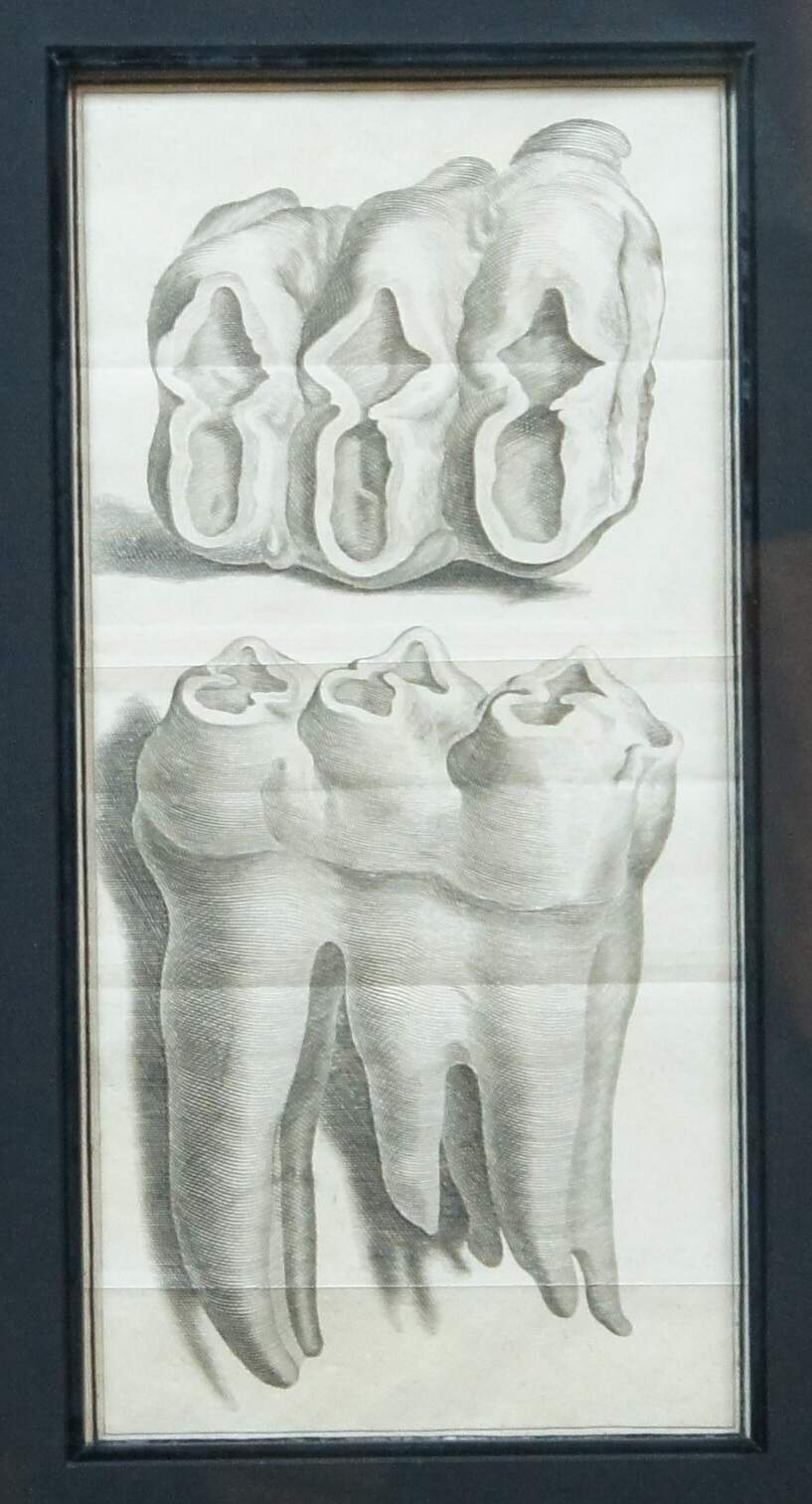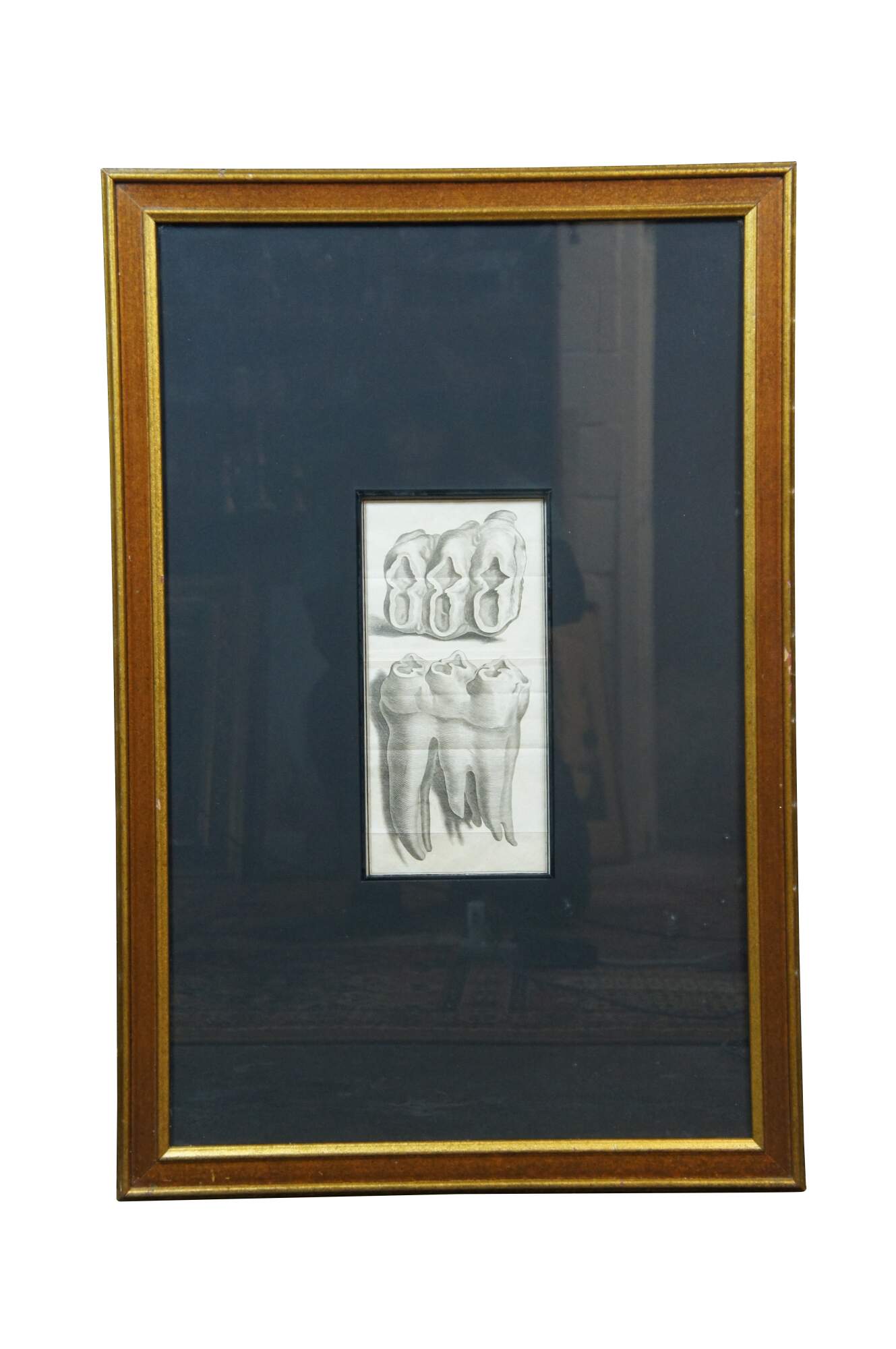 Pair of rare antique 18th century Jacques de Sève dental / Zoology / anatomy etchings / engravings of a Mastodon / Mammut tooth, front and top views / elevations. One marked as Plate 8 Original circa 1700-1880. Giltwood frame with raised bevel edge; black mat.