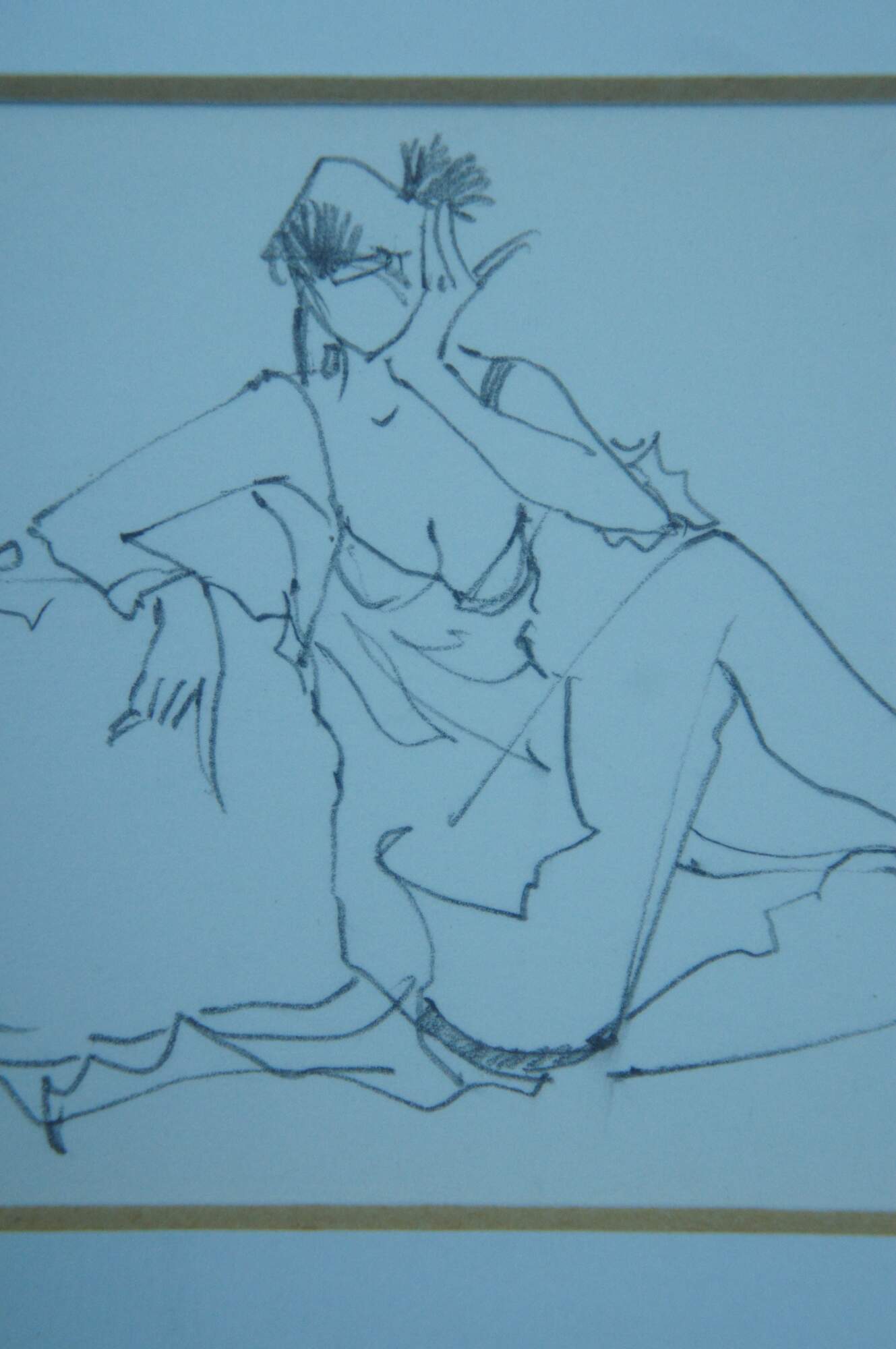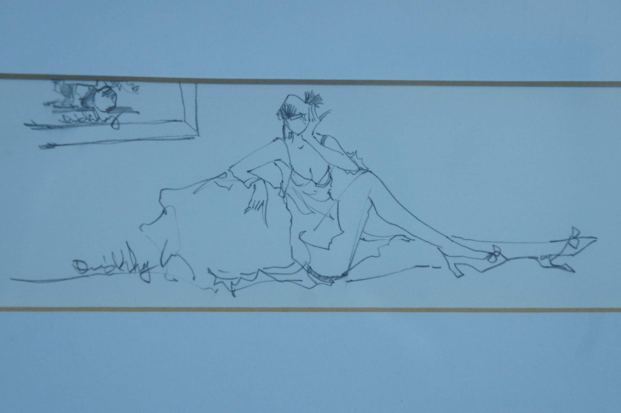Late 20th century framed diptych featuring a print showing a female figure leaning over a dining table and smiling coqutteishly over her shoulder, and a single line style pencil drawing of a female figure in high heels lounging on the floor. Print signed in gold marker, lower right and twice on the sketch. Giltwood frame with raised bevel; white mat.