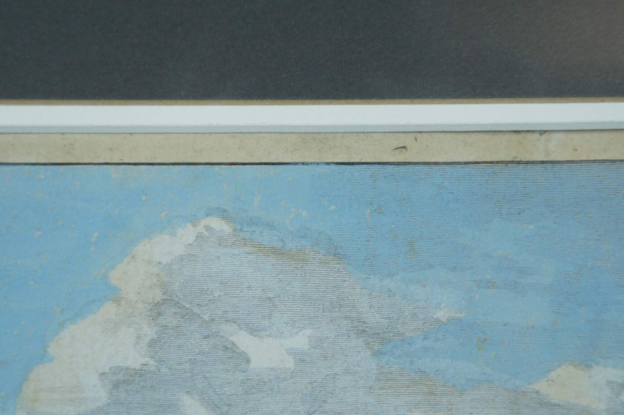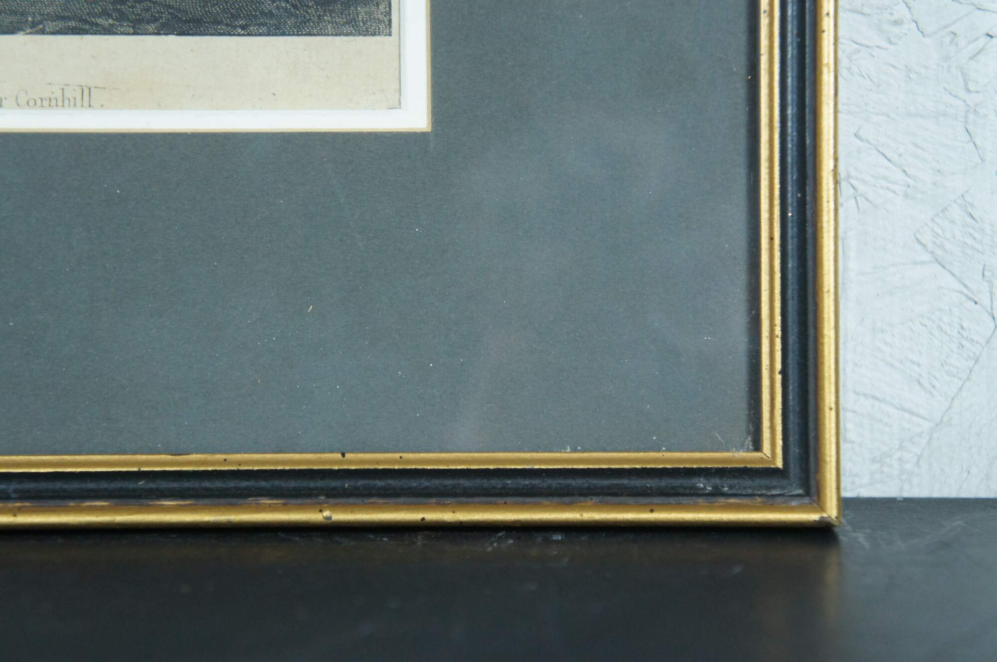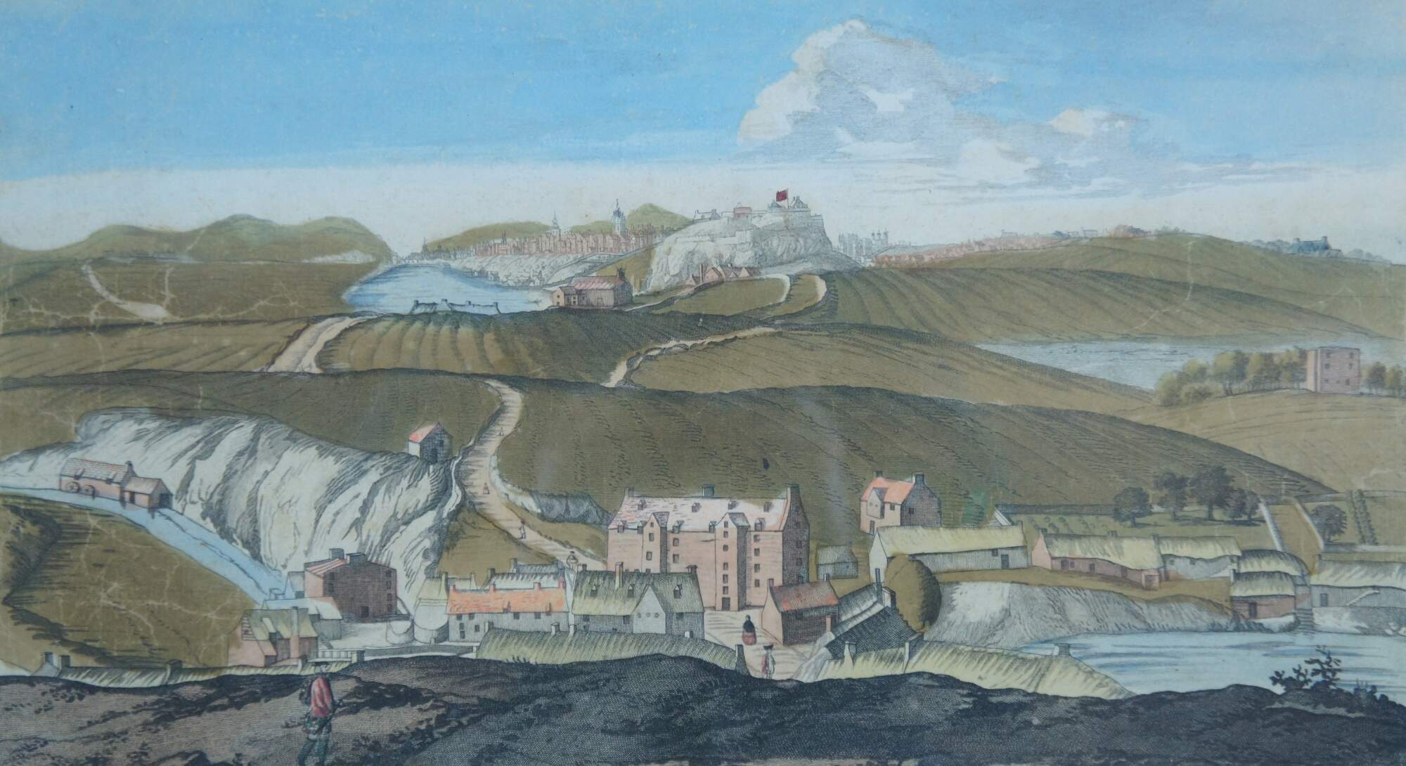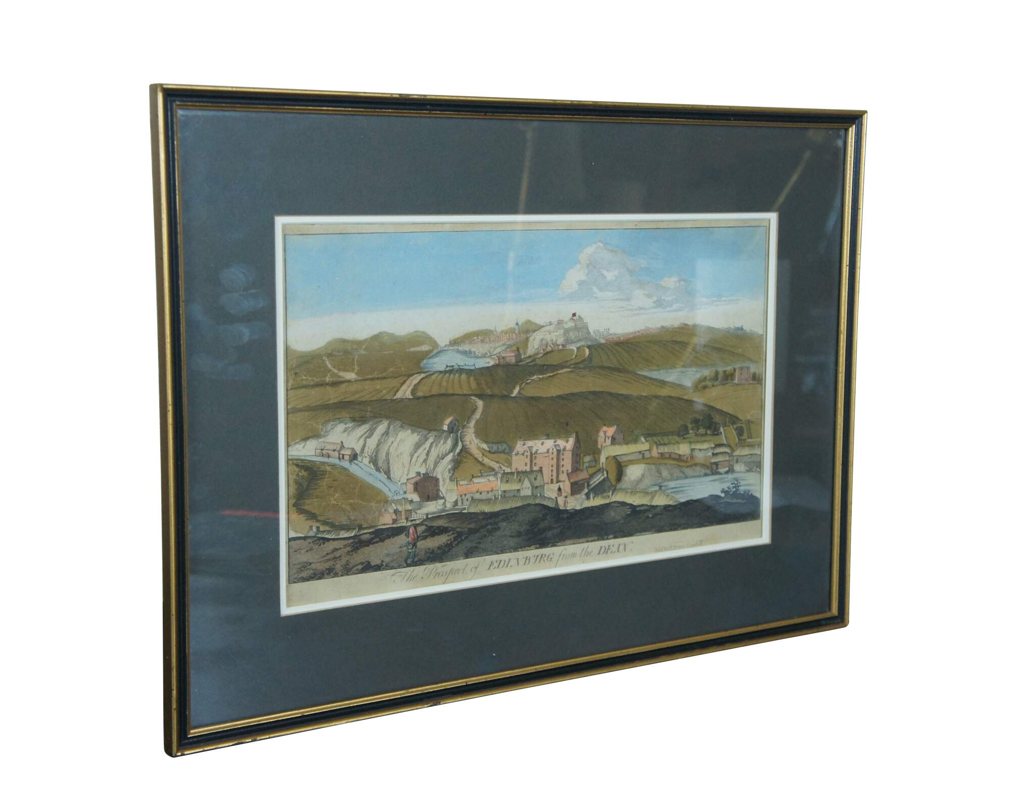 Antique German 17th century hand colored engraving titled "The Prospect of Edinburg from the Dean," by John Slezer, sold by H. Bryer, Cornhill. Giltwood frame with black painted bevel; gray mat. Shows "(t)he opposite view from ‘The Southside of the Castle of Edinburgh', seen from the Village of Dean, which is now part of Edinburgh. Left of the castle is a row of steeples - St Giles' Cathedral, the Tron Church, the Netherbow Port, the Tolbooth, and the Chapel Royal of the Palace of Holyroodhouse. Below the city is North (or 'Nor') Loch, with St Cuthbert's Church to the right. Edinburgh's extinct volcano, Arthur's Seat, is faintly visible behind the city spires, whilst to the left is Calton Hill. Heriot's Hospital is to the right of the castle mound. Image from Theatrum Scotiae by John Slezer, 1693." (Source: National Library of Scotland)