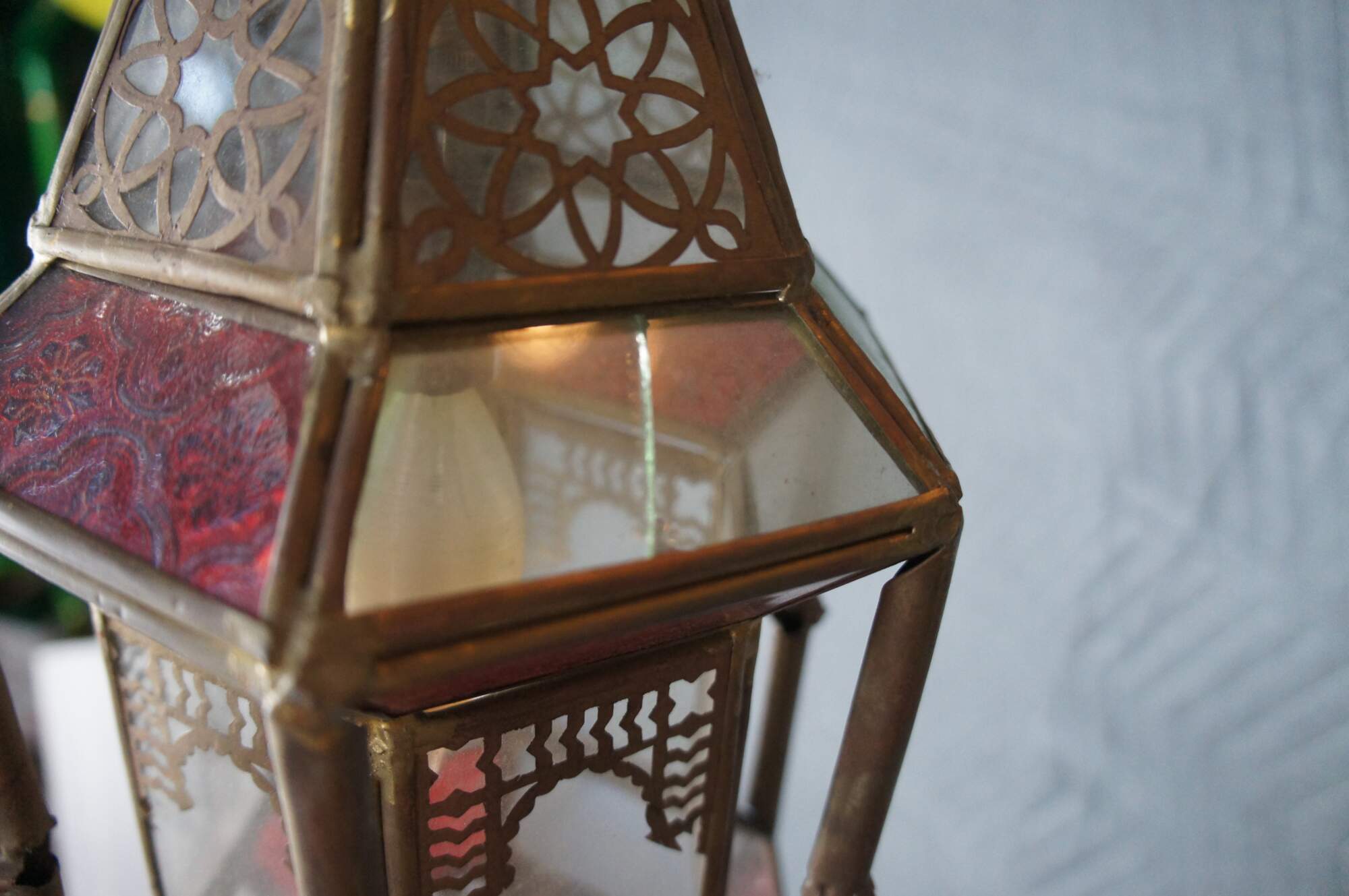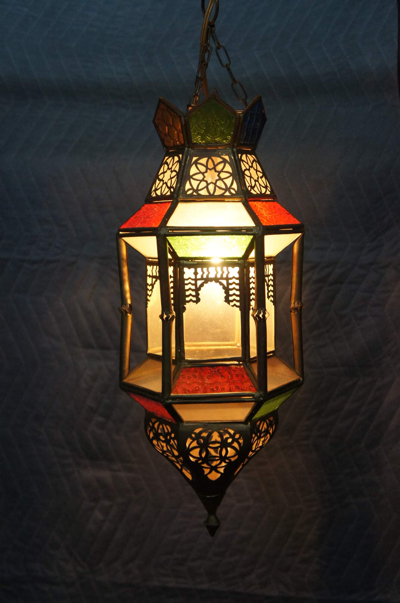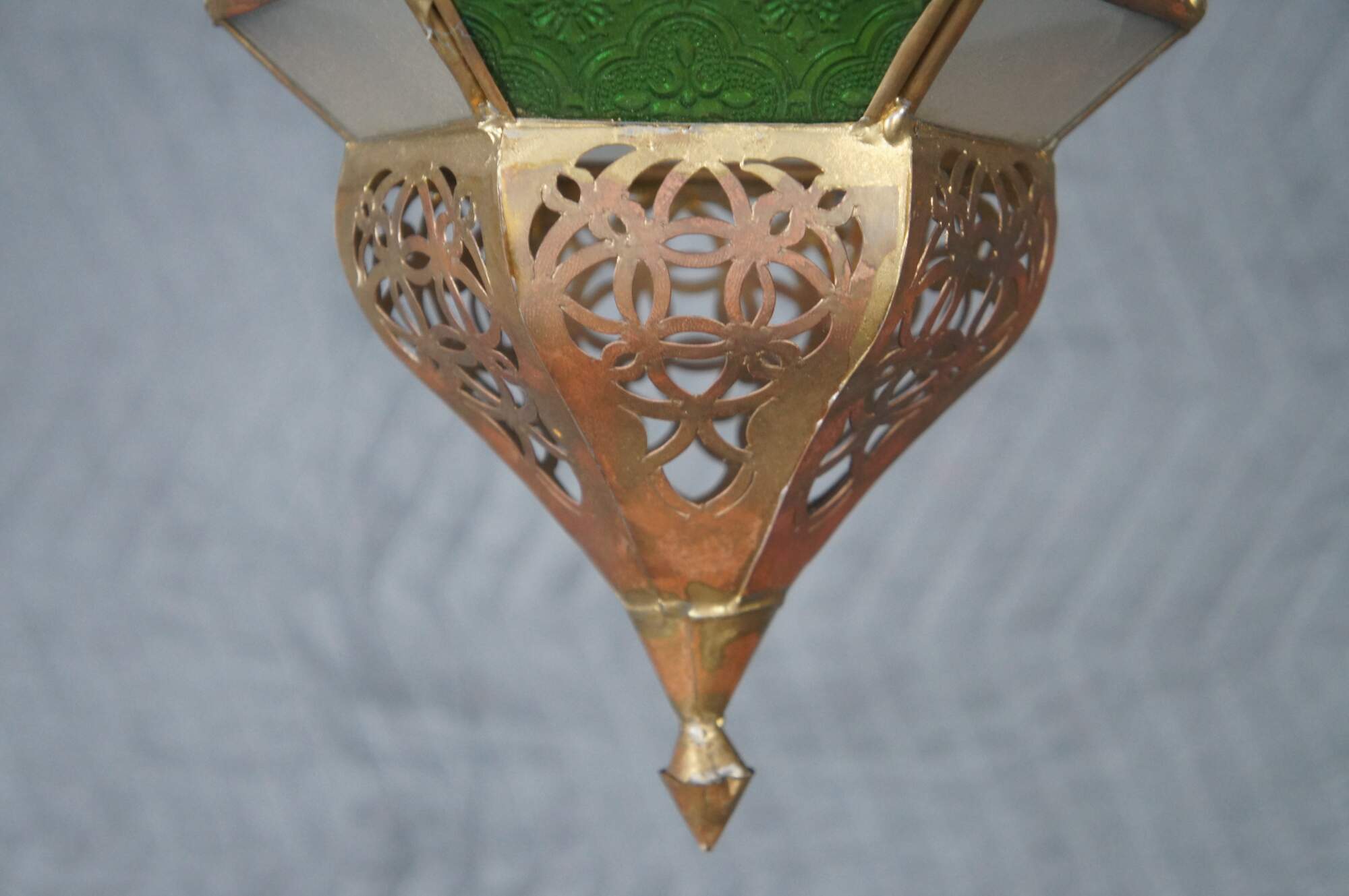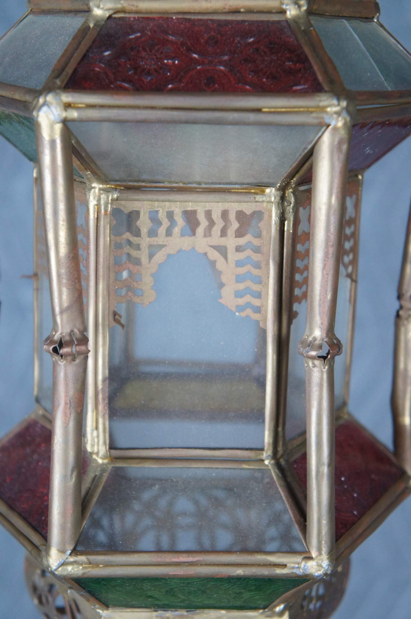 Late 20th Century Moroccan / Moorish Lantern. Made from brass with pierced / reticulated panels and colofrul slag glass. A nice pendant or swag lamp for any setting.
