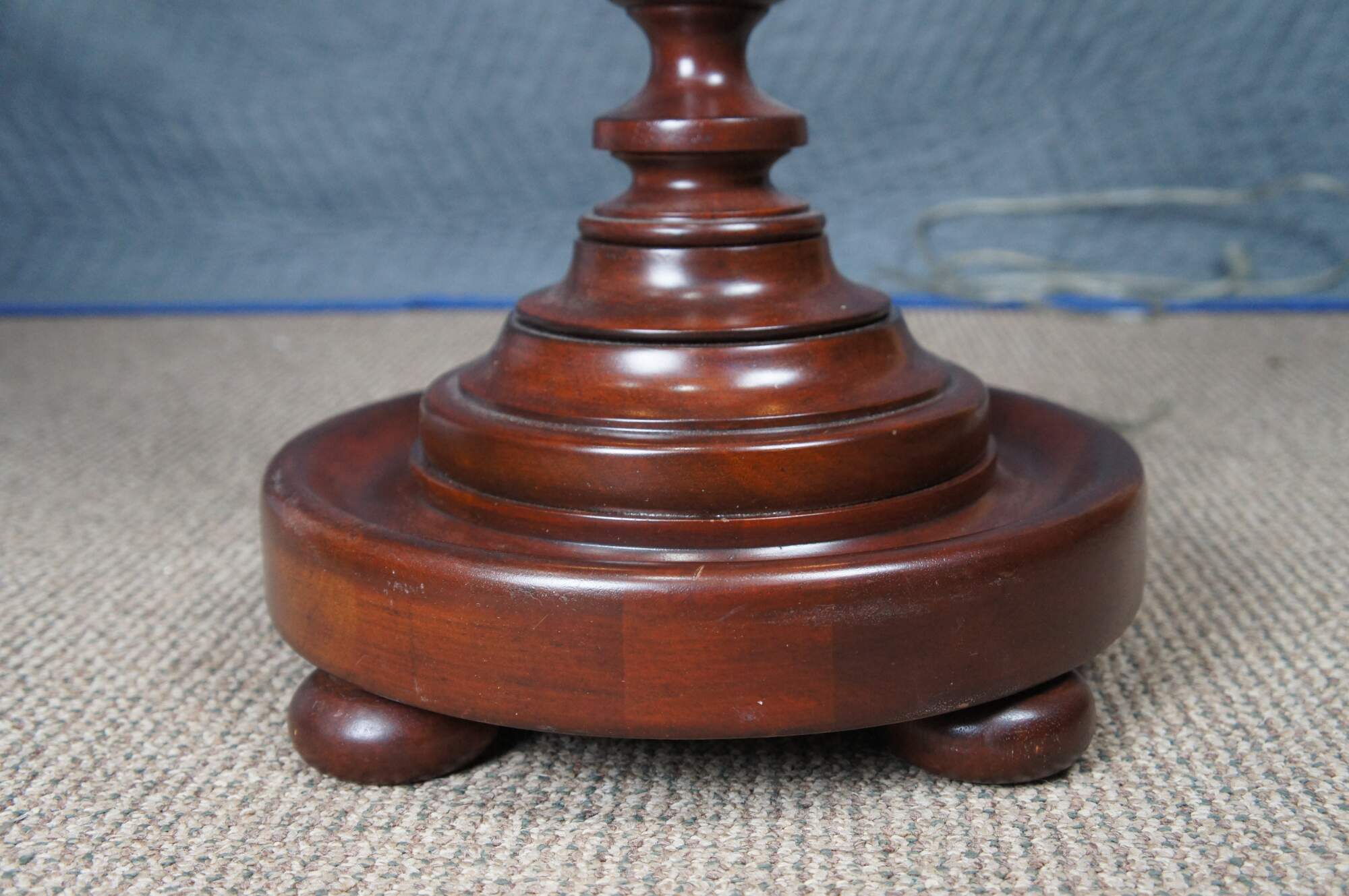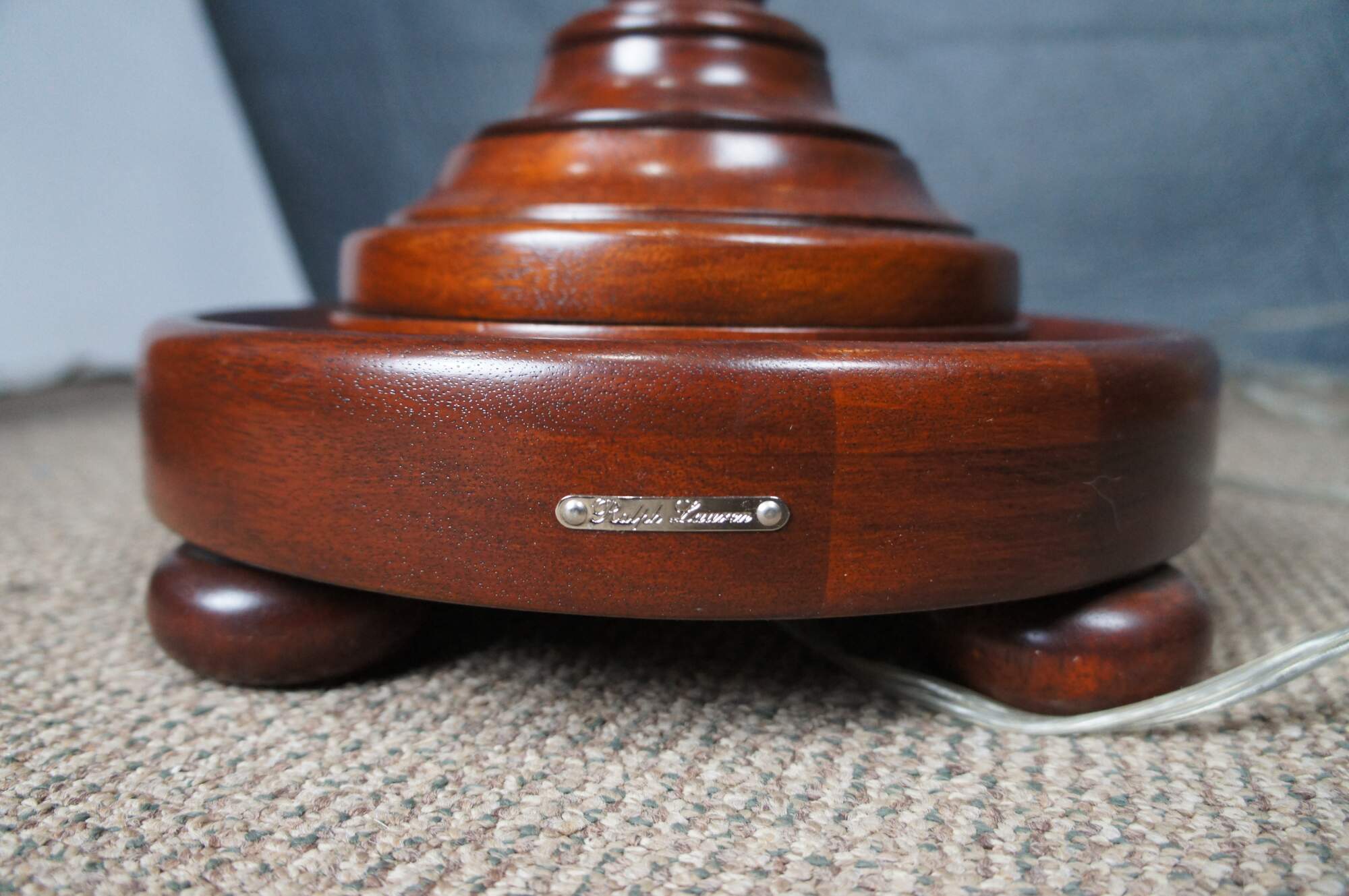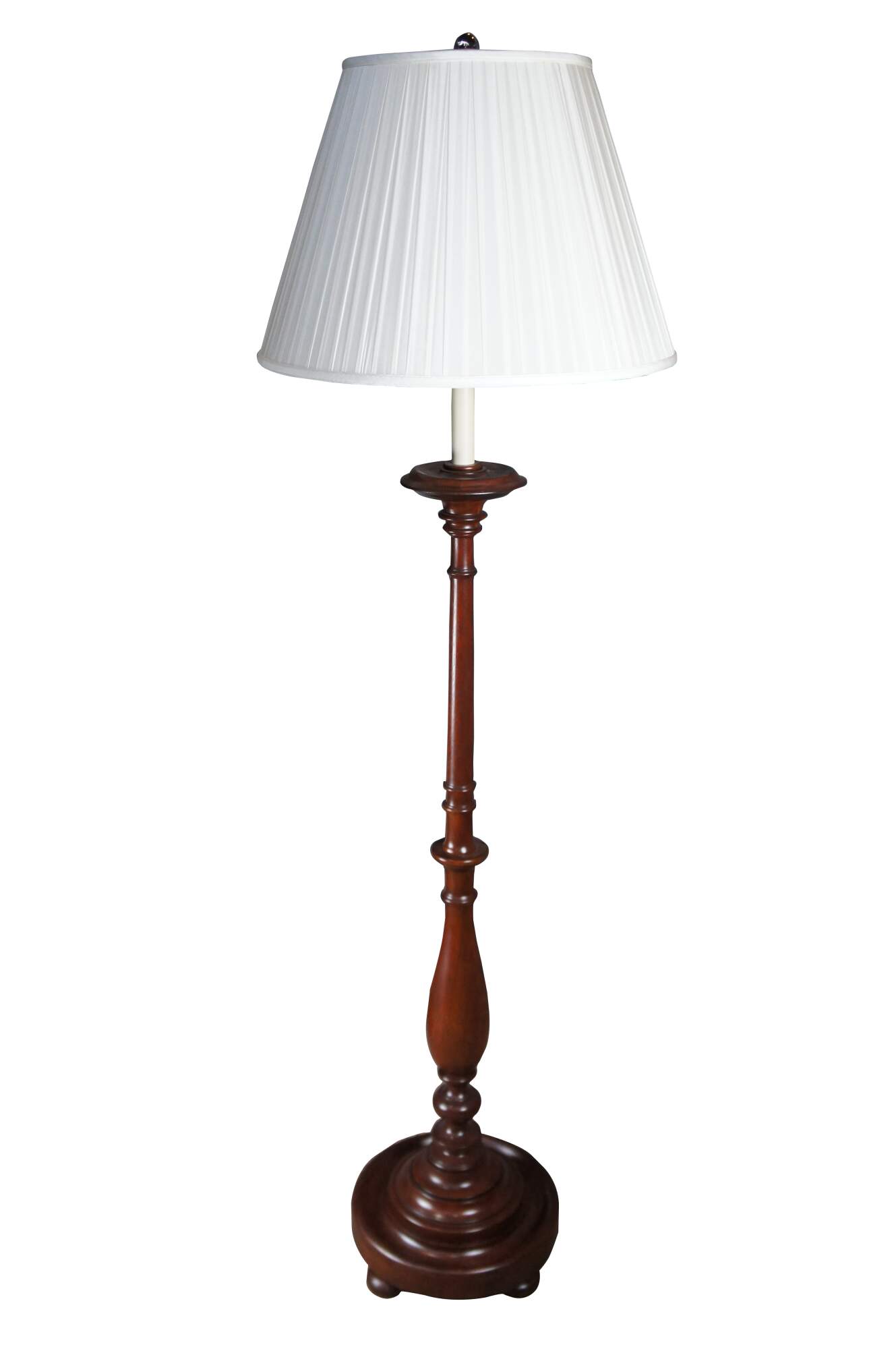 A traditional rich brown mahogany floor lamp by Ralph Lauren. The lamp is in the form of a large Early American / Colonial candle stand with candlestick center and adjustable harp allowing the shade to be raised / lowered. Features a baluster turned center over a round base with bun feet. The Harp is Chrome and the shade is pleated silk. A timeless classic that will make a warm addition to any space.